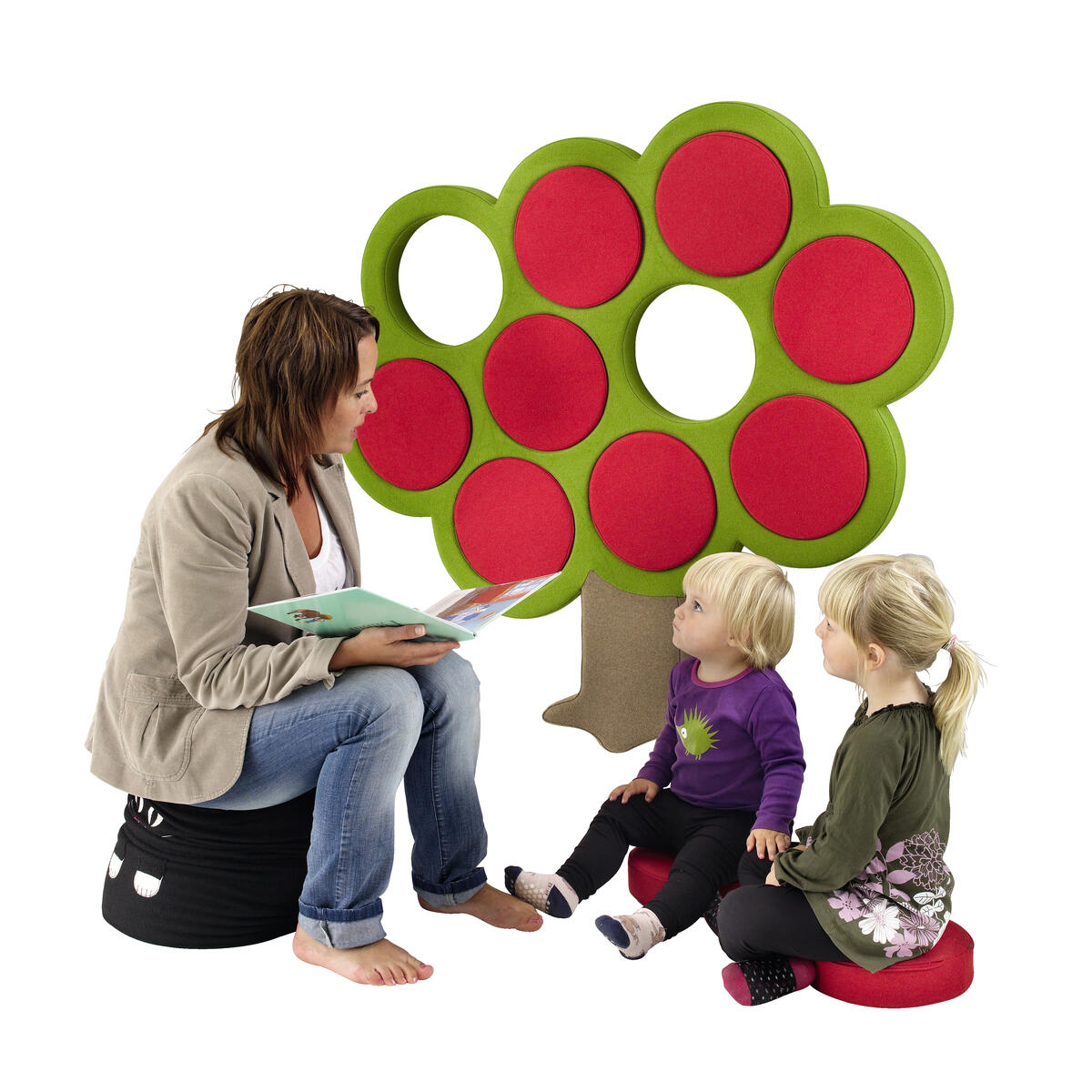 Äppelträd med 10 st sittdynor. Väggdekoration som hängs på väggen och fungerar som ljudabsorbent. Barnen kan själva plocka äpplena. Äpplena kan sedan användas som sittkuddar vid samlingar etc. Mått: Träd 125x125 cm. Mått på sittkudde: ø 25 cm, tjocklek 6 cm. Tyg på sittkudde avtagbart och tvättbart i 30 °C.