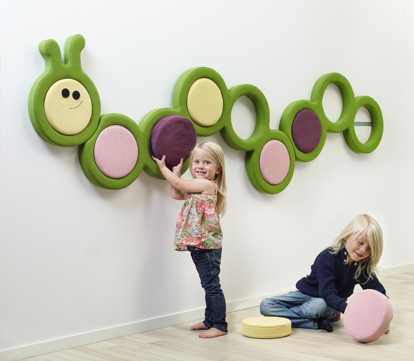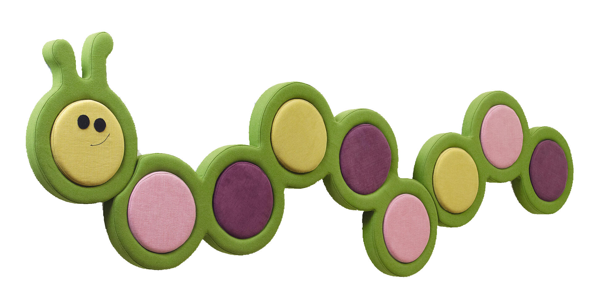 Larven med 6 sittdynor. Väggdekoration som även fungerar som ljudabsorbent. Ur larvens kropp kan barnen själva plocka sina sittdynor. Larven består av olika delar som kan monteras så att den ringlar sig upp och ner på väggen i olika former. Mått på sittkudde: ø 25 cm, tjocklek 6 cm. Tyg på sittkudde är avtagbart och tvättbart i 30 °C.