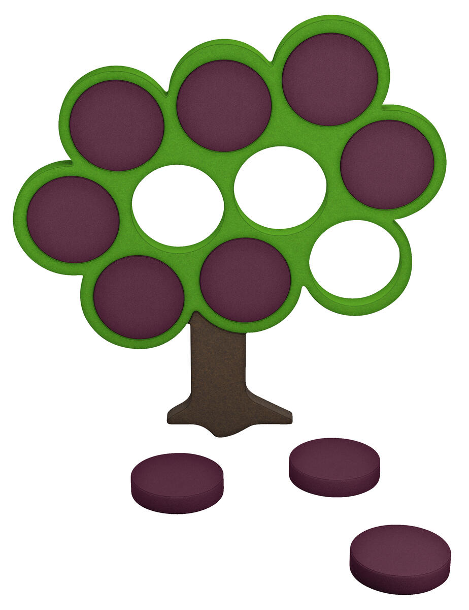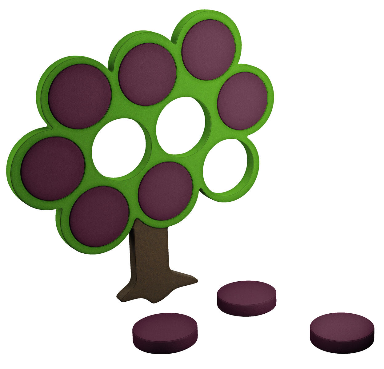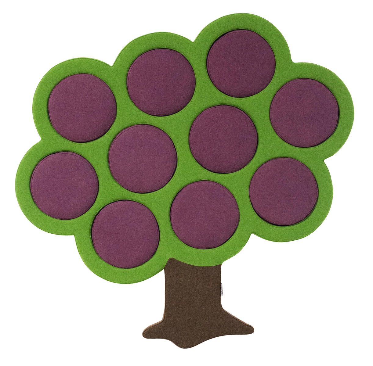 Plommonträd med 10 st sittdynor. Väggdekoration som hängs på väggen och fungerar som ljudabsorbent. Barnen kan själva plocka plommon. Plommonen används som sittkuddar vid samling. Mått: Träd 125x125 cm. Mått på sittkudde: ø 25 cm, tjocklek 6 cm. Tyg på sittkudde avtagbart och tvättbart i 30 °C.
