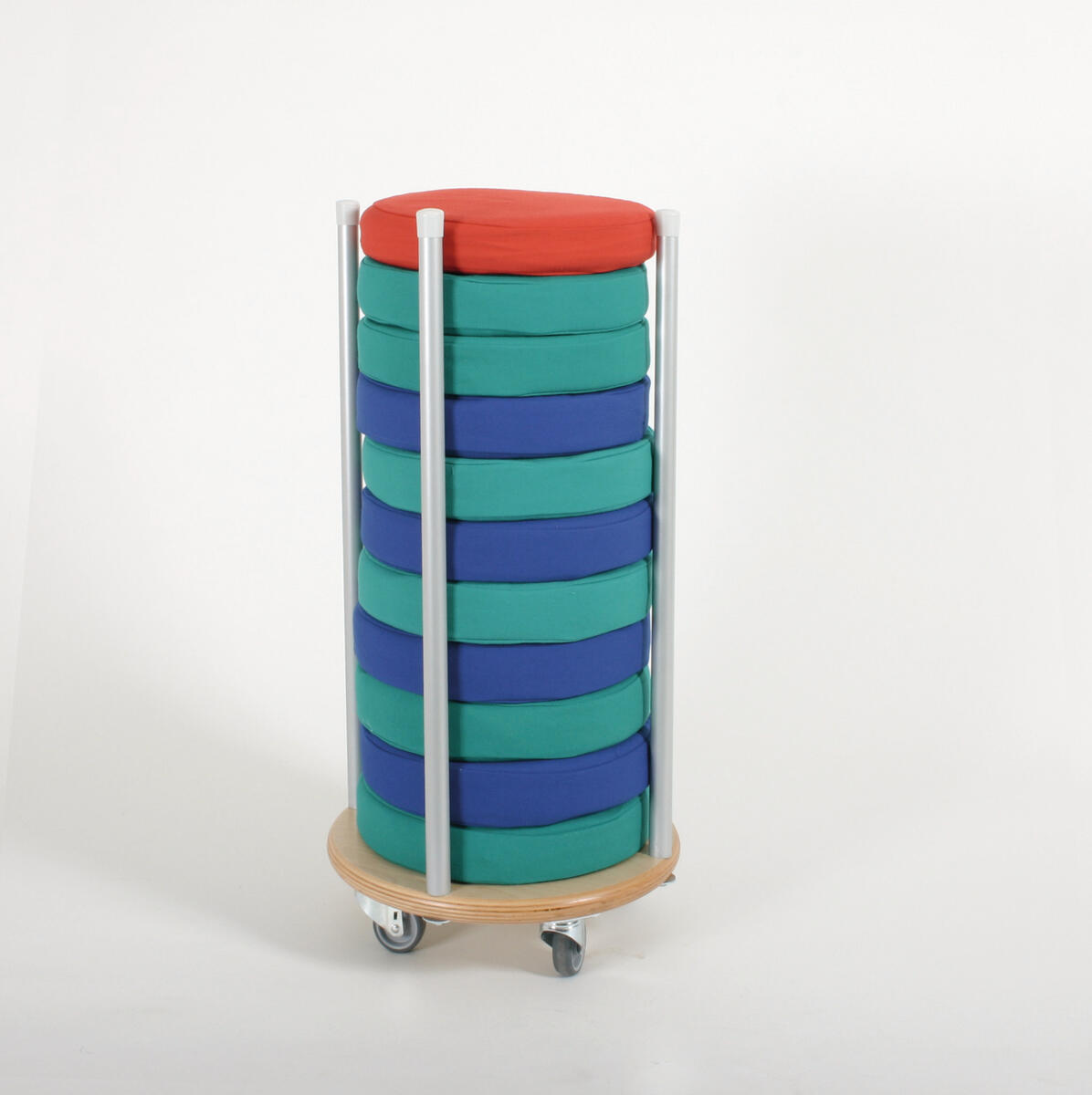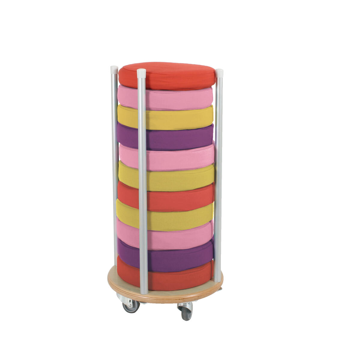 Mått: ø 25 cm, tjocklek 6 cm. Sittkudde i 10-pack med förvaringspåse. Fylld förvaringspåse blir en stor kudde. Passar till träd, larven, nyckelpiga och 3 i rad. Välj nummer för färg eller mix. Mix innehåller 3 röda. 3 rosa, 2 lila och 2 gula kuddar. Tyg på sittkudde är avtagbart och tvättbart i 30 °C.