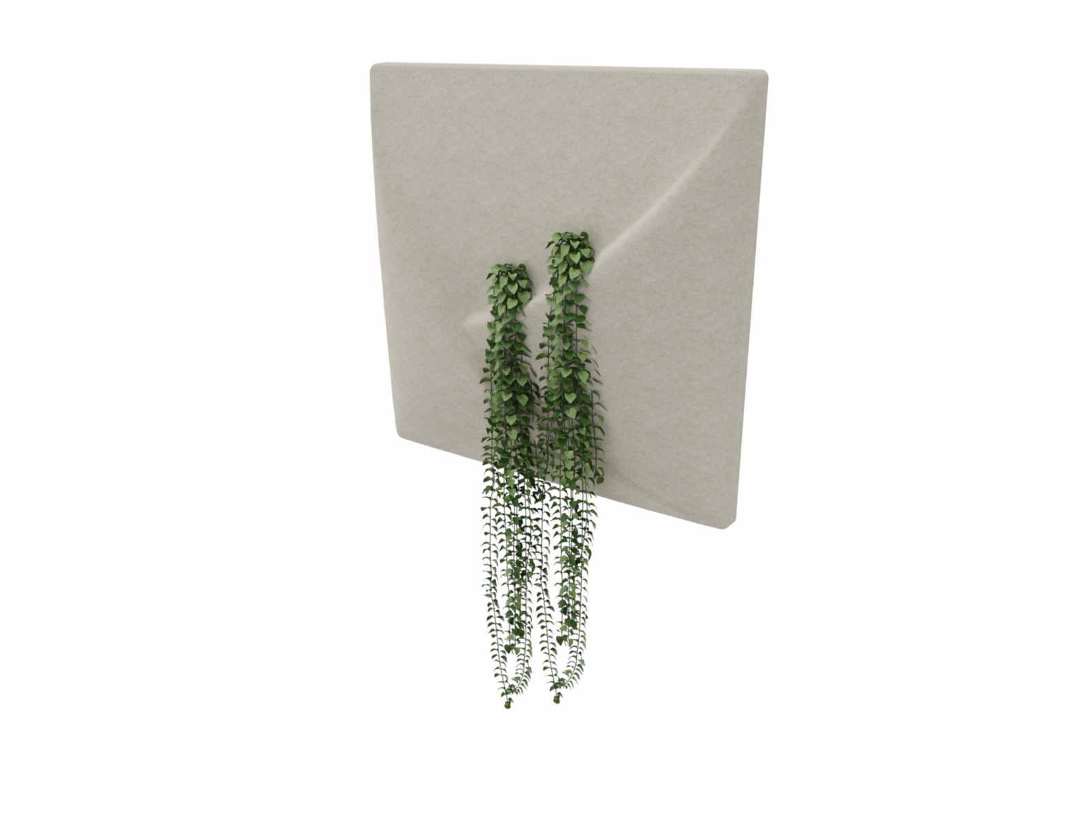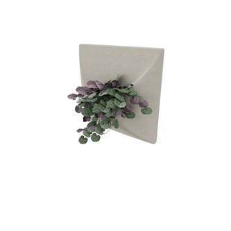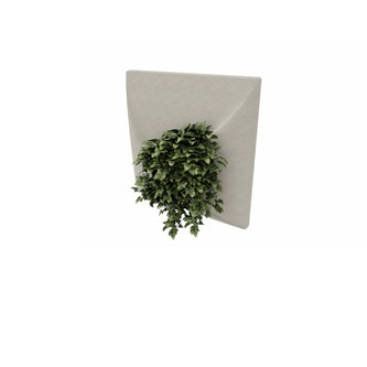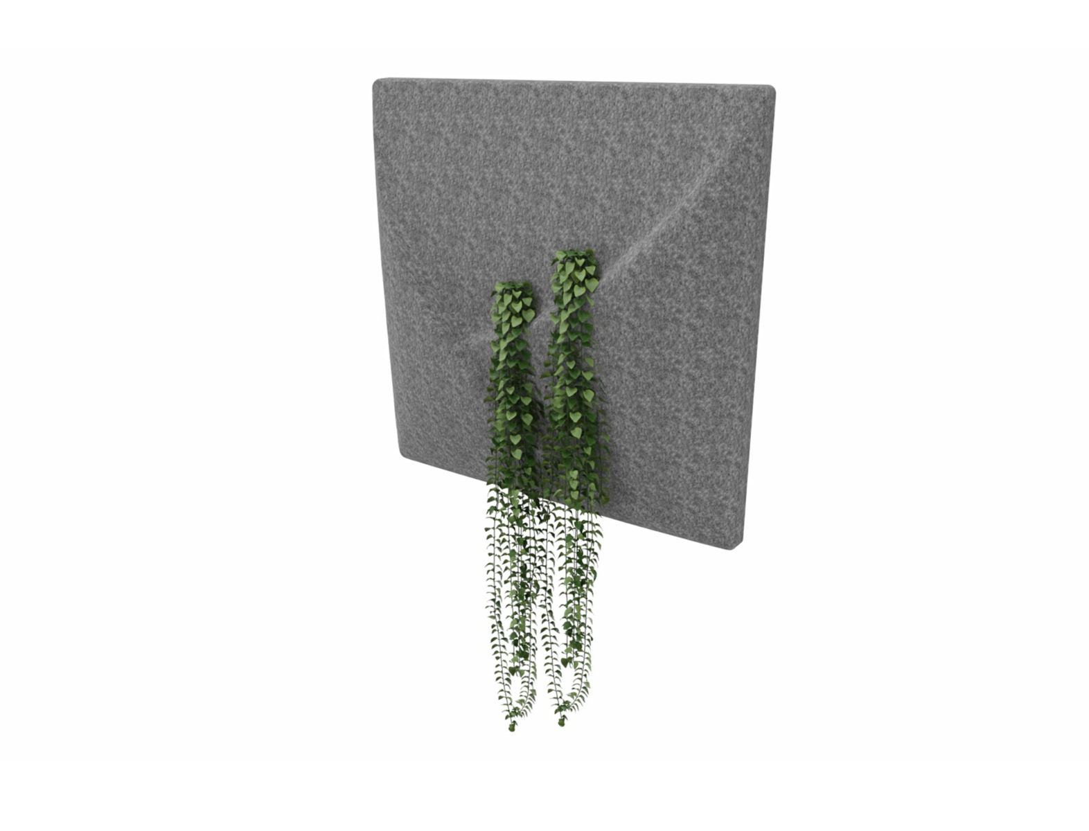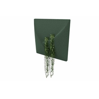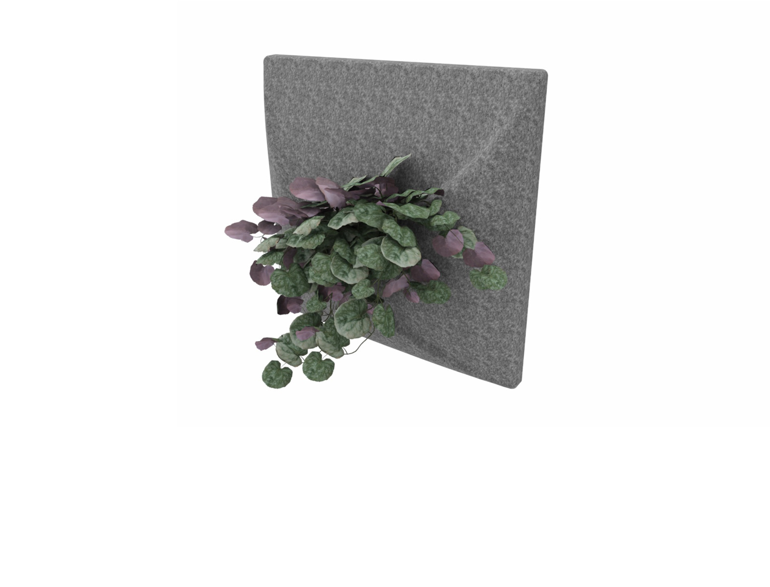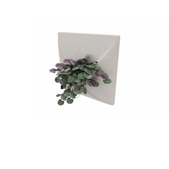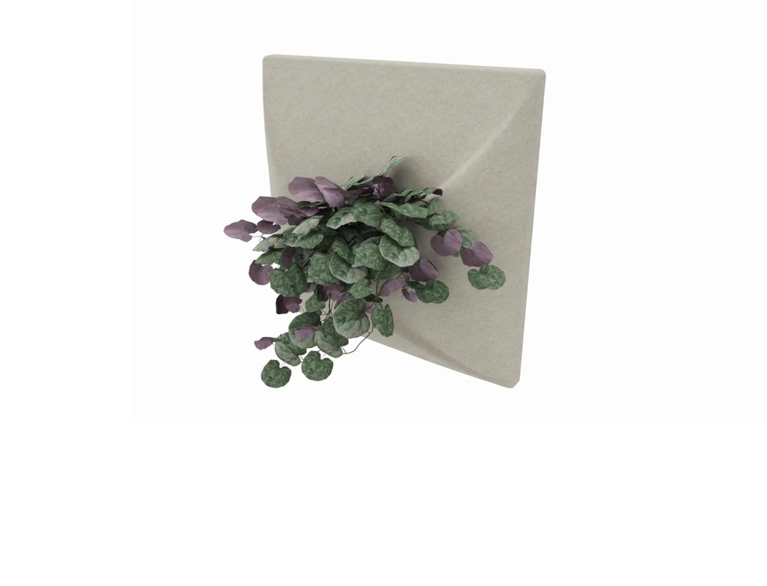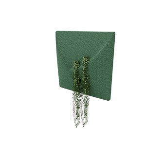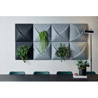 Väggdekoration i formpressad filt i minst 55 % återvunnen PET. EcoSUND-platta monterad bakom panelen för 30 % bättre ljudabsorption. Det böljande mönstret skapar en häftig visuell effekt. Växterna levereras utan kruka, stjälken placeras i de förstansade hålen. Monteras på vägg med list, upphängningslist ingår.