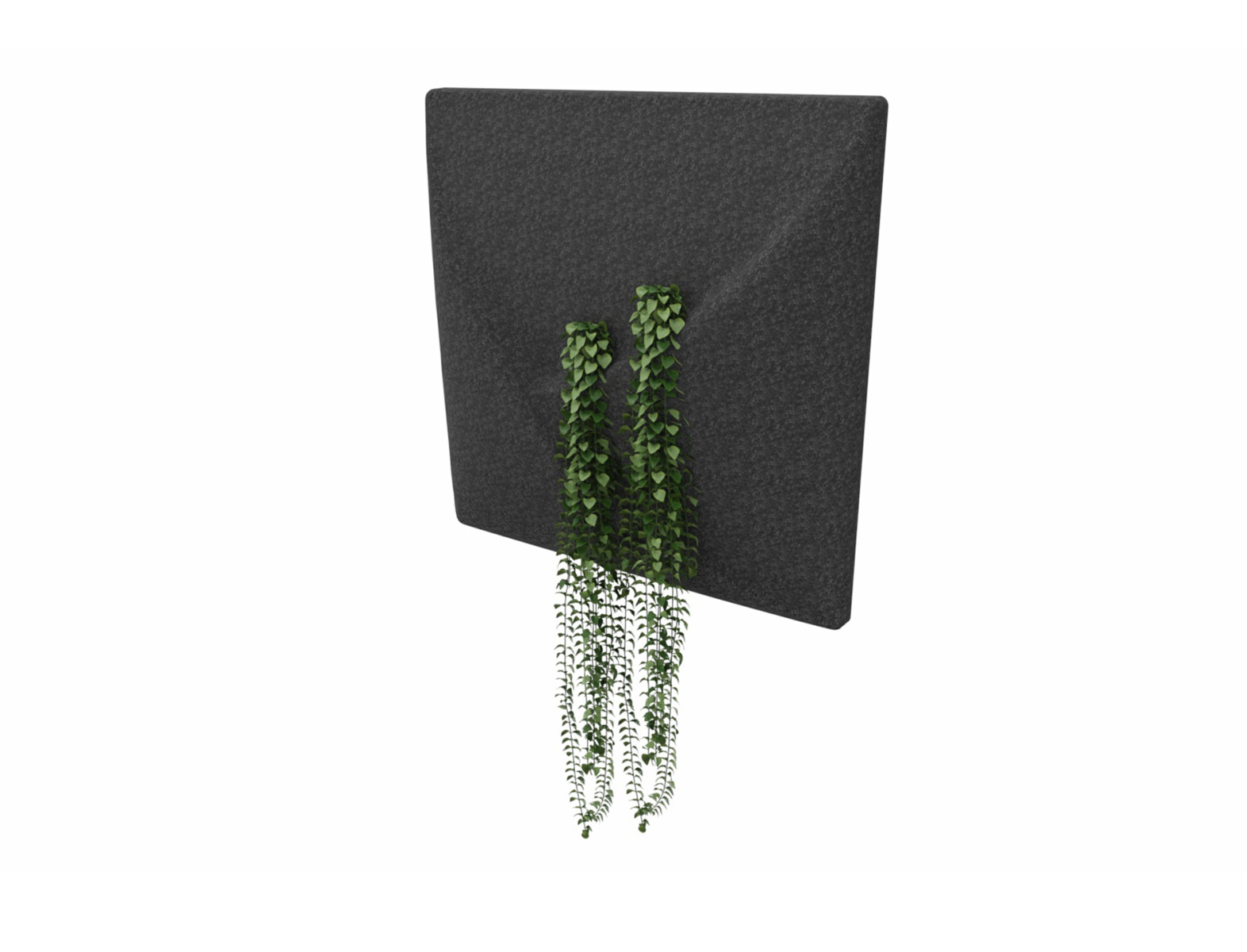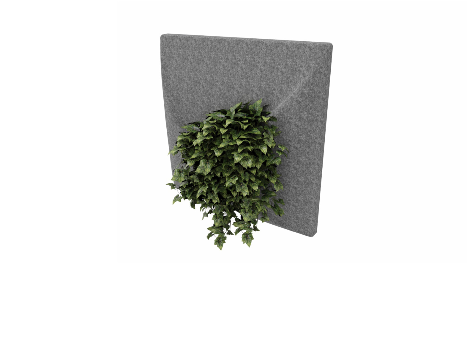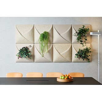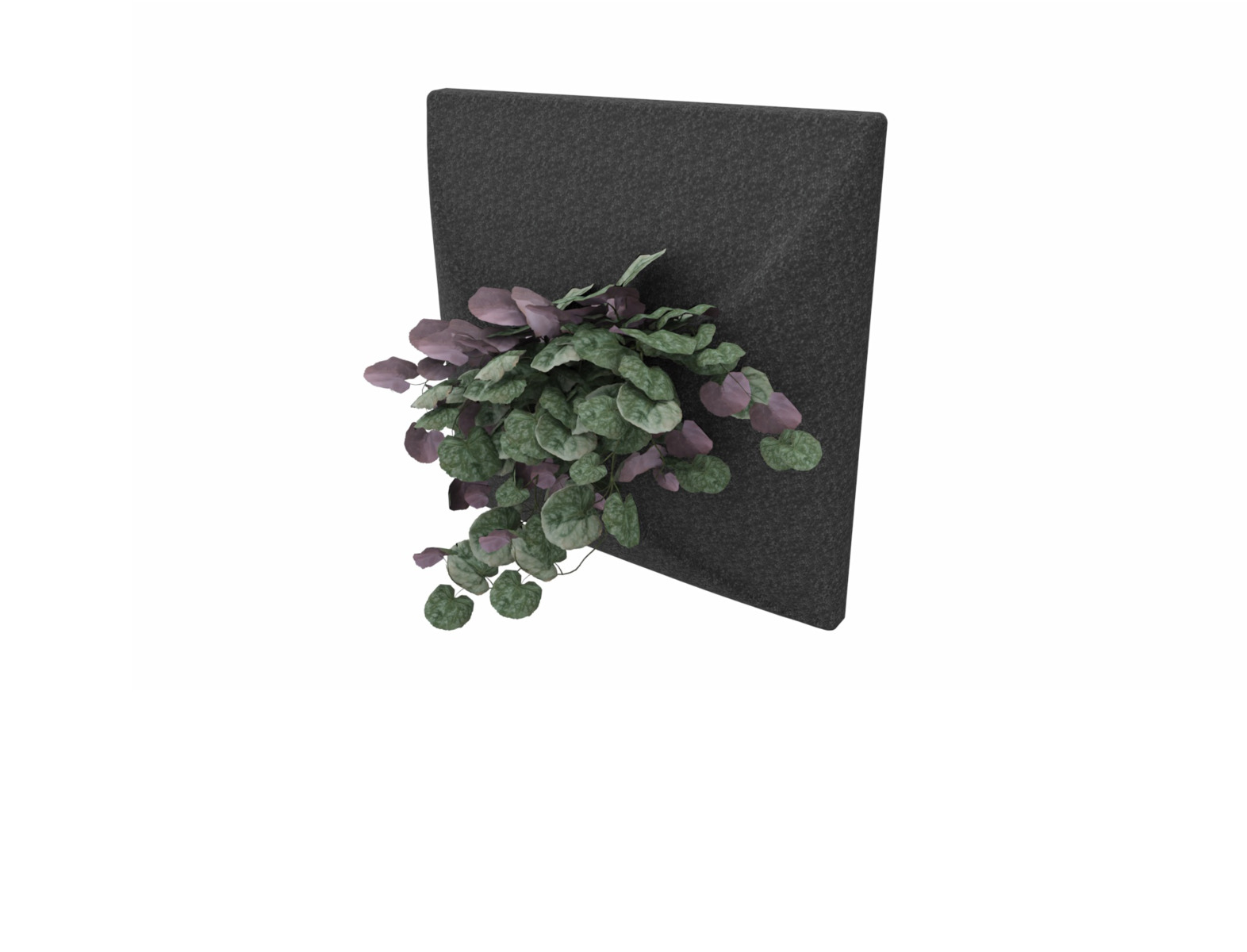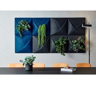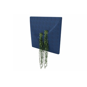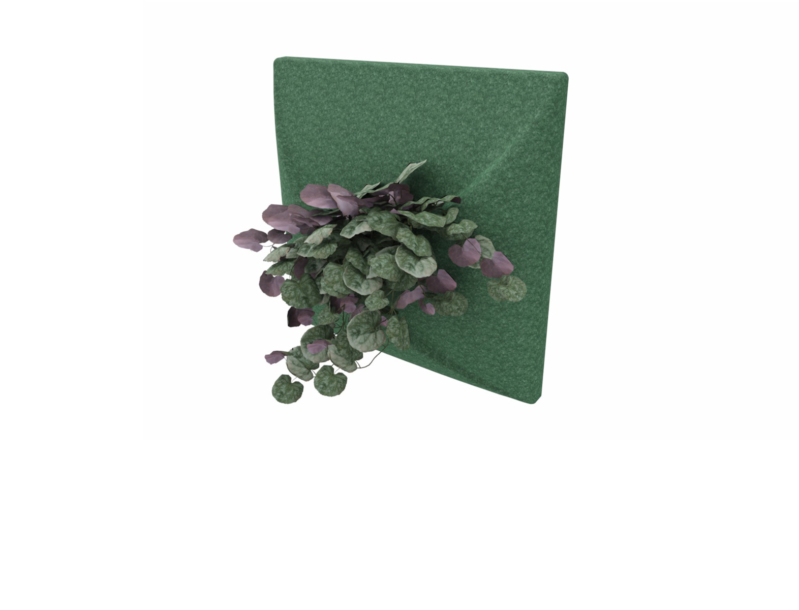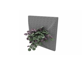 Väggdekoration i formpressad filt i minst 55 % återvunnen PET. EcoSUND-platta monterad bakom panelen för 30 % bättre ljudabsorption. Det böljande mönstret skapar en häftig visuell effekt. Växterna levereras utan kruka, stjälken placeras i de förstansade hålen. Monteras på vägg med list, upphängningslist ingår.