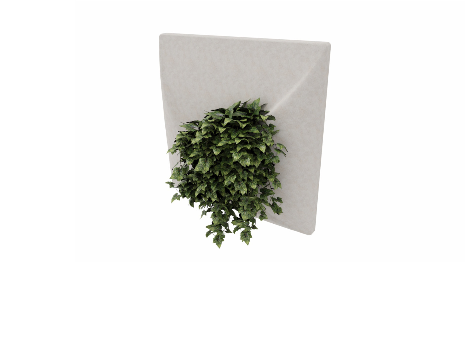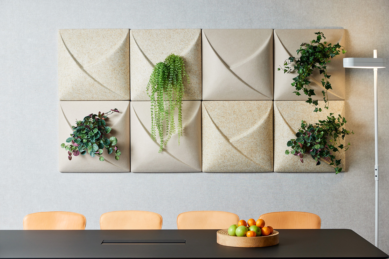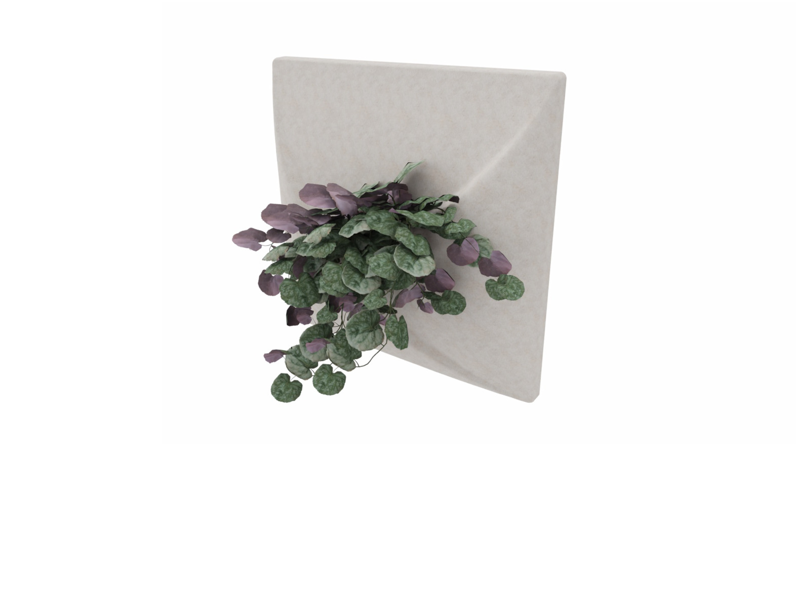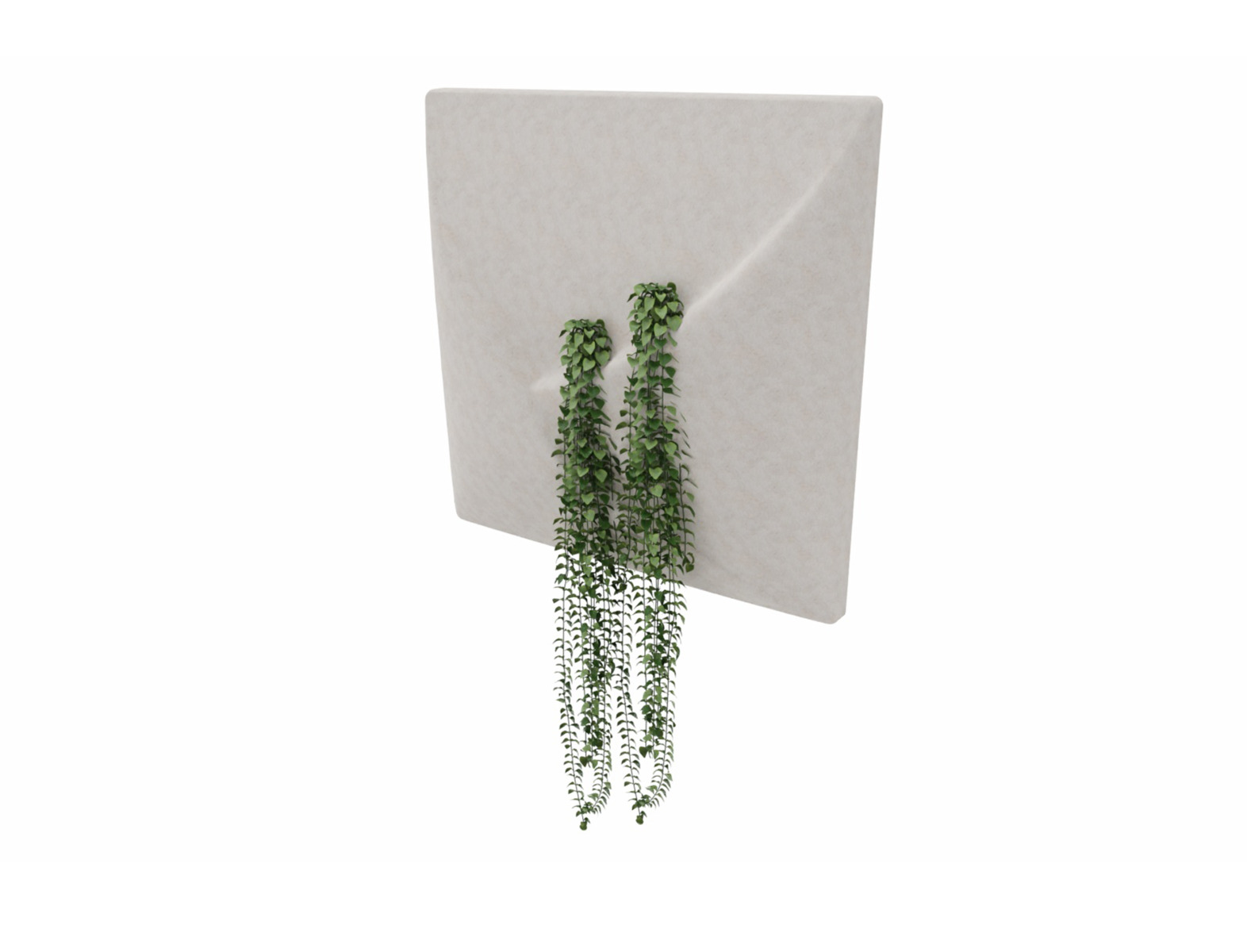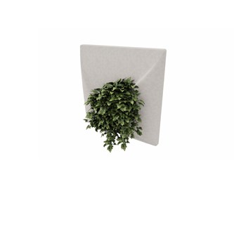 Väggdekoration i formpressad filt i minst 55 % återvunnen PET. EcoSUND-platta monterad bakom panelen för 30 % bättre ljudabsorption. Det böljande mönstret skapar en häftig visuell effekt. Växterna levereras utan kruka, stjälken placeras i de förstansade hålen. Monteras på vägg med list, upphängningslist ingår.