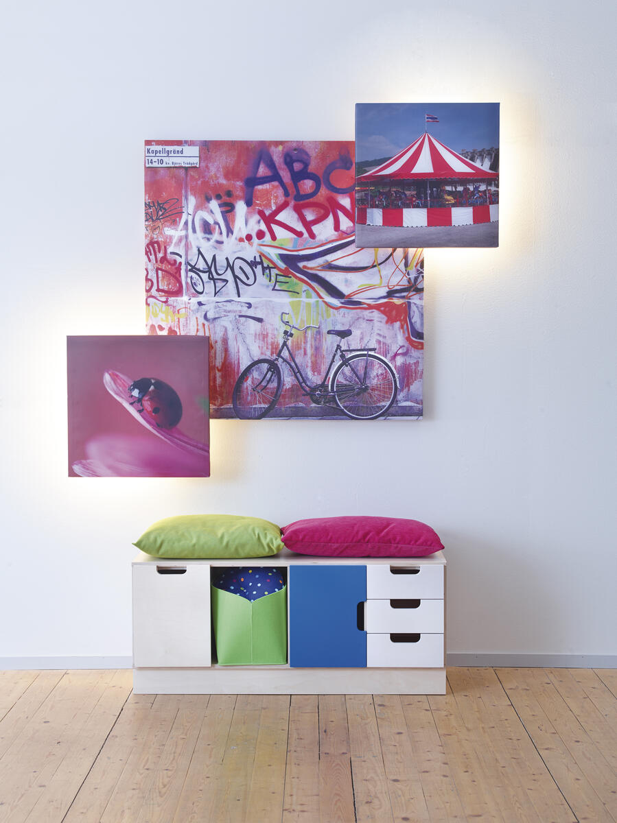 A-klassad ljudabsorbent i polyesterfiber. Laminerat motiv på polyesterduk som är spänd runt en träram. Kan hängas på väggen direkt eller med olika väggdistanser med särskilt upphäng. LED ljusslinga kan monteras på baksidan. Väggdistanser och ljusslinga säljes separat.