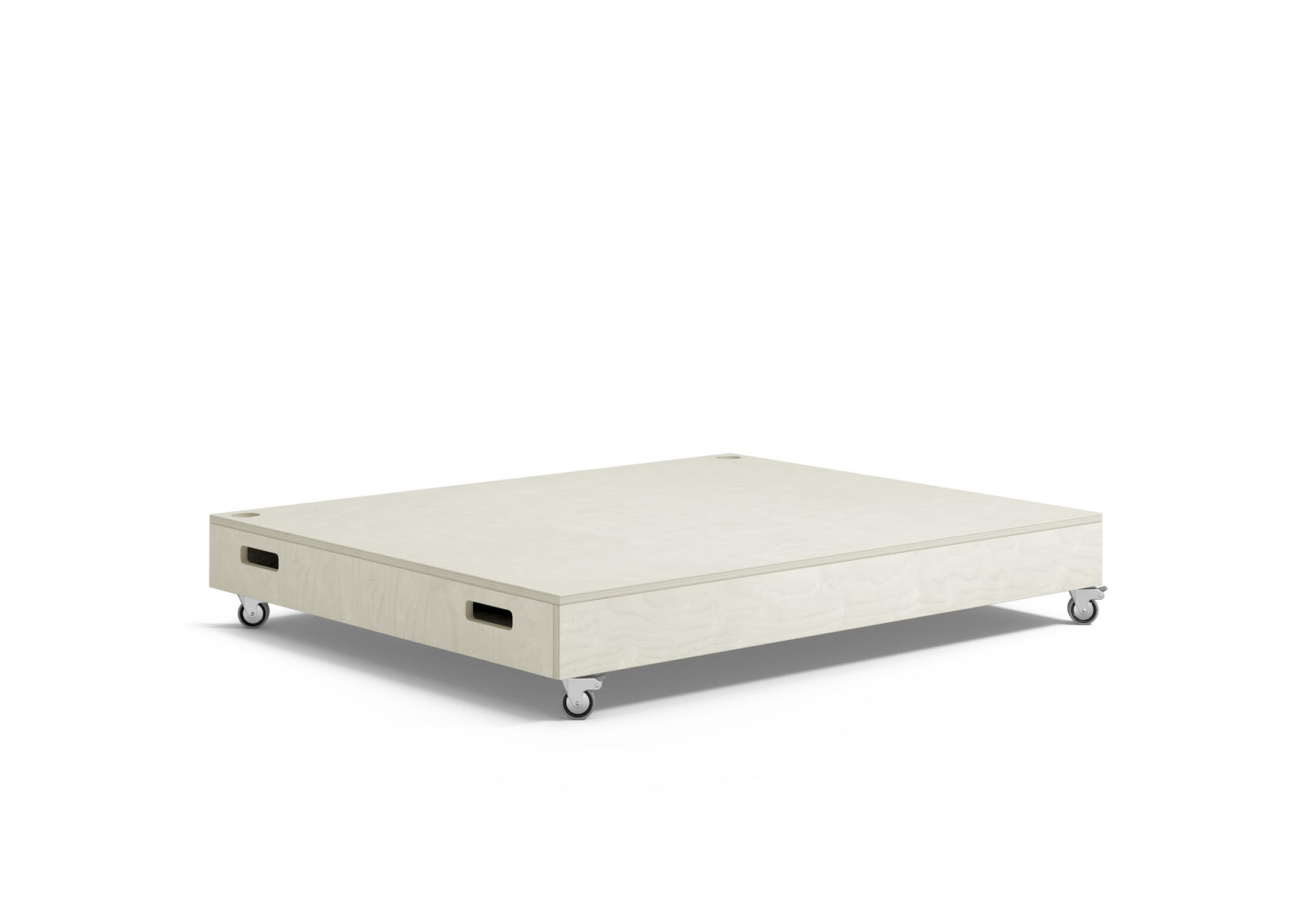 Scentrappa i vitpigmenterad plywood. Med förvaring. Monterad med 6 låsbara hjul. Integrerade bärhandtag, vilket gör den mycket lätt att flytta. Totalmått som trappa: L200xB110xH90 cm. Totalmått utslagen: L200xB210 cm. Trapphöjd: H30xB36,5 cm.