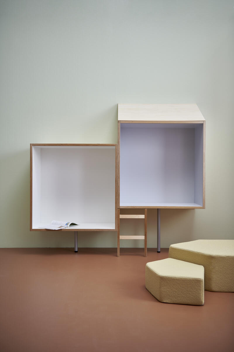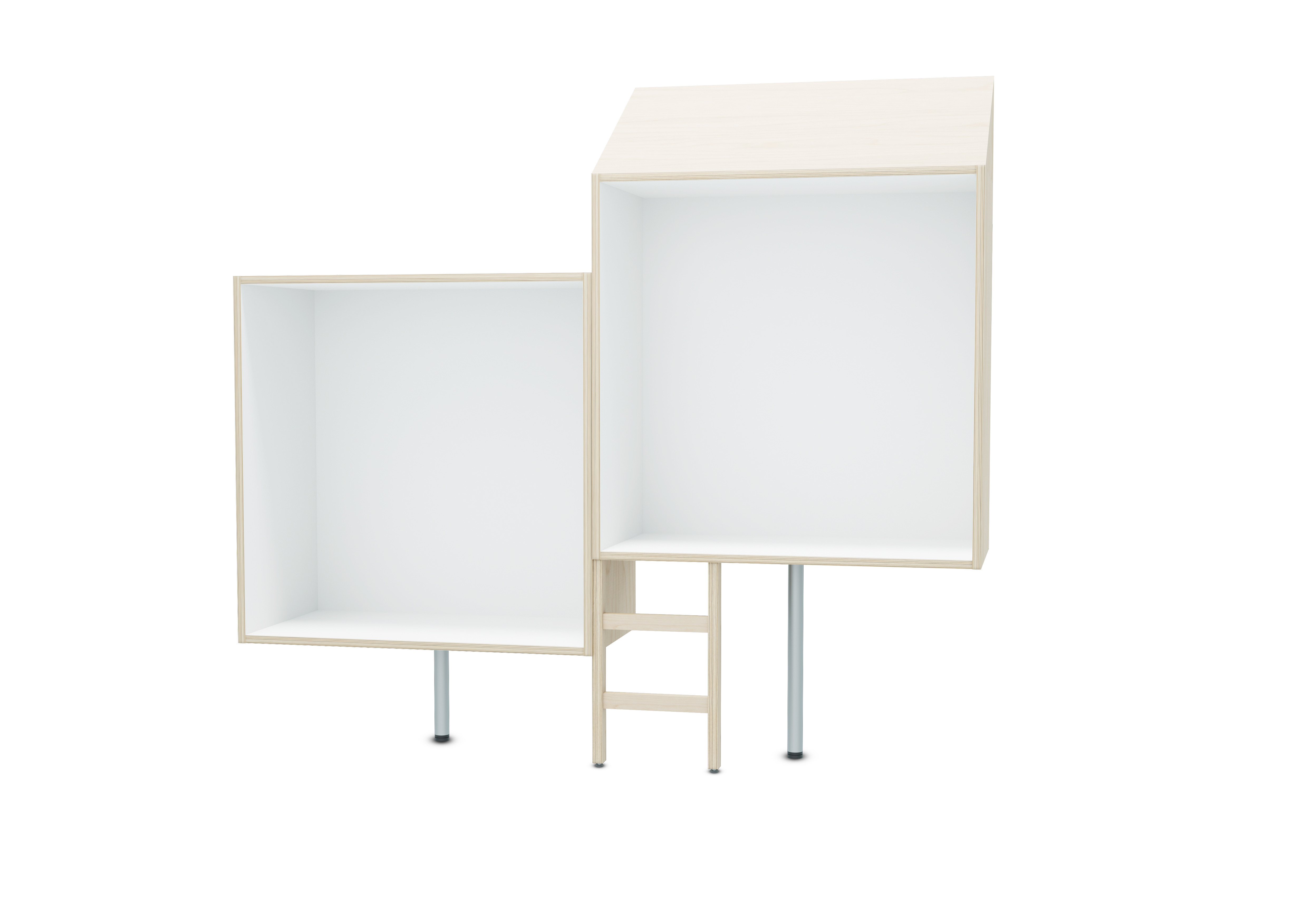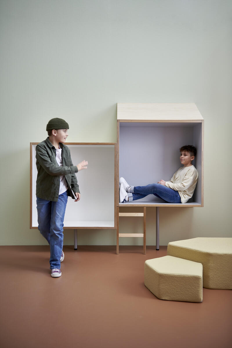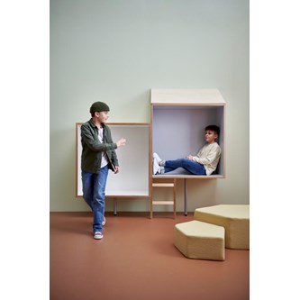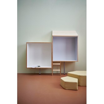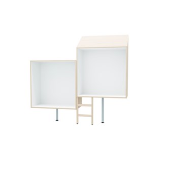 Krypin/sittmodul för väggmontering gjord i 28 mm plywood. Fästs på vägg med hjälp av vägglist. Högtryckslaminat i många färger på insidan. Använd minst ett ben (medföljer). Monteringsanvisning finns. Stege kan endast användas i en kombination med 2 moduler. Björklaminat på utsidan, välj färg på insidan. Tillbehör: tak, stege och extra ben. Totalhöjd: med ben 25 cm 125 cm, med ben 35 cm 135 cm och med ben 55 cm 155 cm.