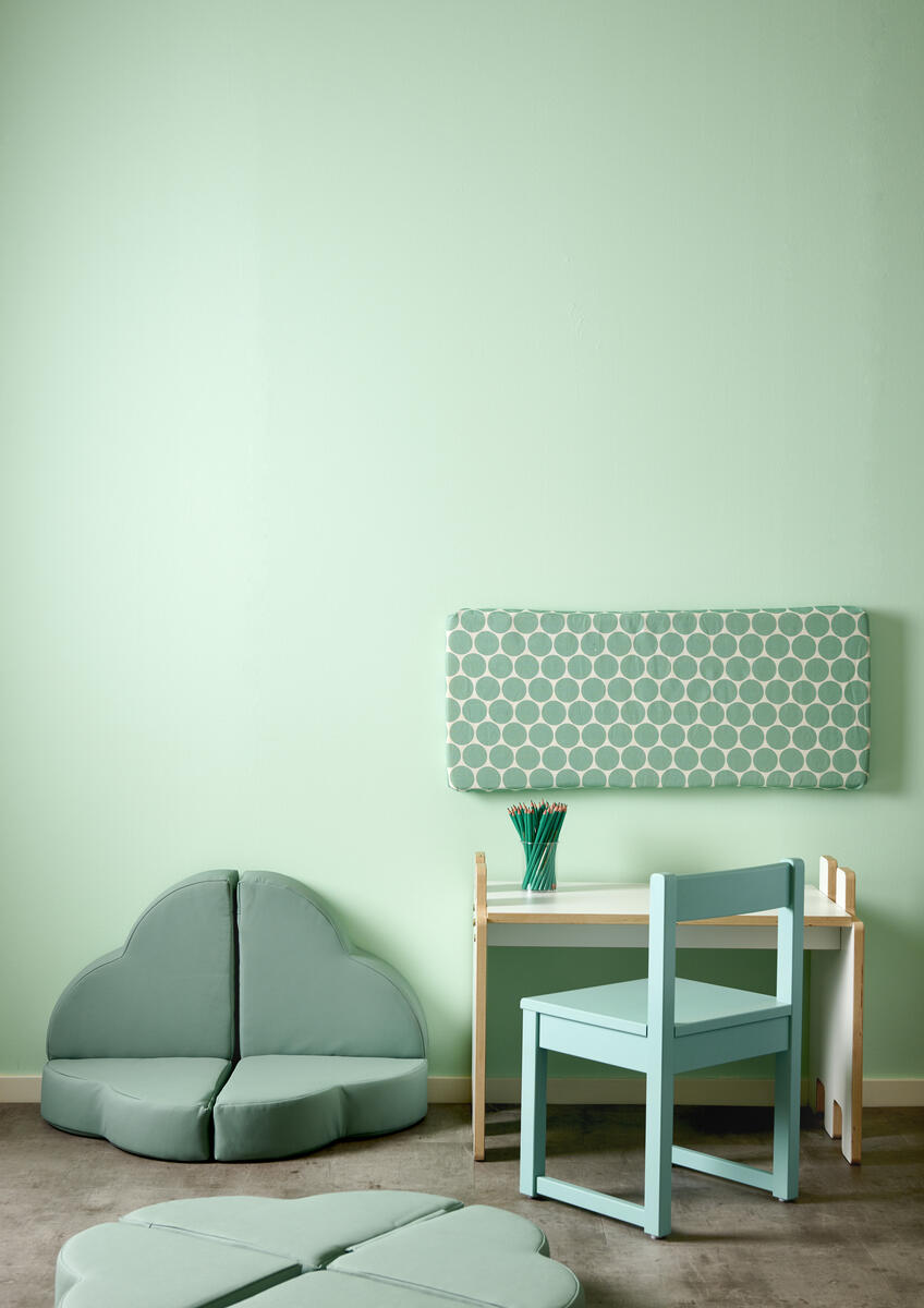 Barnsoffa anpassad för de mindre barnen, 1-5 år. En mjuk lekmöbel som håller ljudnivån nere och är säker att hantera. Inga armstöd vilket förenklar för de mindre barnen att sätta sig. Avtagbart fodral i tyg Slottsfjord, ett slitstarkt ull-liknande polyestertyg. Kärnan är av kallskum. Fodralet är tvättbart i 60 °C, ingen torktumling.