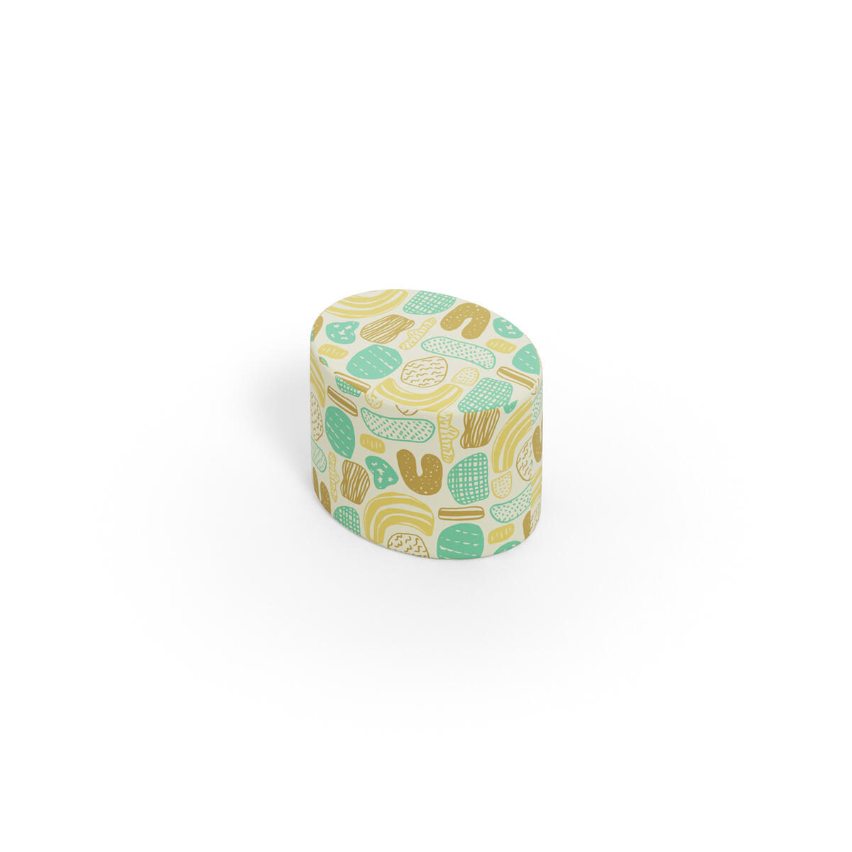 Oval sittpuff. Avtagbart fodral i 100 % BCI bomull, Oeko-Tex. Mått: 40x30x30 cm. Kärnan är av kallskum. Fodralet är tvättbart i 60 °C, ingen torktumling.