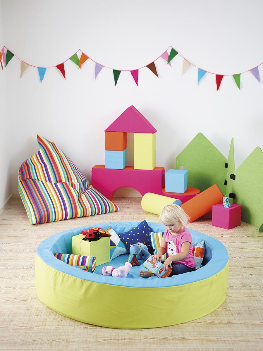 För mysiga samlingar. Plats för 10-12 barn. Avtagbart fodral i 100 % BCI bomull, Oeko-Tex Made in Green. Mått: ø 230/185 cm. Höjd 55/45 cm. Kärnan är av kallskum. Fodralet är tvättbart i 60 °C, ingen torktumling.