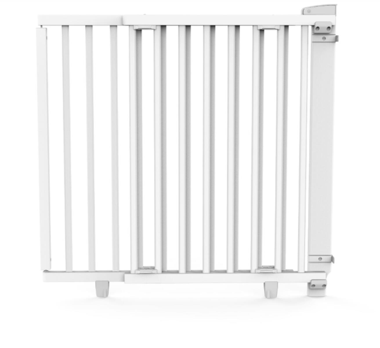 Vikbar barngrind utan tröskel som går att montera både på vänster och högerhängda dörrar. Fälls automatiskt tillbaka när den inte används. Bredden går att justera mellan 55-89 cm. Höjd 74 cm. Vid fästning utanför dörröppning 55-79,5 cm. Vid fästning i dörröppning 64,5-89 cm.