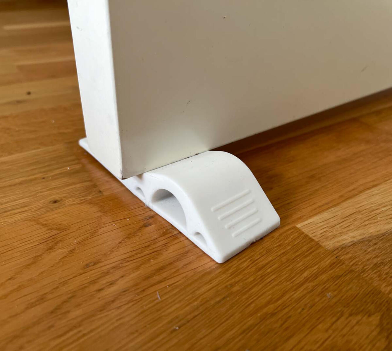 Dörrkil för att låsa fast dörren i öppet läge, t.ex vid vädring eller för att barnet inte ska kunna leka med dörren. Den är tillverkad i ett gummiliknande material som ger en hög friktion mot golvet och låser fast dörren ordentligt i öppet läge. En liten hållare som kan fästas på dörren med hjälp av dubbelhäftande tejp medföljer. Dörrkilen lämnar inga märken på varken golv eller dörrar. OBS! Dörrkilen passar inte dörrar som går högre än 2 cm från golvet. Levereras i 1‑pack.