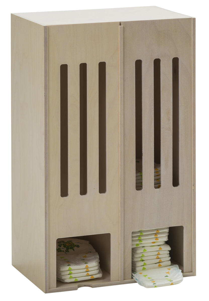 Blöjfack med lucka som går att skjuta upp för att lättare nå och fylla på blöjor. Hängs med fördel på väggen i anslutning till skötbordet. Vitpigmenterad. Innermått: B16xH60xD22 cm per fack, totalt yttermått: B37xH60xD24 cm.