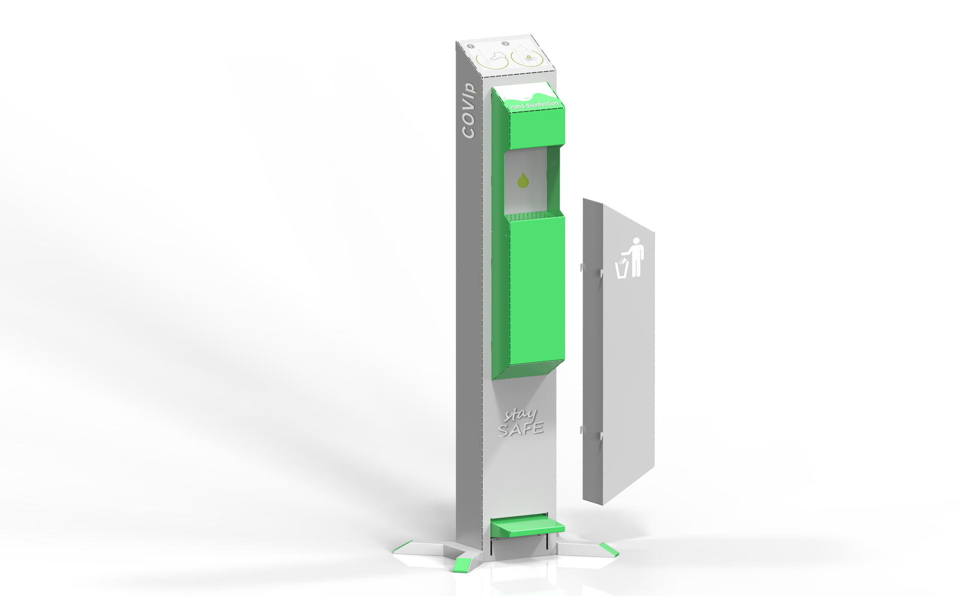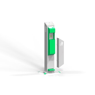 Mekanismen manövreras med en pedal och hela systemet är hygieniskt säkert. Lämplig för flytande och gelliknande innehåll med möjligheten att använda egen kapsel med en volym på 5 l. Dörr med cylinderlås. Kapsel med desinfektionsmedel ingår inte.