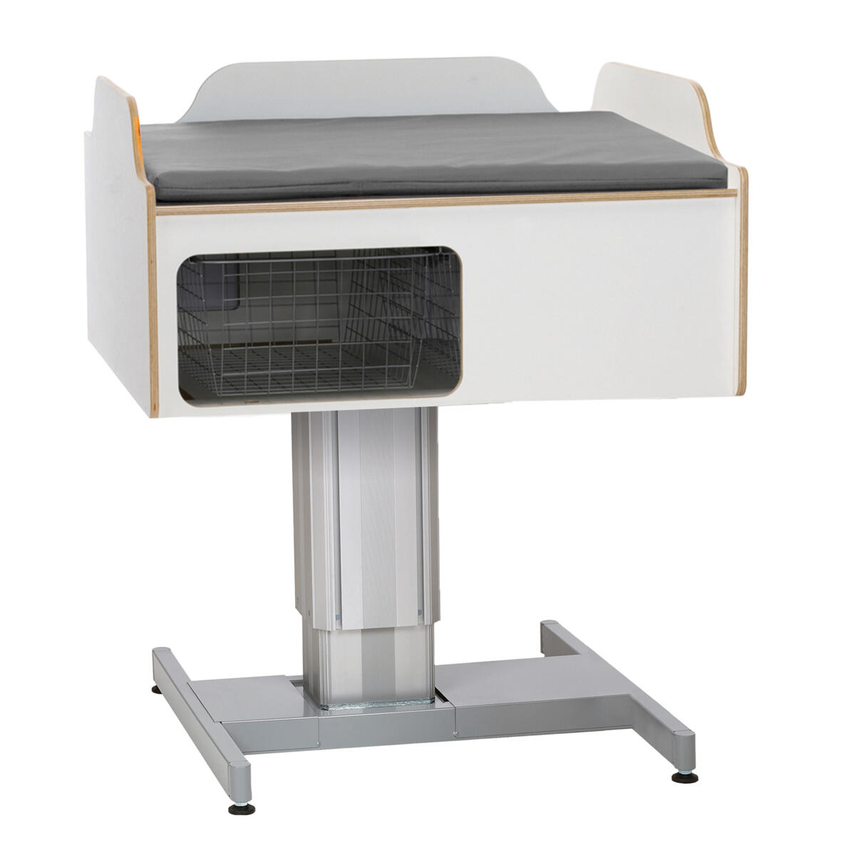 Uppfällbar skiva. Inklusive fallskydd och skötbordsdyna. Dynan är spritbar och tål maskintvätt upp till 60 °. Drift med transformator 24 V/240 V och elmotor 24 V. Längd strömsladd 3,7 m. Ställbar höjd 20-100 cm. Mått skötbord: 80x80 cm. Totalhöjd 139 cm. Djup inklusive stativ: 102 cm. Plywood. Lyfter 20 kg. Stege kan ej monteras pga låg lägstahöjd.