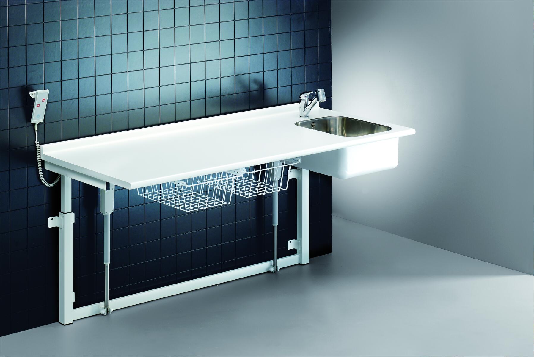 Höj- och sänkbart skötbord i plast. Från 30 till 100 cm över golv. Inkl. armatur. Mått på vask: L34xB55xD20 cm. Madrass köps till, se artikelnummer 36805.