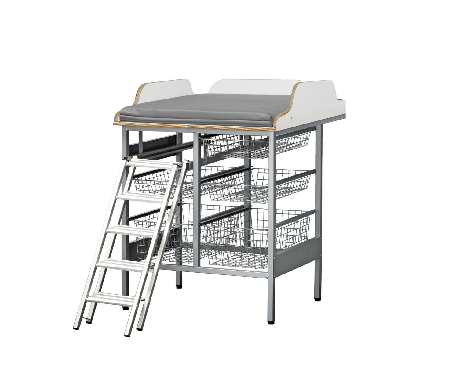 Skötbord med tvättdel till vänster. Stativ i pulverlackerat stål med ställfötter. Skiva av laminat. Fallskydd och 6 trådkorgar ingår. Kan kompletteras med dyna artikelnummer 80550 alt. 161561, blandare artikelnummer 34226, 119368 eller 119369, stege artikelnummer 34528. Mått: 140x80 cm. Höjd: 88 cm.