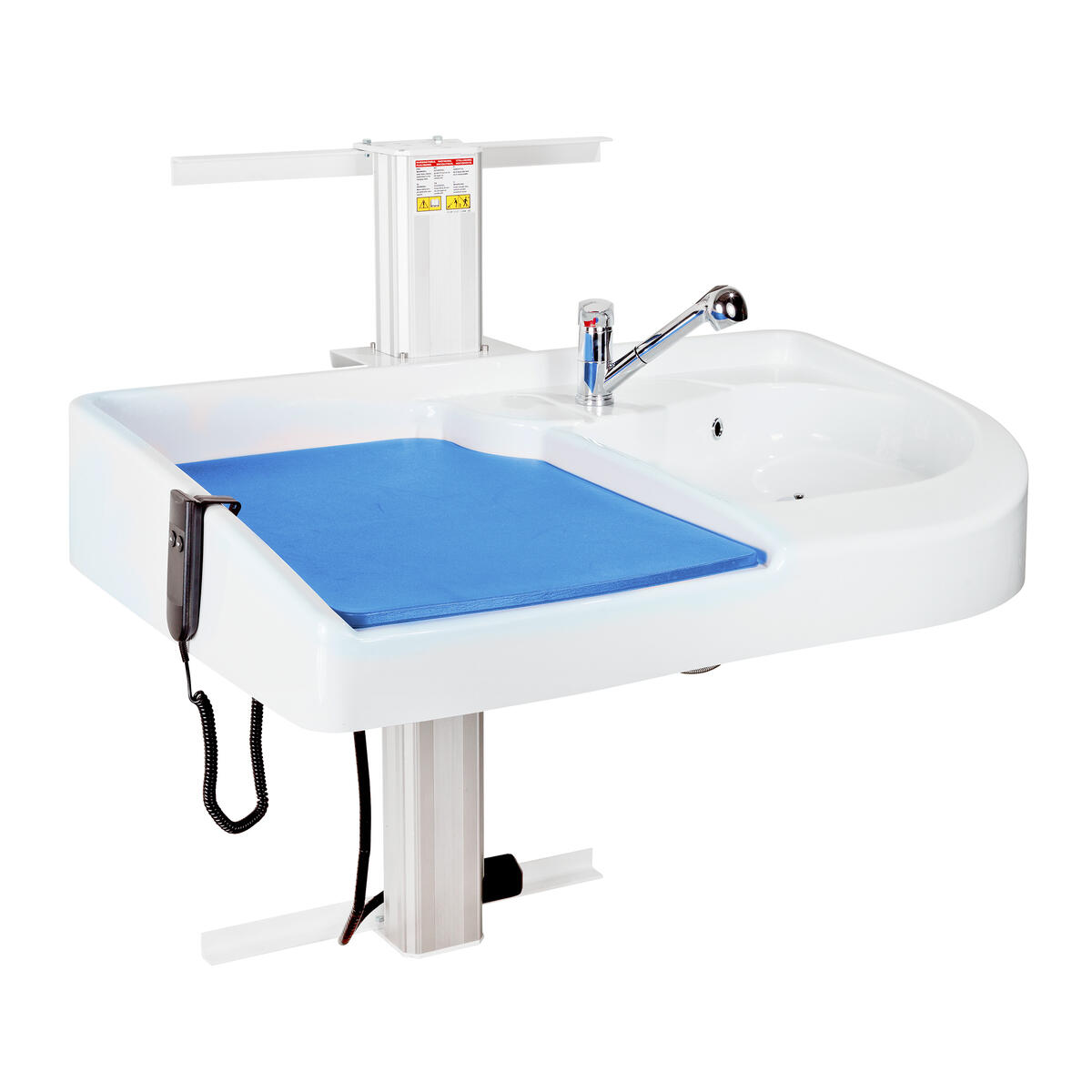 Inklusive blandare med utdragbar handdusch och flexibel avloppsslang. Höjdreglering via sladdansluten fjärrkontroll. Liftys konstruktion och motorteknik gör det möjligt att köra skötbordet så långt ner att barnen själva kan klättra upp på bordet. Ställbar höjd 36-108 cm. Mått skötbord: 120x84 cm. Djup inkl. stativ: 103 cm. Skötbordsytan och tvättdelen är tillverkade i formgjuten sanitetsakryl och dynan i vätskeavvisande, PVC-fri EVA. Hygieniskt och lätt att hålla rent. Det finns inga öppningar eller skarvar där vätskor kan tränga in och orsaka bakterietillväxt. Avsett för barn upp till 20 kg. Dyna ingår.
