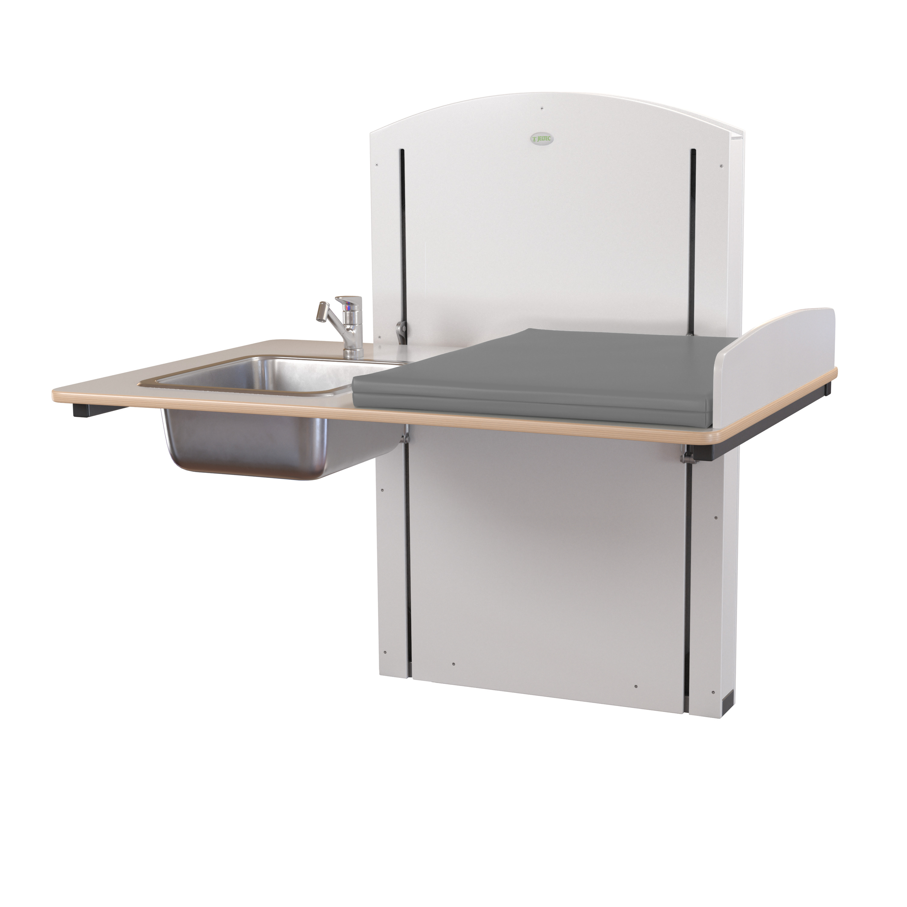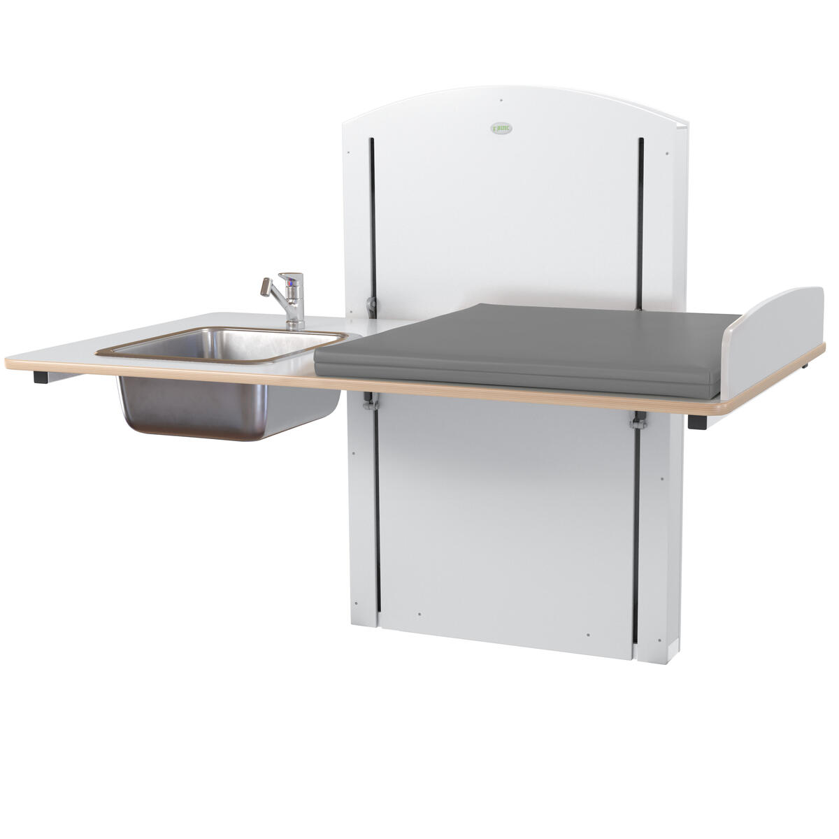 Lyfta vägg är ett väggmonterat elektriskt höj- och sänkbart skötbord med lägsta höjd 30 cm så att barnen enkelt ska kunna klättra upp på skötbordet från golvnivå. Du ställer lätt in rätt arbetshöjd med handkontrollen. Lyfta vägg finns i bredder mellan 60-140 cm och med tvättdel höger eller vänster i bredderna 100, 120 och 140 cm. Samtliga bredder har en standardskiva i laminerad plyfa (vit eller björk) med mjukt rundade hörn och höga kanter. När inte skötbordet används kan skivan fällas upp mot väggen för att spara plats (gäller ej modeller med tvättdel). För att undvika klämrisker mellan skötbordet och omgivande ytor bör du ha ett säkerhetsavstånd på ca 10 cm. Skötbordsdyna ingår. Dynan är spritbar och tål maskintvätt upp till 60 °C. Vid val av tvättdel ingår blandare. Vid bredd 120-140 ingår blandare med handdusch. Vid bredd 100 ingår blandare utan handdusch.