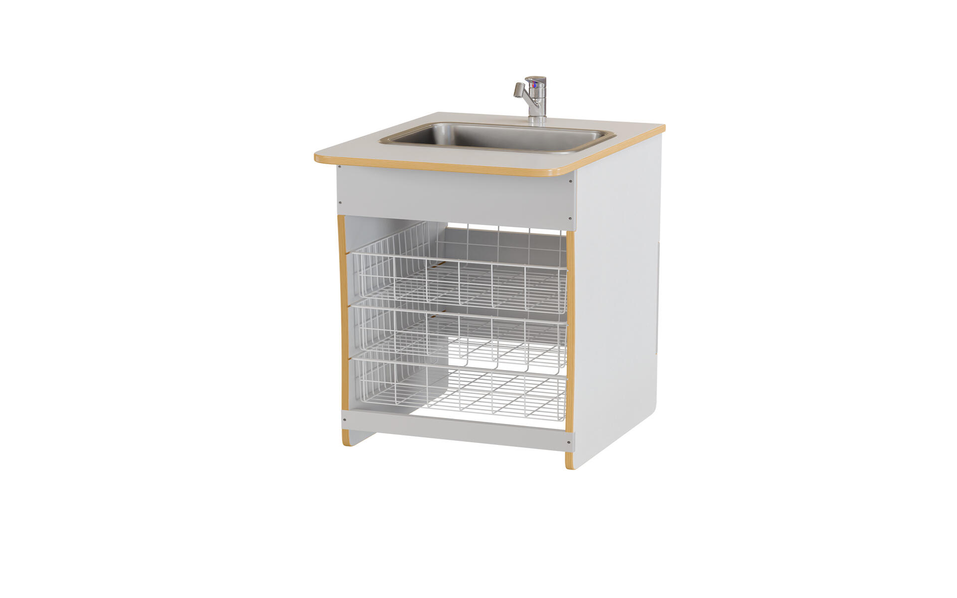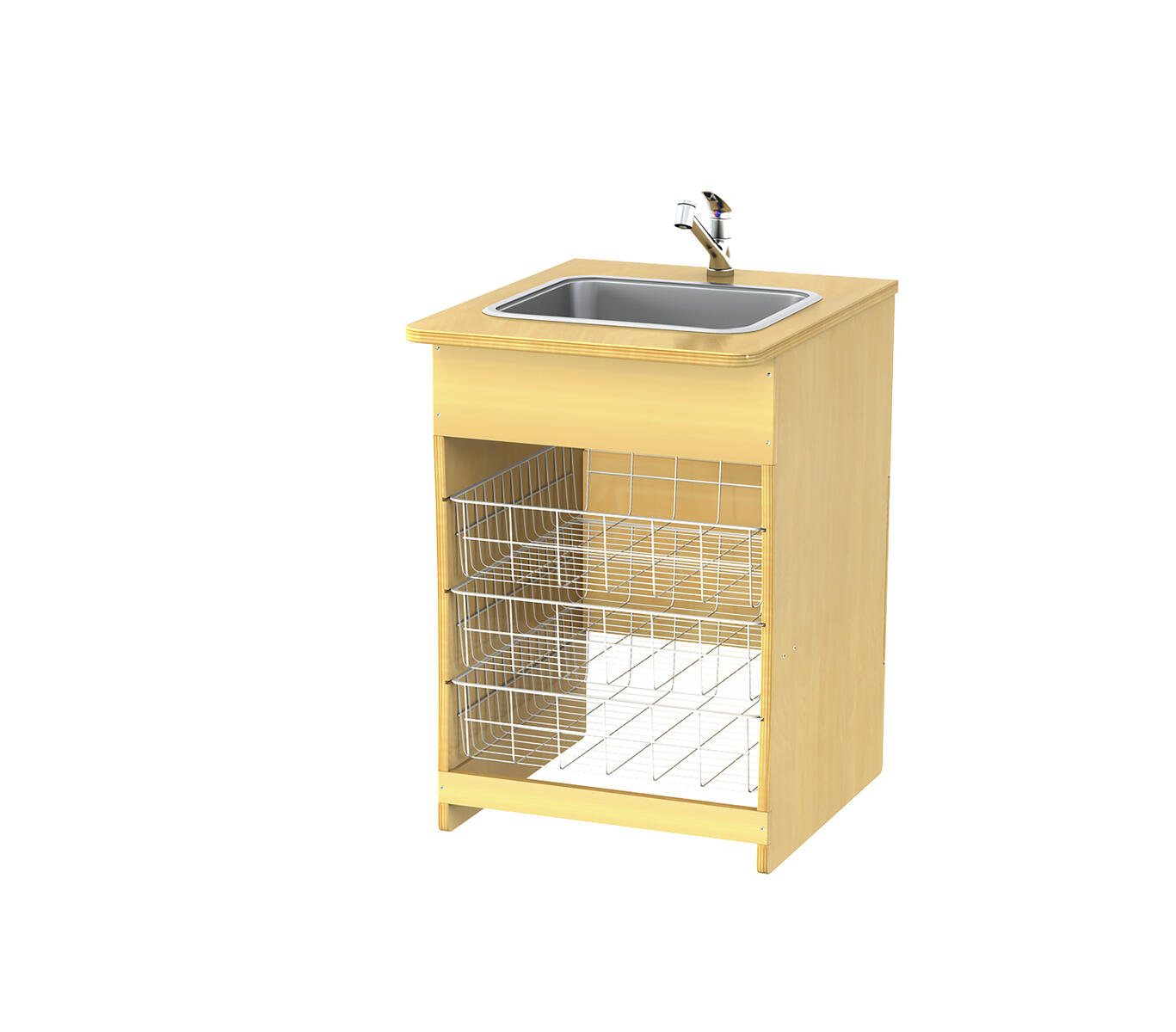 Fristående tvättbänk som fungerar som tillbehör till skötbord Lyfta och Elit. Den kan med fördel stå bredvid eller mellan höj- och sänkbara skötbord utan att det blir någon klämrisk, eftersom den har heltäckande sidor. Arbetsskivan har infälld tvättdel. Tvättbänken levereras komplett med blandare med utdragbar dusch och avloppsdetaljer samt 4 trådkorgar H12 cm.
