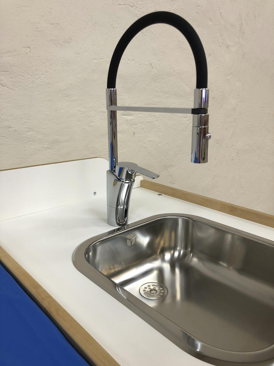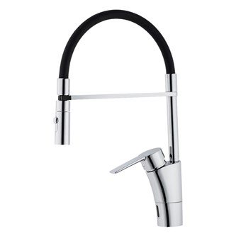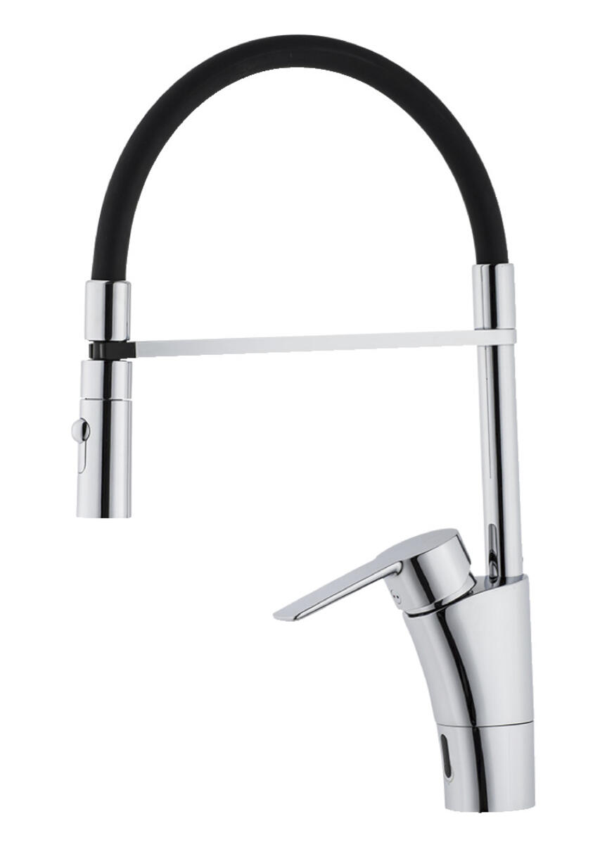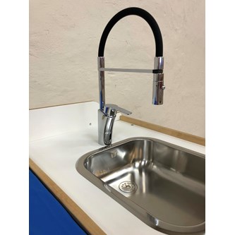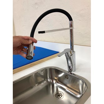 Beröringsfri blandare med löstagbart munstycke. Den fungerar som vanligt med spaken och genom att hålla handen framför sensorn får man en beröringsfri spolstart. Spoltiden vid den beröringsfria starten kan enkelt ställas in till 4, 8 eller 12 sekunder och temperaturen regleras med ett vred under diskbänken. Sensorfunktionen gör blandaren mer hygienisk samtidigt som den är vattenbesparande och snäll mot miljön. Kranen har även ett smidigt städläge samt ett löstagbart munstycke som kan varieras mellan olika strålbilder: koncentrerad stråle eller dusch. Sensorfunktionen drivs med hjälp av ett CR-P2 6V Lithium batteri. Beräknad livslängd på batteri är ca 3 000 tvättar. Passar till Skötbord Elise, Basic och Kajsa.