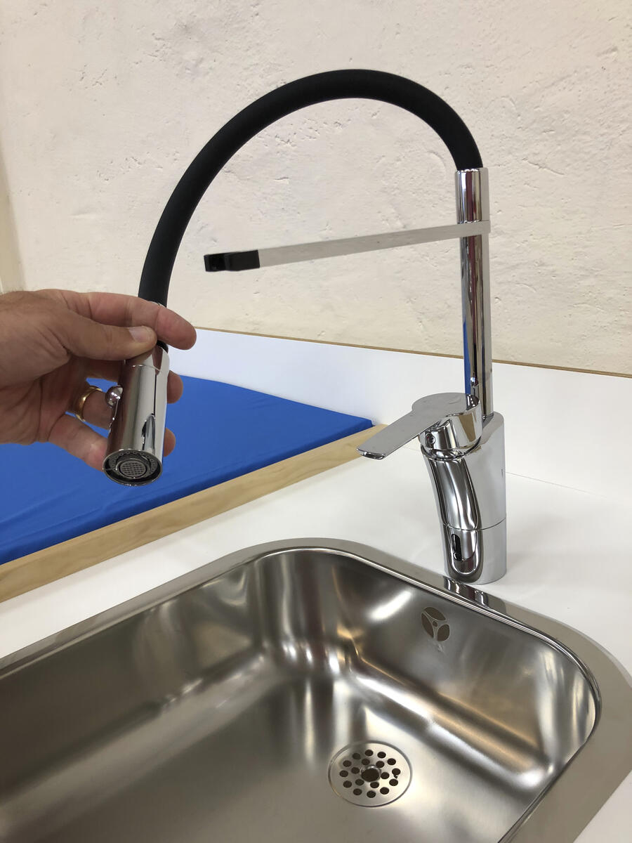 Engreppsblandare med utdragbar flexibel handdusch som kan varieras mellan olika strålbilder: koncentrerad stråle eller dusch. Utrustad med skållningsskydd (38 ºC). Eco-Save vattensparfunktion.
