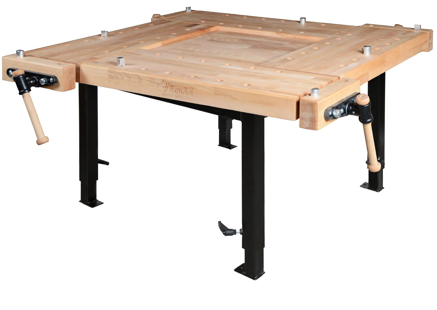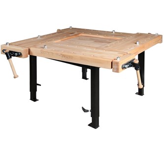Robust arbetsbänk med 4 arbetsplatser, främst utformad för användning i skolor. Varje arbetsstation är utrustad med stålgjuten bak- och framtång. Bänkskiva av massivt, 8 cm bokblock. Höj- och sänkbara ben med gasdämpare. Höjdjustering kräver 2 personer. Bänkytor är linoljade. 4 par bänkhakar ø 19 mm ingår. Mått bänkskiva exkl. tång: 130x130 cm. Kraftigt skruvstäd (french type).
