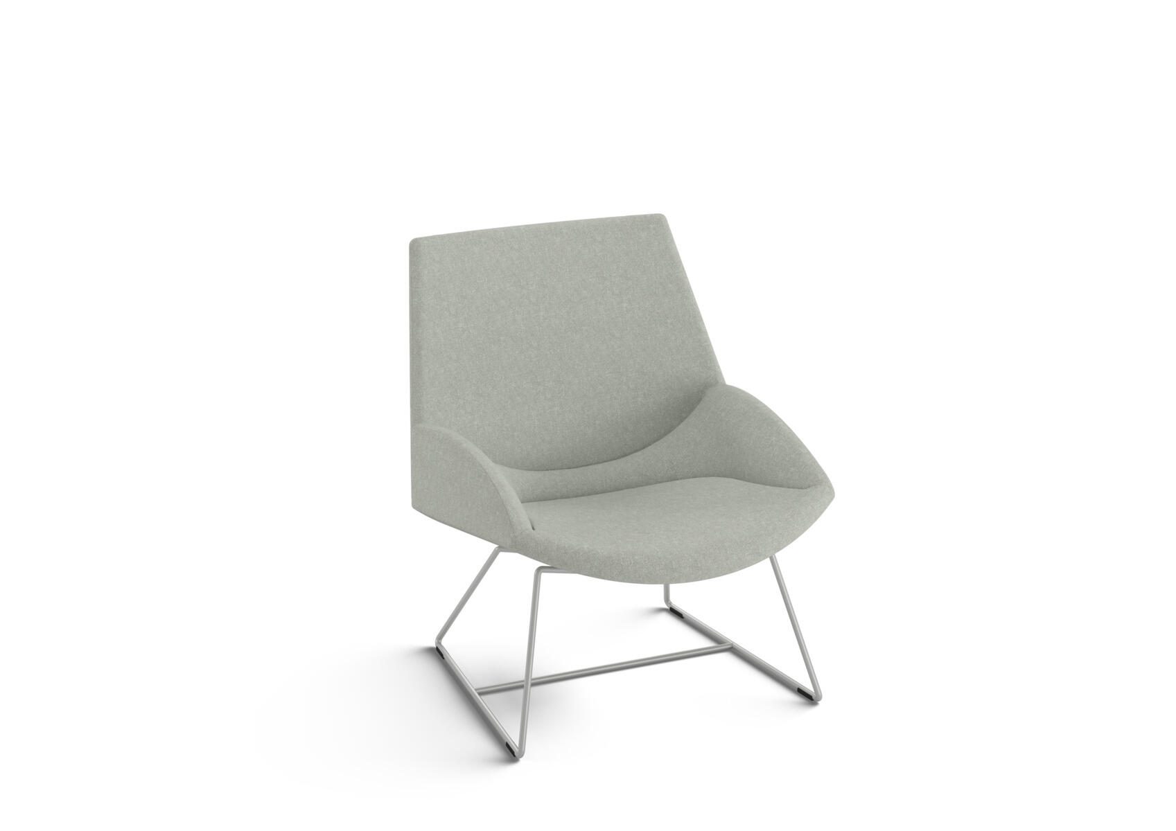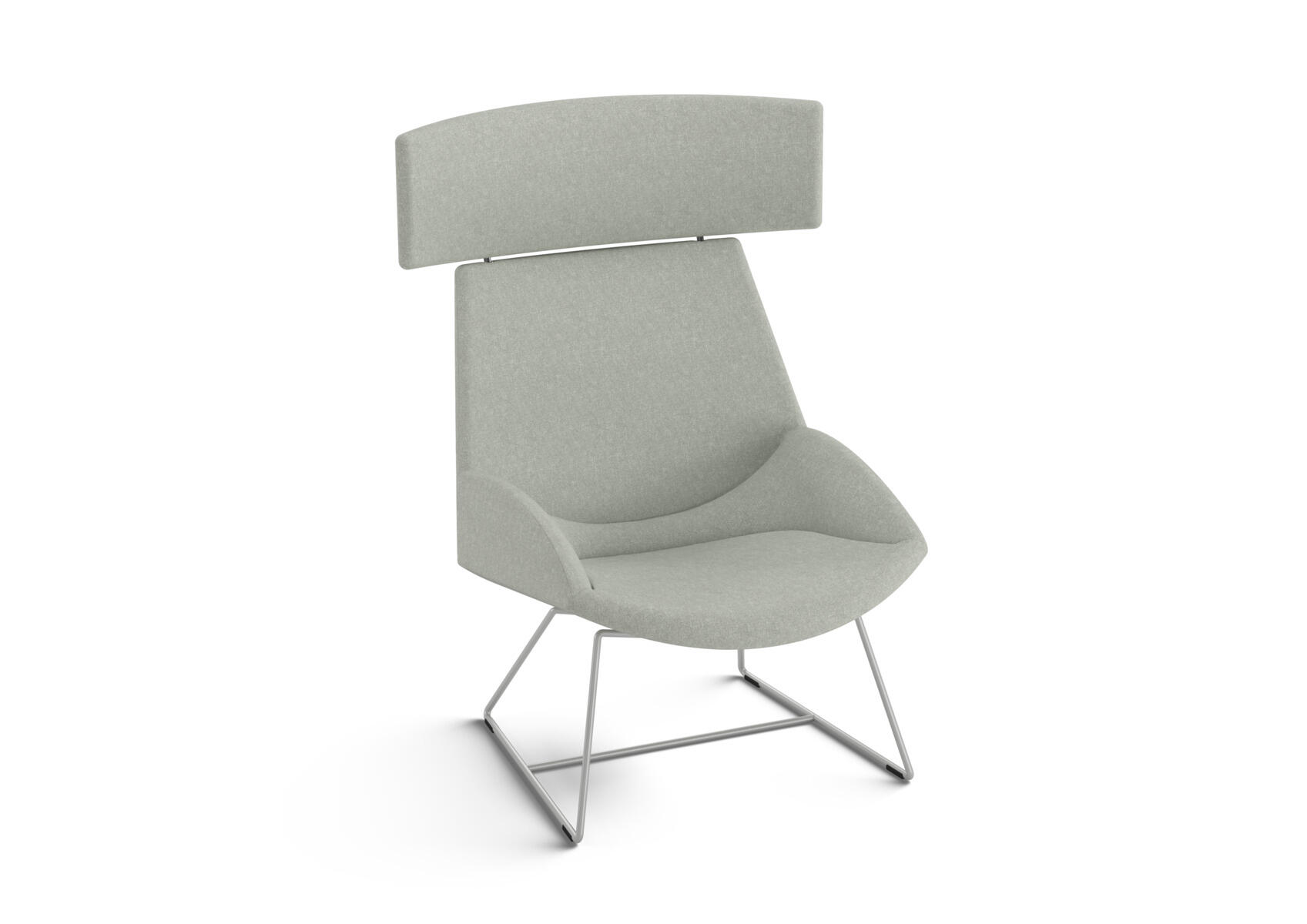 Omslutande fåtölj som tack vare sina höga sidor har en ljuddämpande och avskärmande effekt, vilket gör att den lämpar sig för exempelvis mindre, privata möten eller telefonsamtal. De höga väggarna ger avskildhet från resten av rummet. Trästomme och stoppning i kallskum. Medar i pulverlackad metall. Färgval på rygg. Gavlar och sits alltid grå kulör i det tyg som väljs. Som tillval finns eluttag.