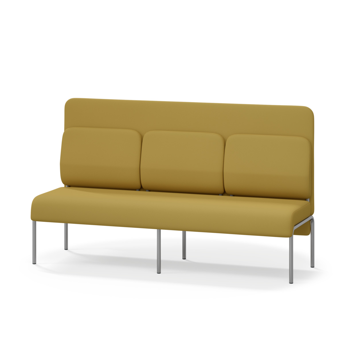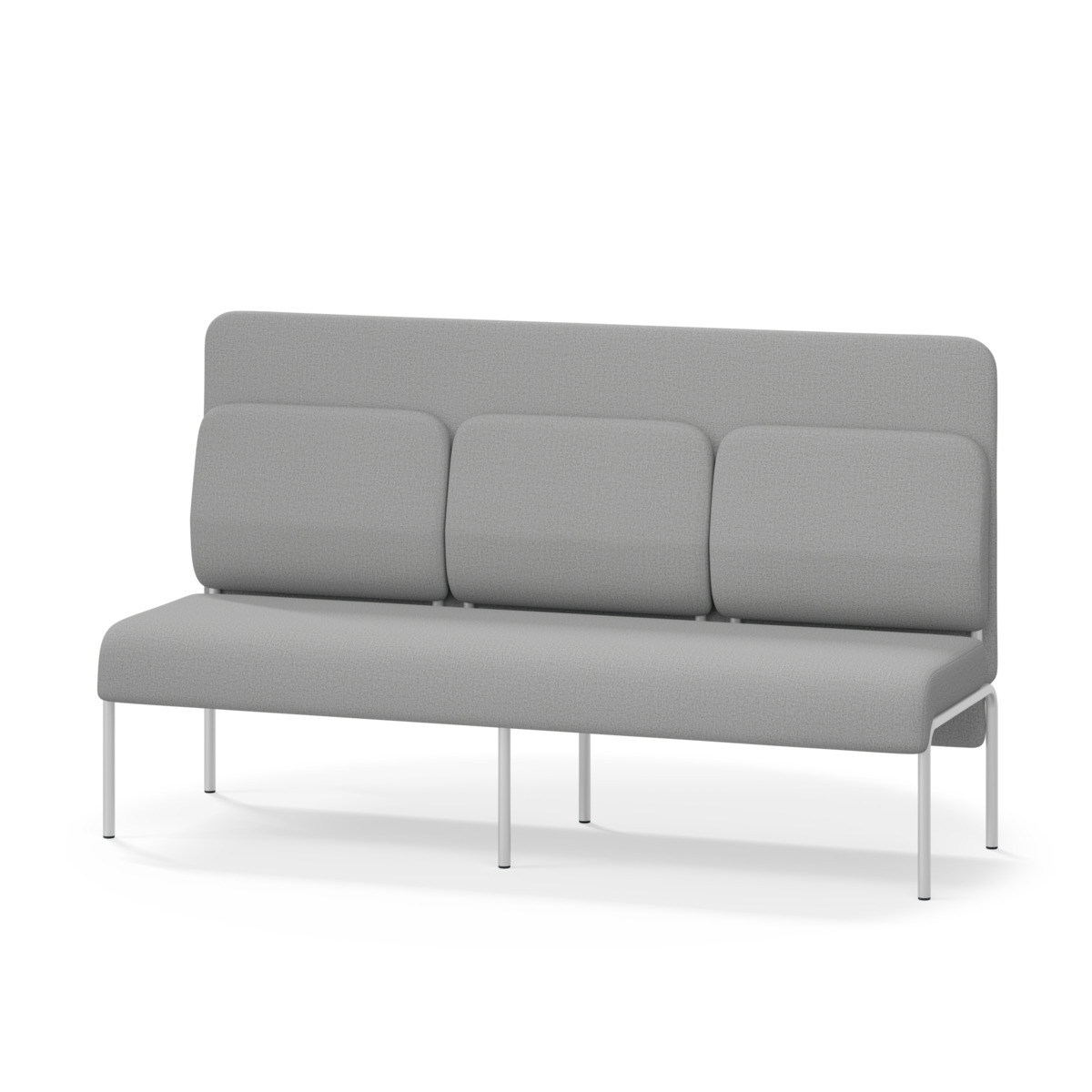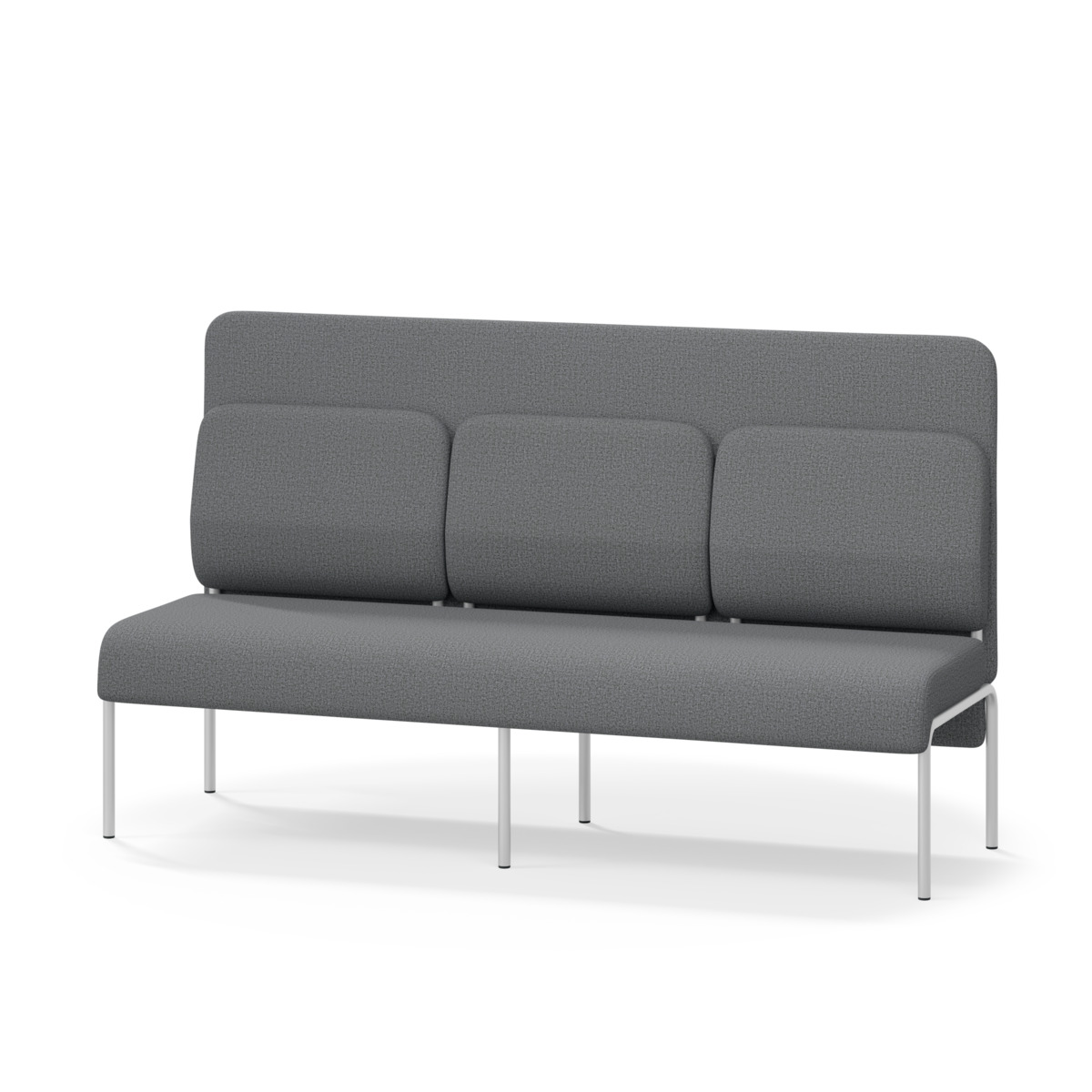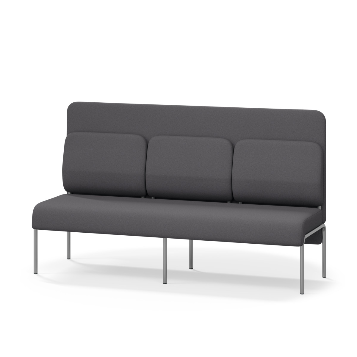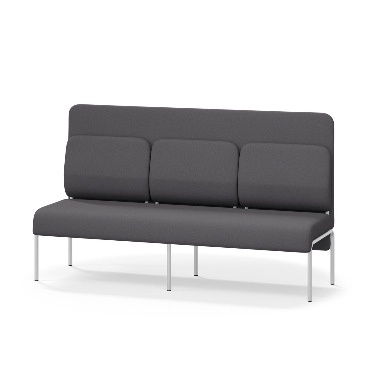 3-sitsig soffmodul med ergonomiskt designad ryggkudde och ljudabsorberande panel. Soffsystemet är särskilt utformat för att skapa platsbesparande moduler för studiero, trygghet, gemenskap och inkludering i skolan. Vi har minimerat materialanvändningen och skapat en cirkulär produkt där alla delar kan bytas ut. Soffan har smulgap och högt metallstativ som underlättar vid städning, samt avtagbar klädsel på dynor och paneler. Stomme av plywood med stoppning av kallskum. Stativ i pulverlackad metall med ställfötter som gör att soffan står stadigt även på ojämna underlag. Design: Sigrid Strömgren