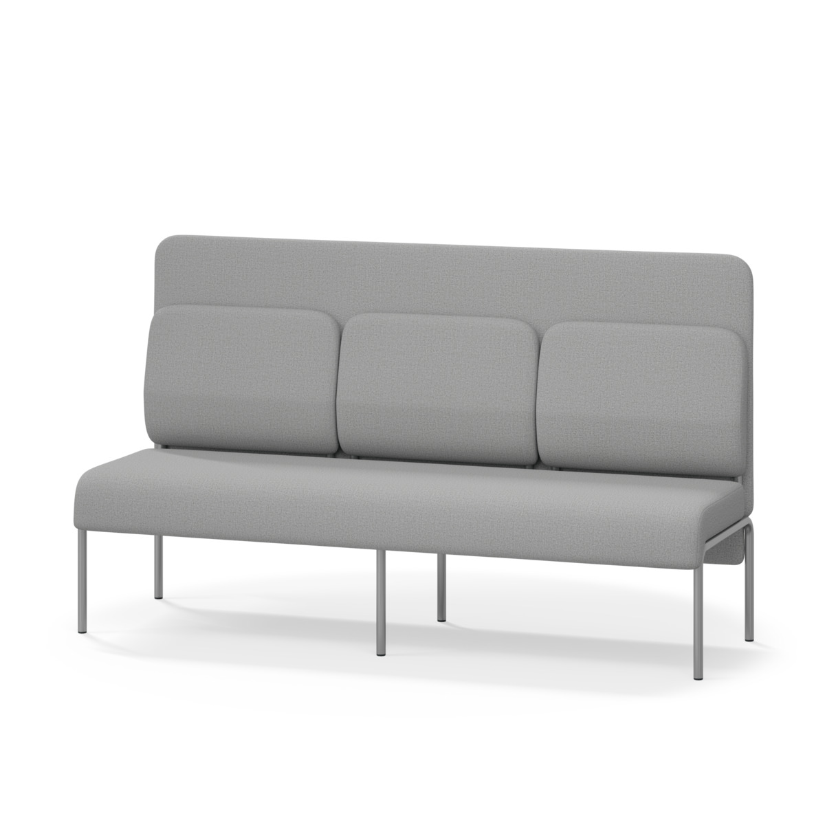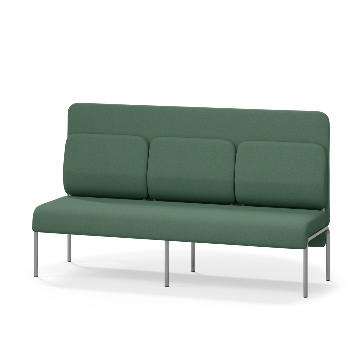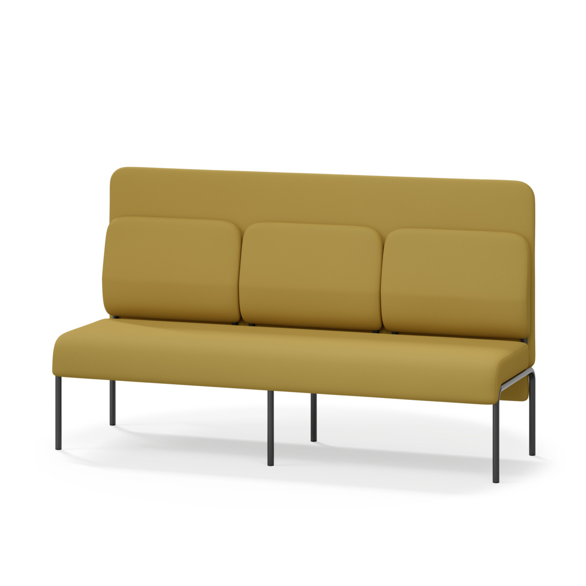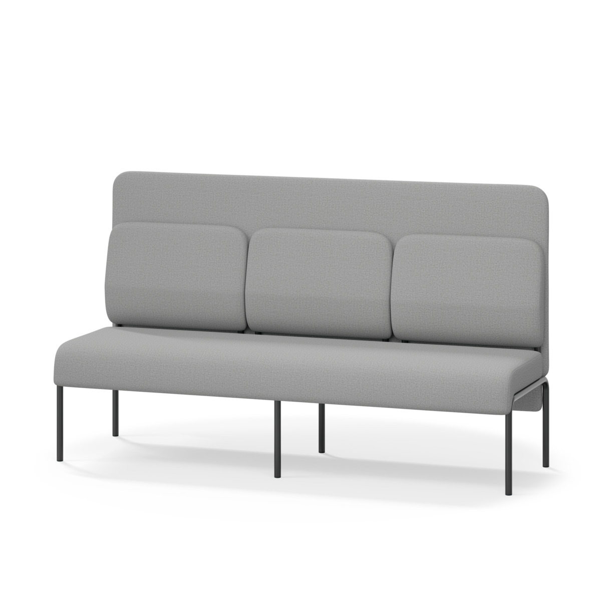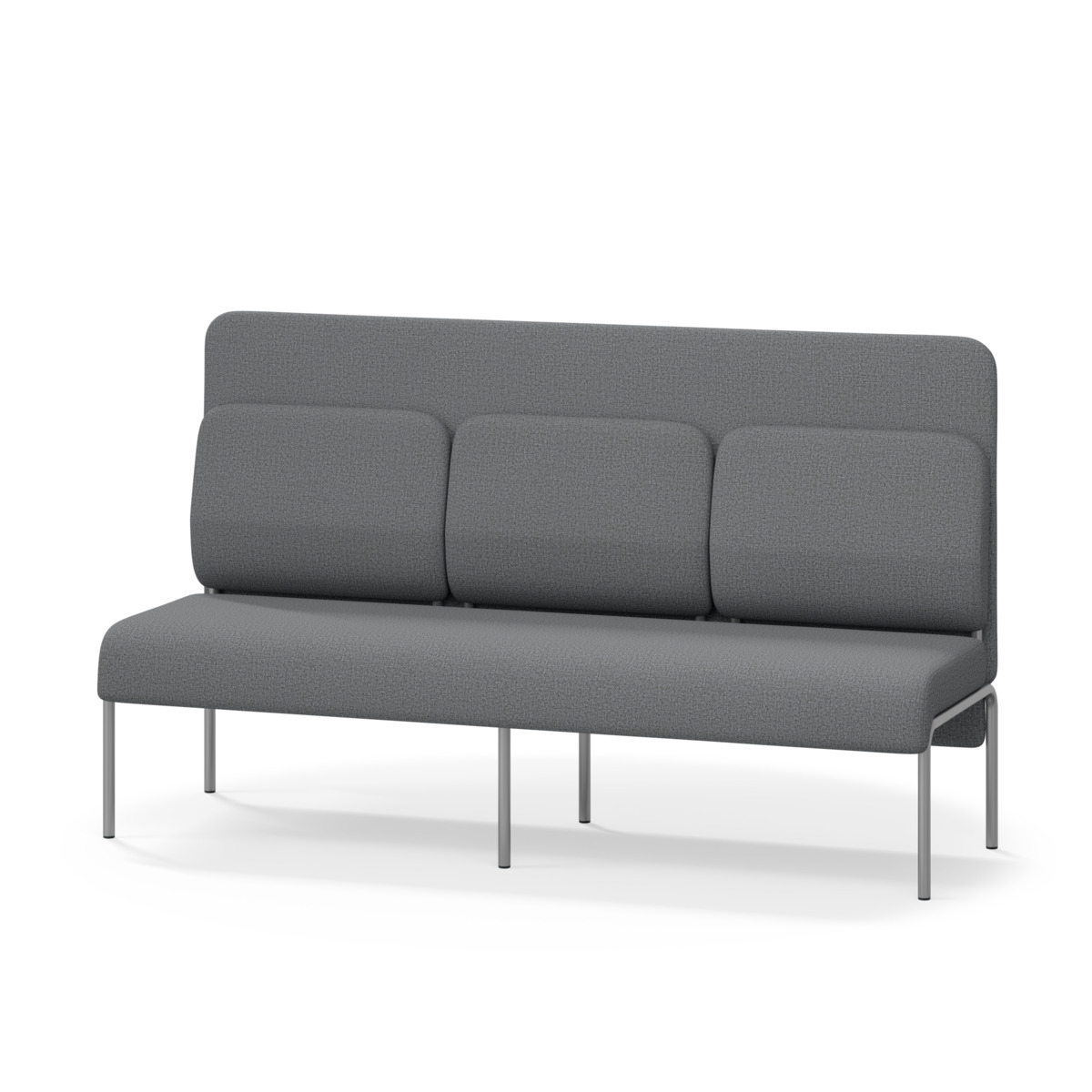 3-sitsig soffmodul med ergonomiskt designad ryggkudde och ljudabsorberande panel. Soffsystemet är särskilt utformat för att skapa platsbesparande moduler för studiero, trygghet, gemenskap och inkludering i skolan. Vi har minimerat materialanvändningen och skapat en cirkulär produkt där alla delar kan bytas ut. Soffan har smulgap och högt metallstativ som underlättar vid städning, samt avtagbar klädsel på dynor och paneler. Stomme av plywood med stoppning av kallskum. Stativ i pulverlackad metall med ställfötter som gör att soffan står stadigt även på ojämna underlag. Design: Sigrid Strömgren