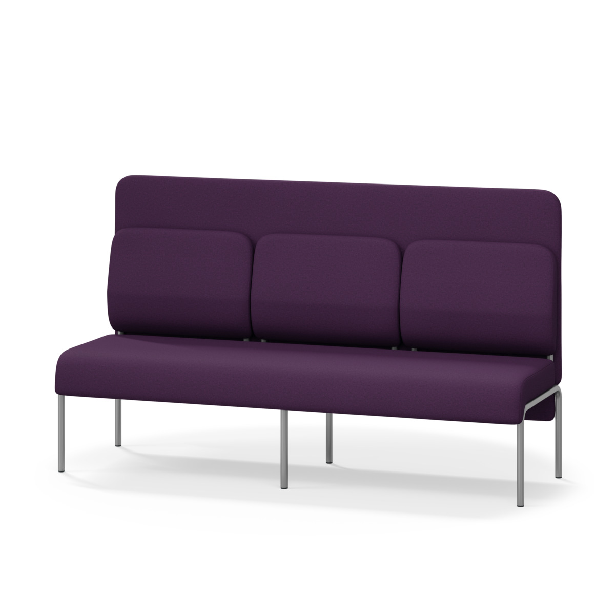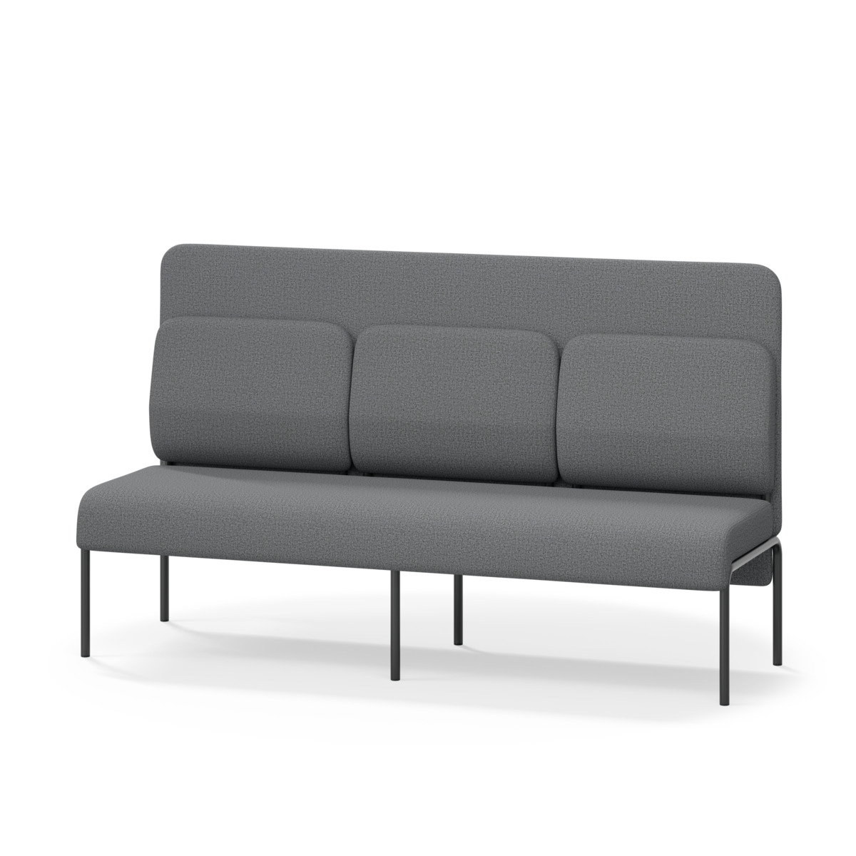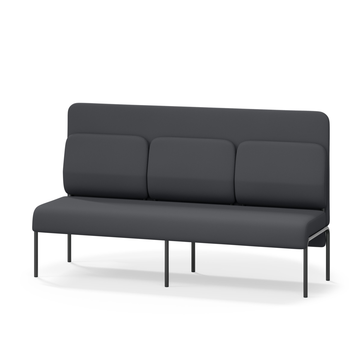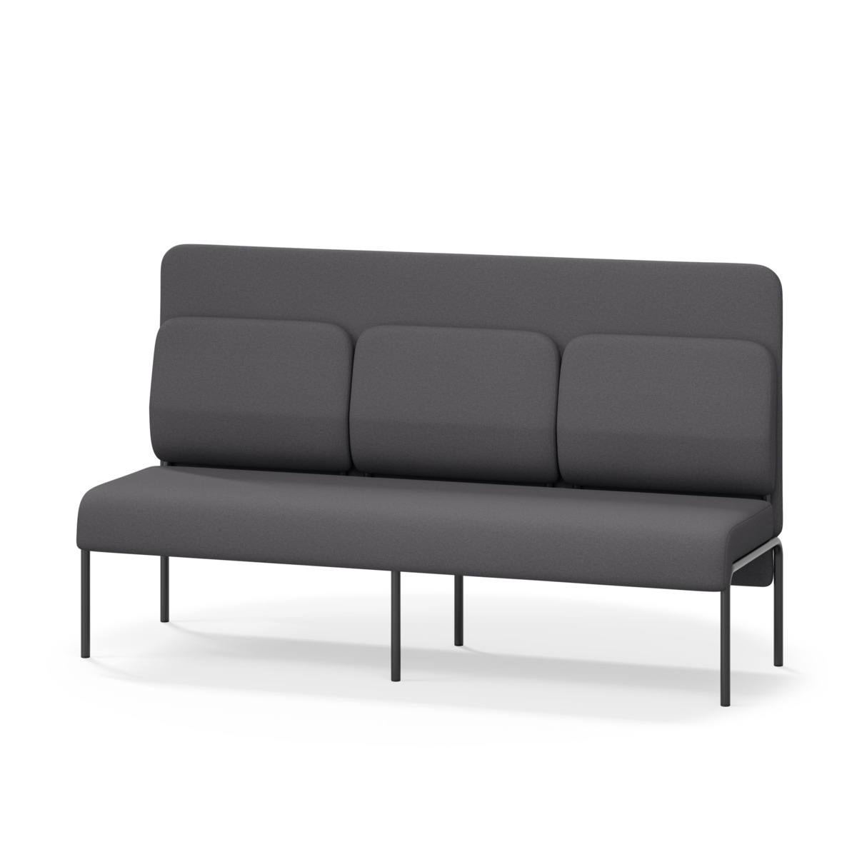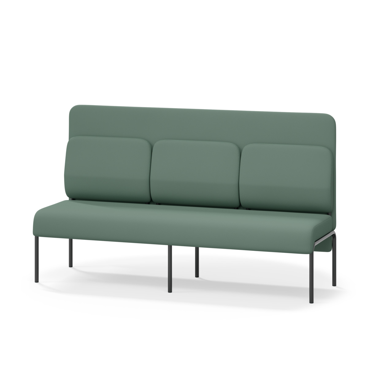 3-sitsig soffmodul med ergonomiskt designad ryggkudde och ljudabsorberande panel. Soffsystemet är särskilt utformat för att skapa platsbesparande moduler för studiero, trygghet, gemenskap och inkludering i skolan. Vi har minimerat materialanvändningen och skapat en cirkulär produkt där alla delar kan bytas ut. Soffan har smulgap och högt metallstativ som underlättar vid städning, samt avtagbar klädsel på dynor och paneler. Stomme av plywood med stoppning av kallskum. Stativ i pulverlackad metall med ställfötter som gör att soffan står stadigt även på ojämna underlag. Design: Sigrid Strömgren