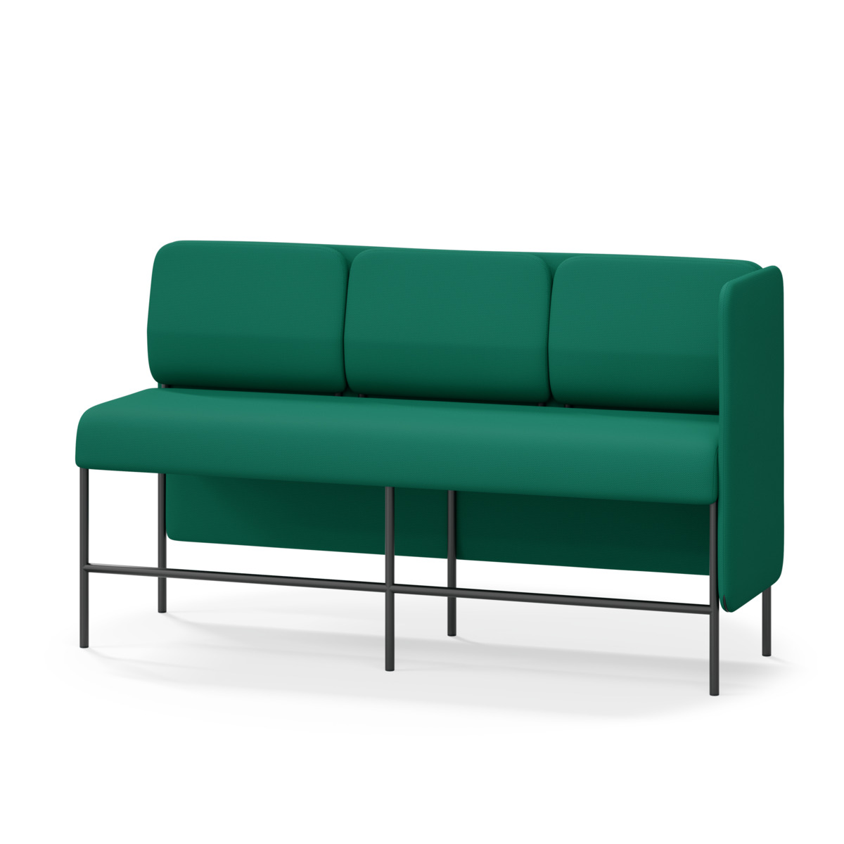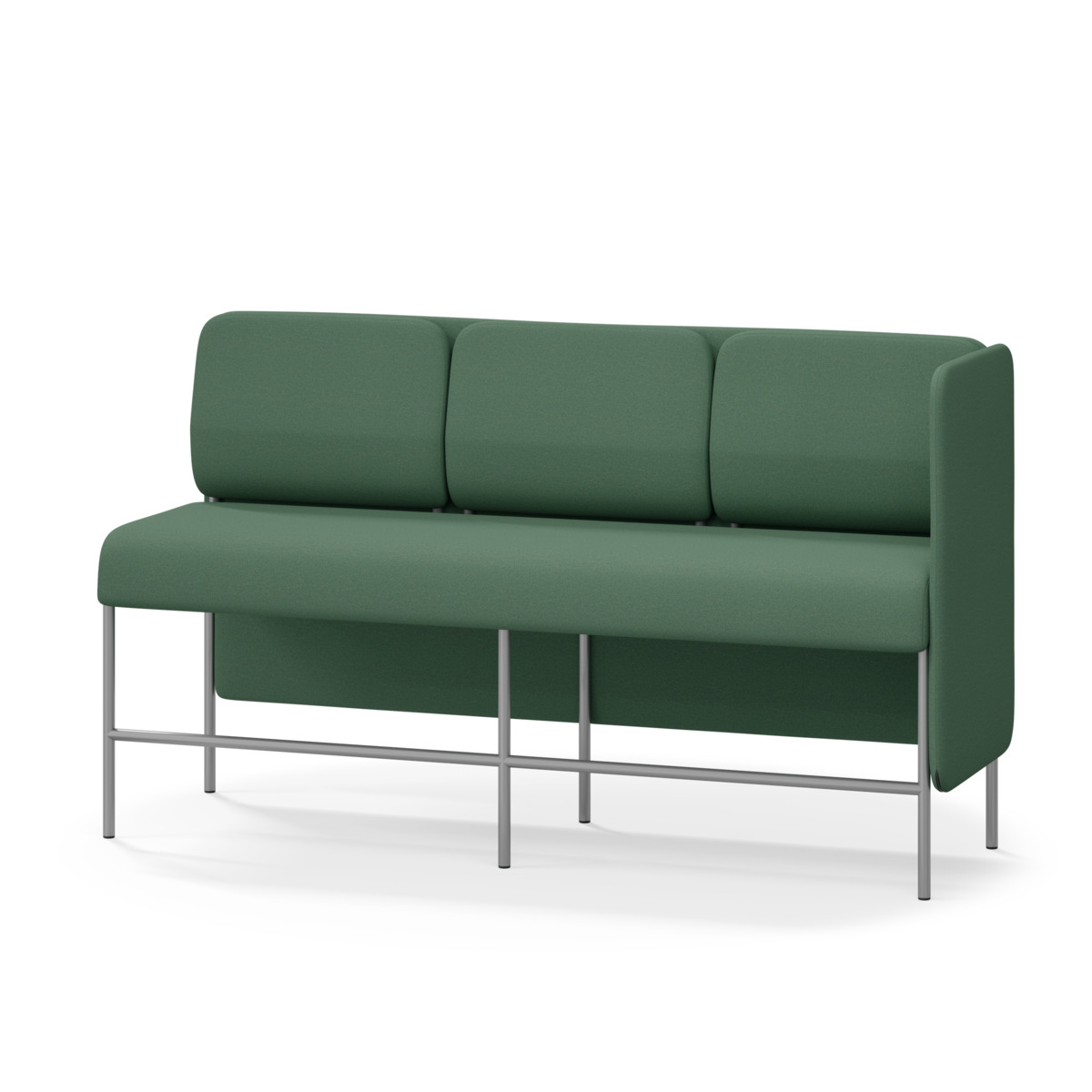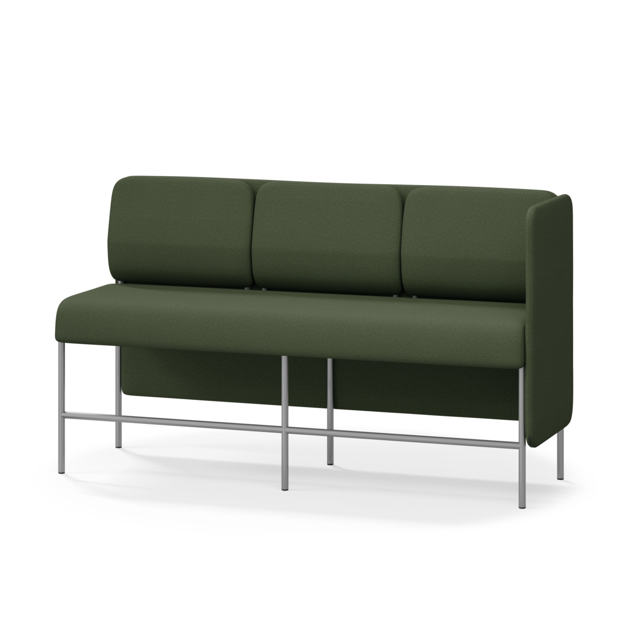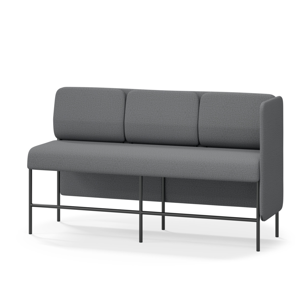 3-sitsig soffmodul med ergonomiskt designad ryggkudde och ljudabsorberande panel. Soffsystemet är särskilt utformat för att skapa platsbesparande moduler för studiero, trygghet, gemenskap och inkludering i skolan. Vi har minimerat materialanvändningen och skapat en cirkulär produkt där alla delar kan bytas ut. Soffan har smulgap och högt metallstativ som underlättar vid städning, samt avtagbar klädsel på dynor och paneler. Stomme av plywood med stoppning av kallskum. Stativ i pulverlackad metall med ställfötter som gör att soffan står stadigt även på ojämna underlag. Design: Sigrid Strömgren