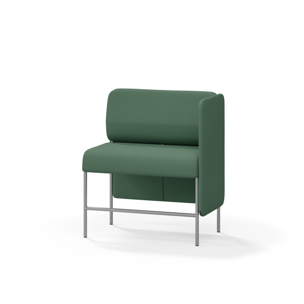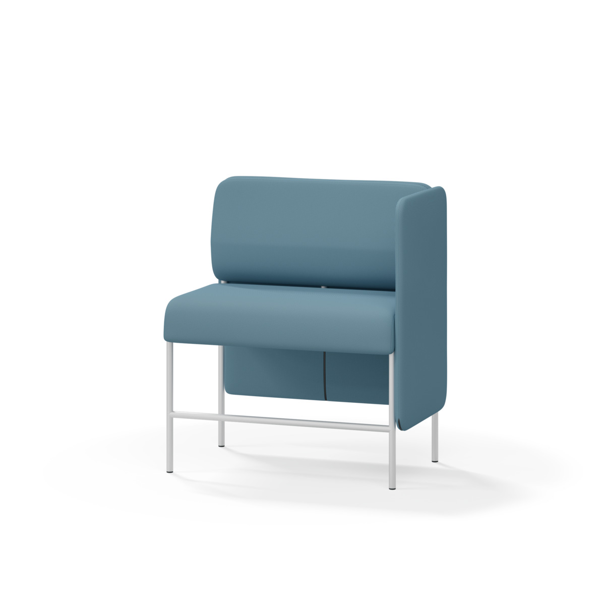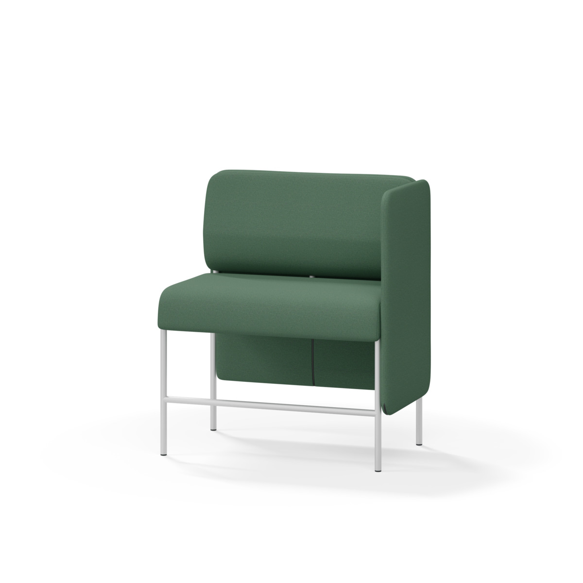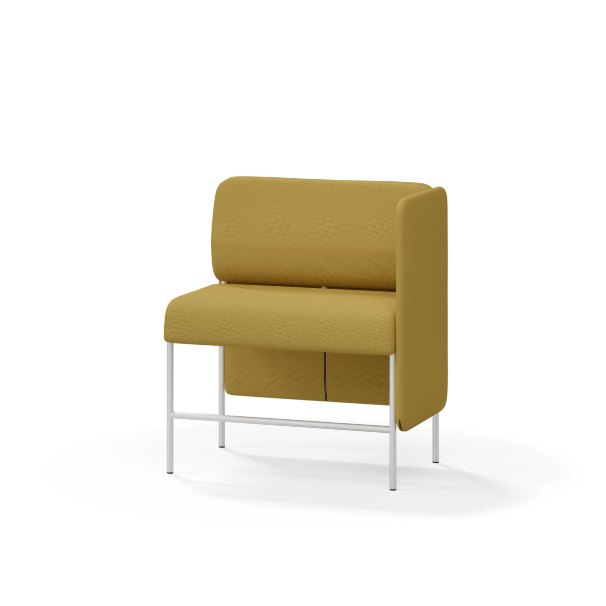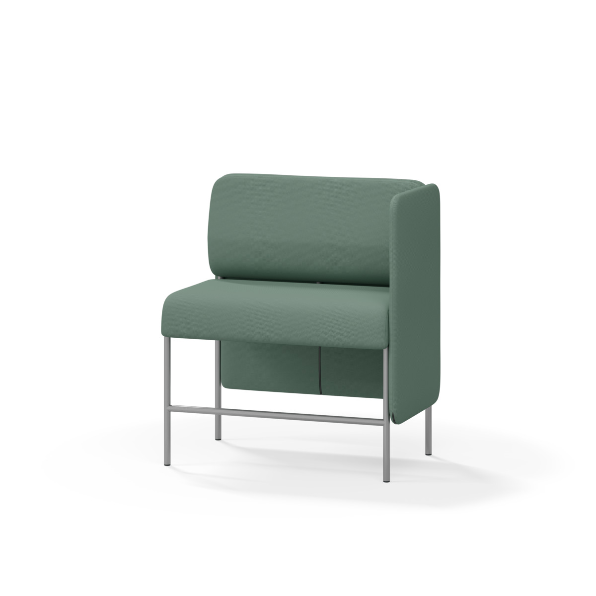 1-sitsig soffmodul med ergonomiskt designad ryggkudde och ljudabsorberande panel. Soffsystemet är särskilt utformat för att skapa platsbesparande moduler för studiero, trygghet, gemenskap och inkludering i skolan. Vi har minimerat materialanvändningen och skapat en cirkulär produkt där alla delar kan bytas ut. Soffan har smulgap och högt metallstativ som underlättar vid städning, samt avtagbar klädsel på dynor och paneler. Stomme av plywood med stoppning av kallskum. Stativ i pulverlackad metall med ställfötter som gör att soffan står stadigt även på ojämna underlag. Design: Sigrid Strömgren