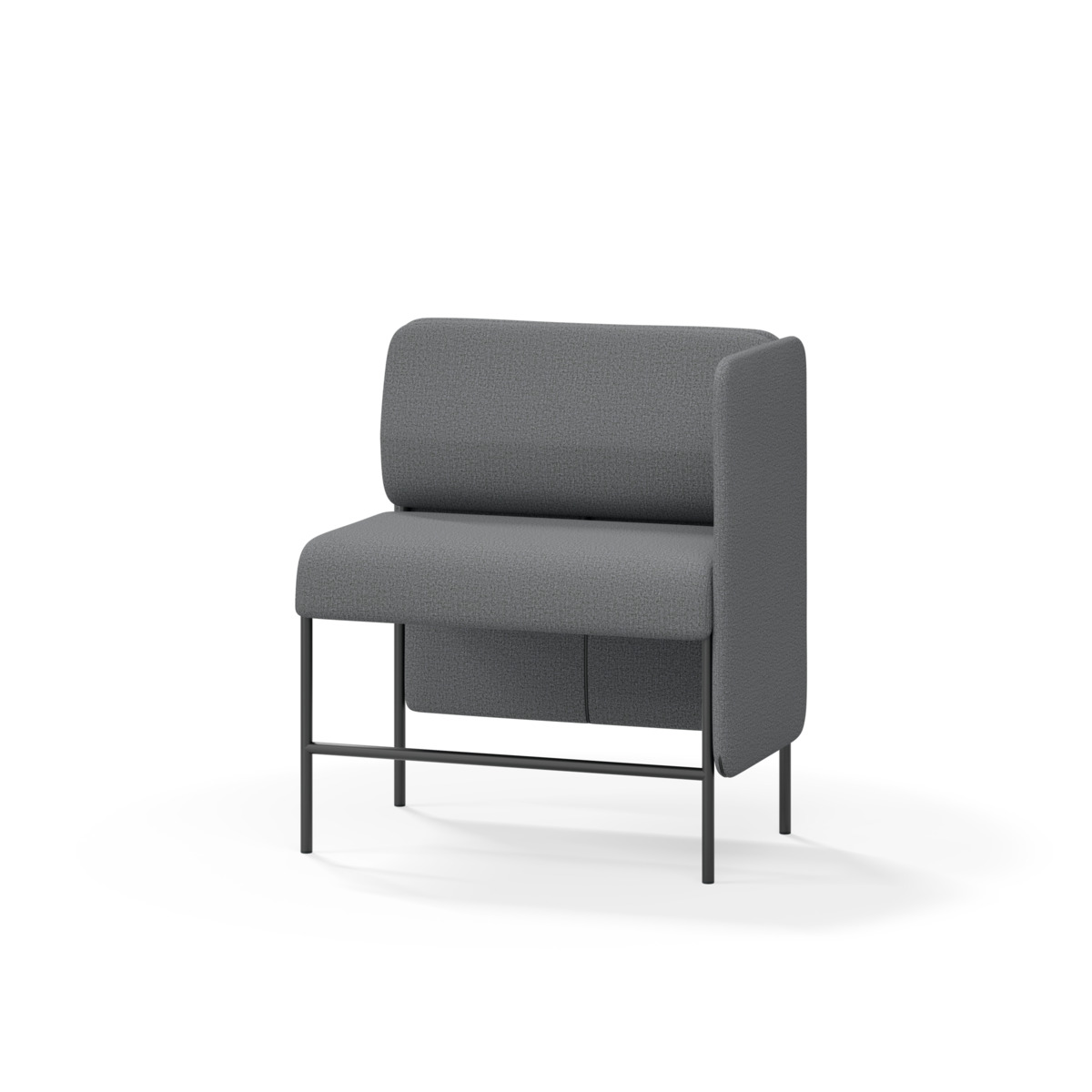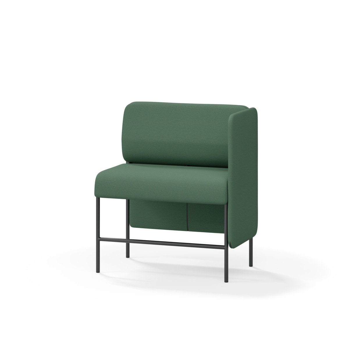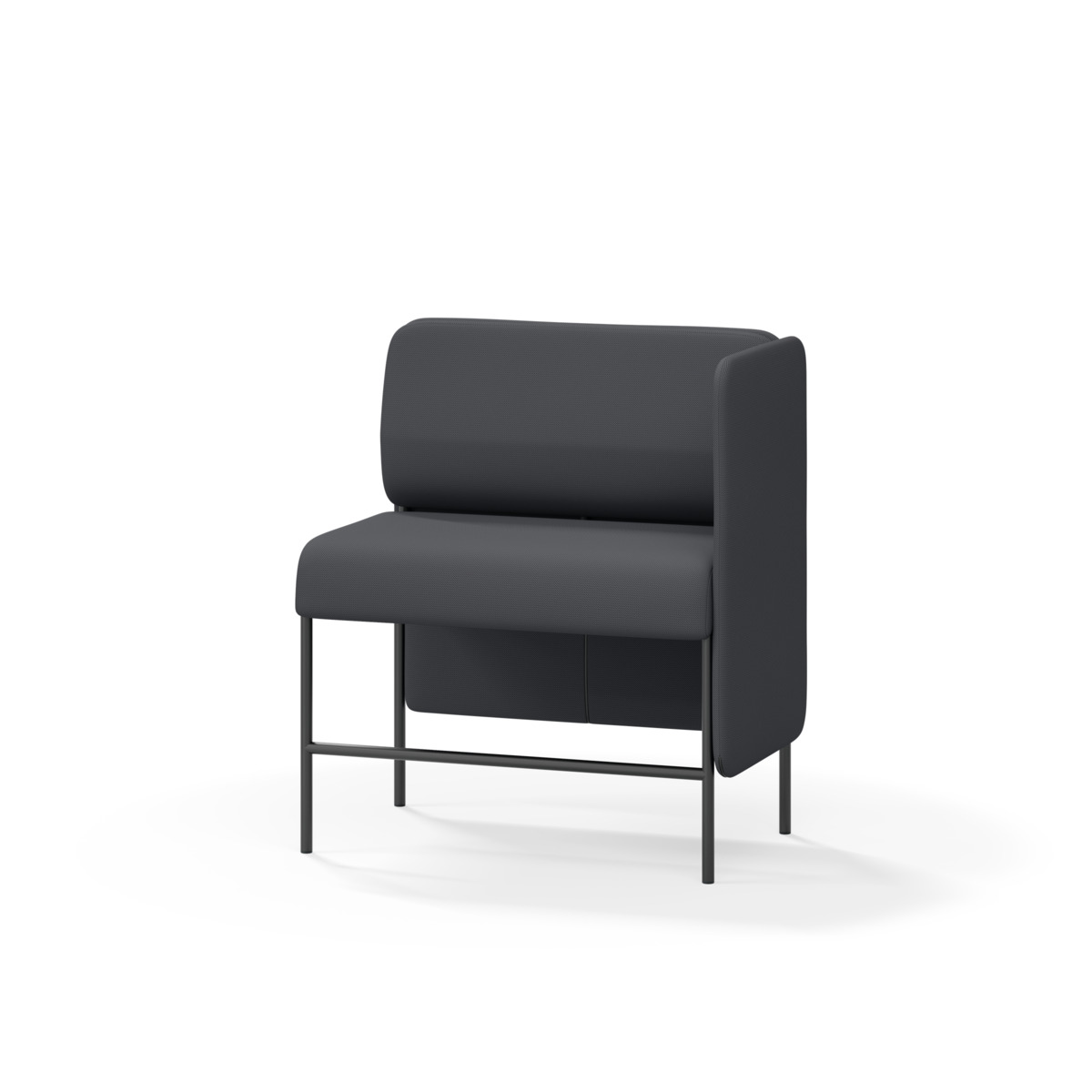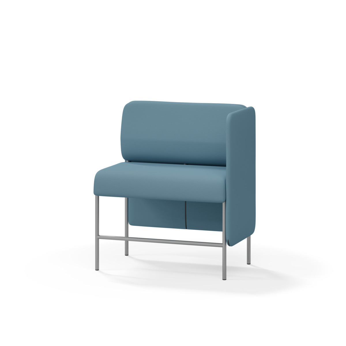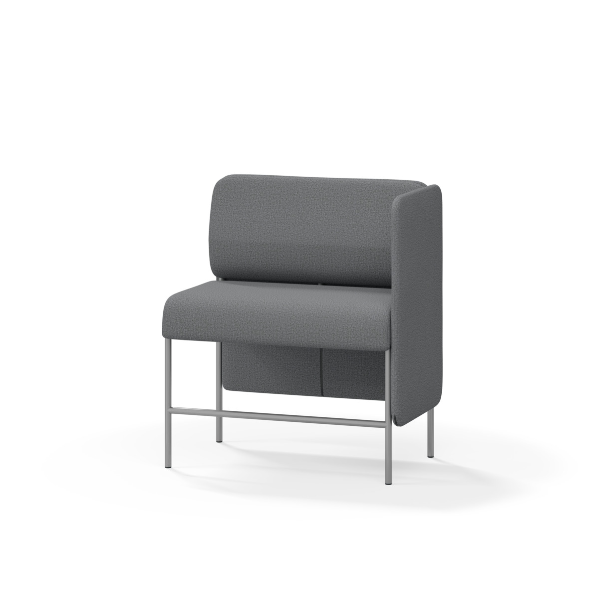 1-sitsig soffmodul med ergonomiskt designad ryggkudde och ljudabsorberande panel. Soffsystemet är särskilt utformat för att skapa platsbesparande moduler för studiero, trygghet, gemenskap och inkludering i skolan. Vi har minimerat materialanvändningen och skapat en cirkulär produkt där alla delar kan bytas ut. Soffan har smulgap och högt metallstativ som underlättar vid städning, samt avtagbar klädsel på dynor och paneler. Stomme av plywood med stoppning av kallskum. Stativ i pulverlackad metall med ställfötter som gör att soffan står stadigt även på ojämna underlag. Design: Sigrid Strömgren