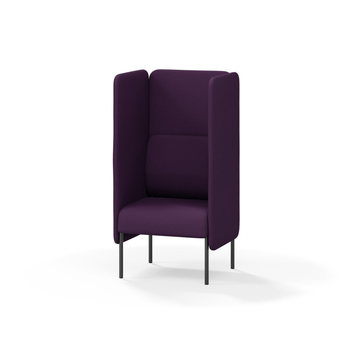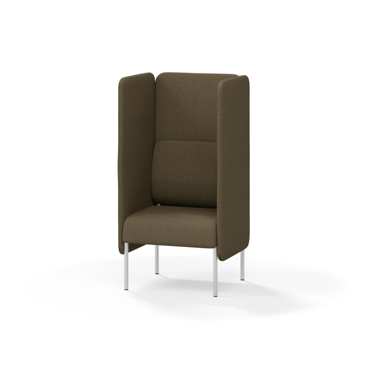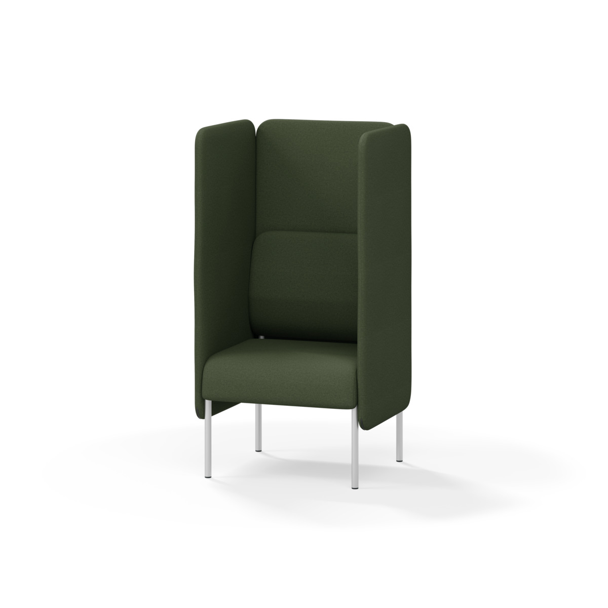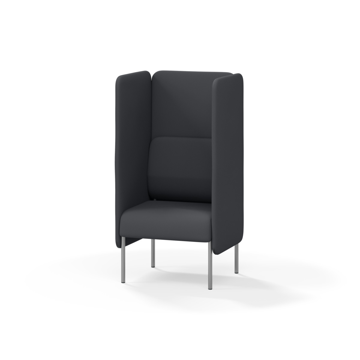 Omslutande fåtölj som tack vare sina höga sidor har en ljuddämpande och avskärmande effekt, vilket gör att den lämpar sig för exempelvis mindre, privata möten eller telefonsamtal. De höga väggarna ger avskildhet från resten av rummet. Trästomme och stoppning i kallskum. Medar i pulverlackad metall. Färgval på rygg. Gavlar och sits alltid grå kulör i det tyg som väljs. Som tillval finns eluttag.