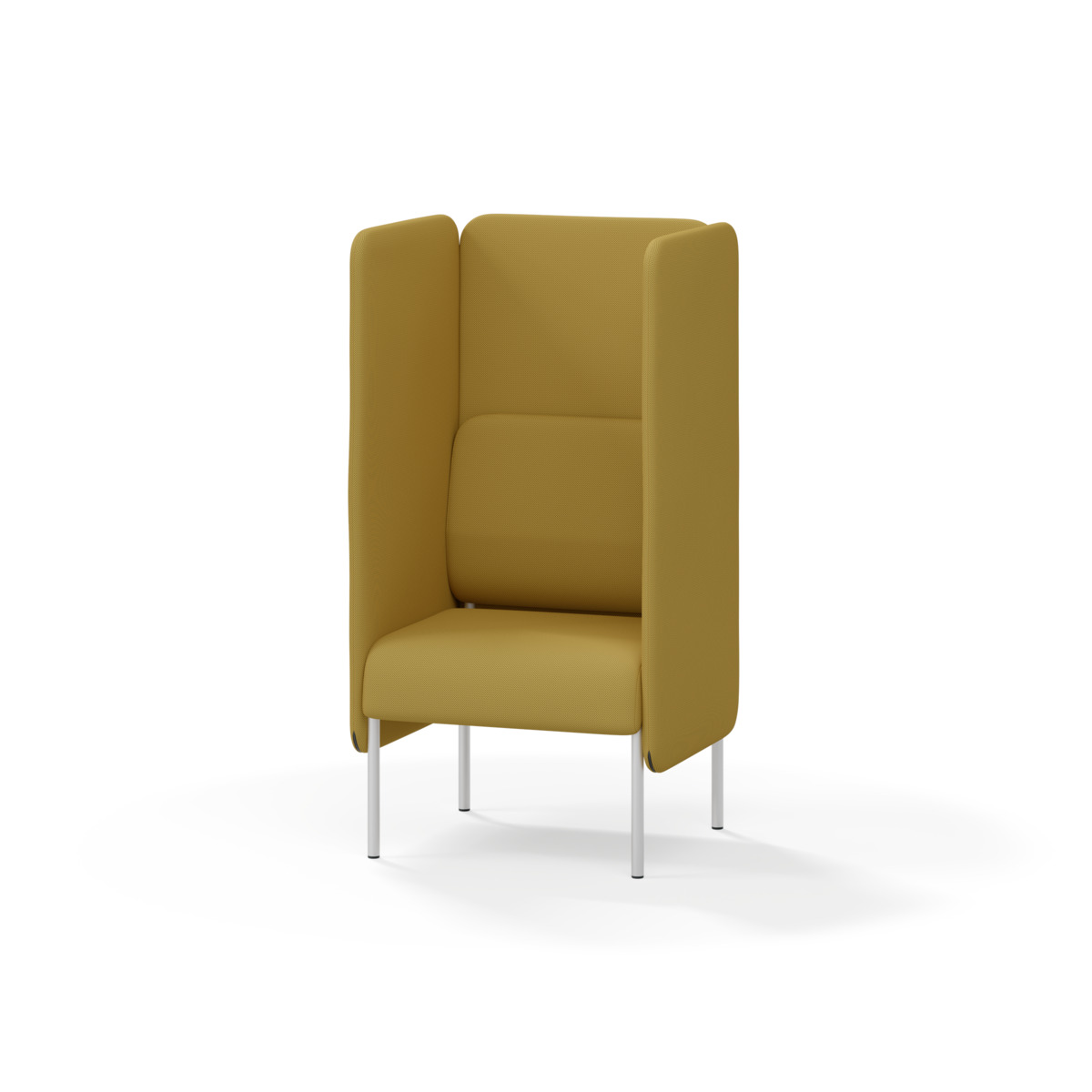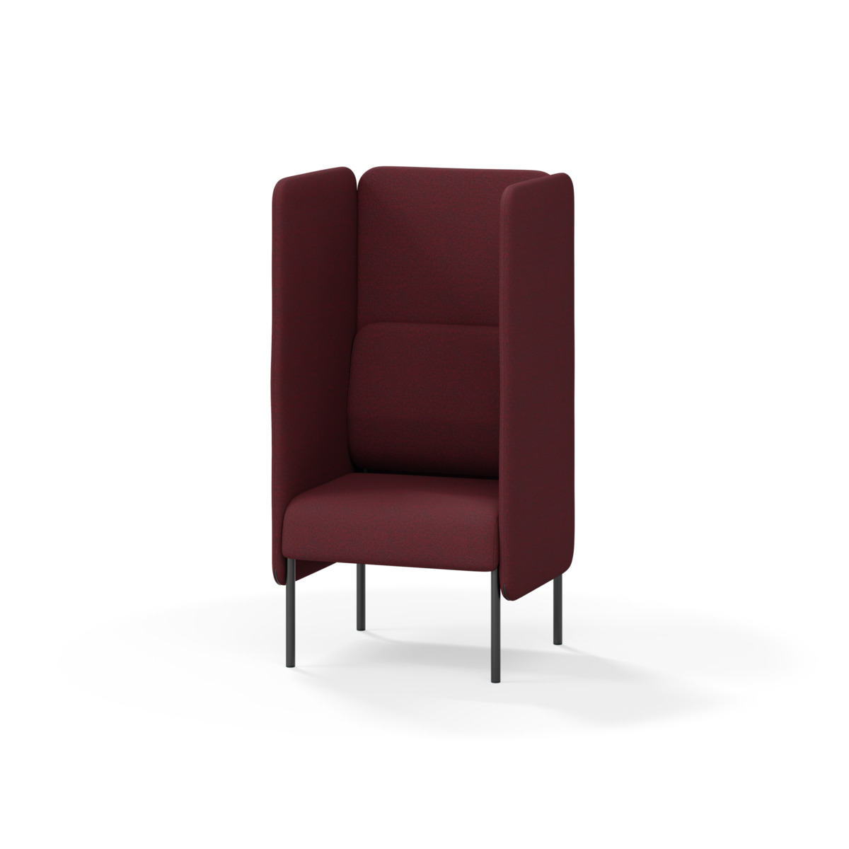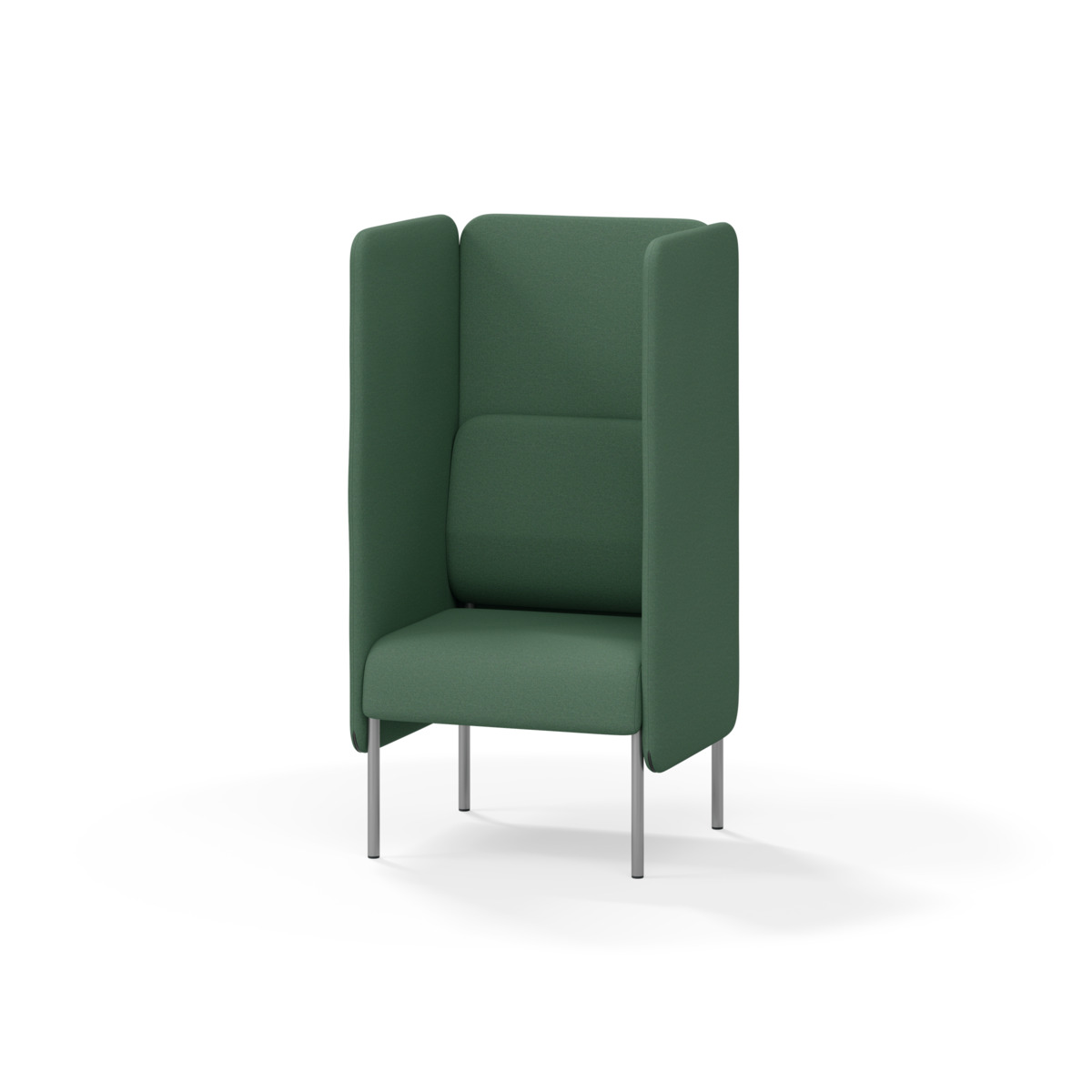 Omslutande fåtölj som tack vare sina höga sidor har en ljuddämpande och avskärmande effekt, vilket gör att den lämpar sig för exempelvis mindre, privata möten eller telefonsamtal. De höga väggarna ger avskildhet från resten av rummet. Trästomme och stoppning i kallskum. Medar i pulverlackad metall. Färgval på rygg. Gavlar och sits alltid grå kulör i det tyg som väljs. Som tillval finns eluttag.