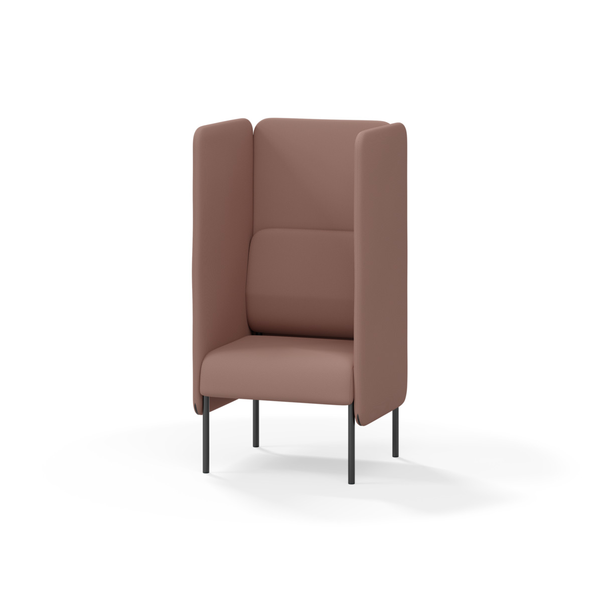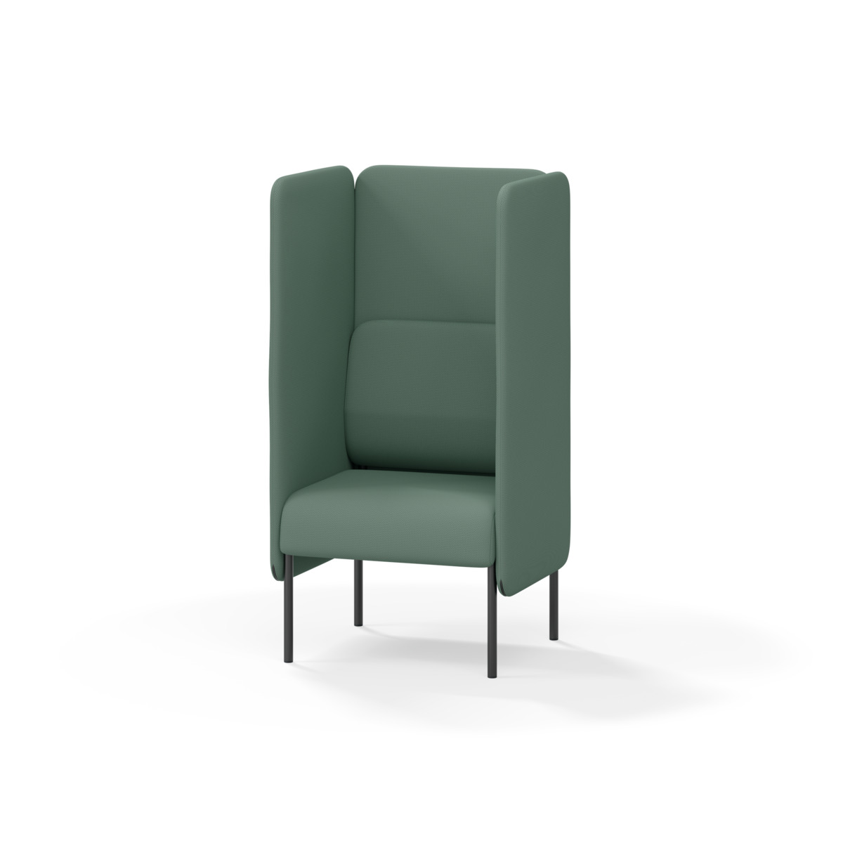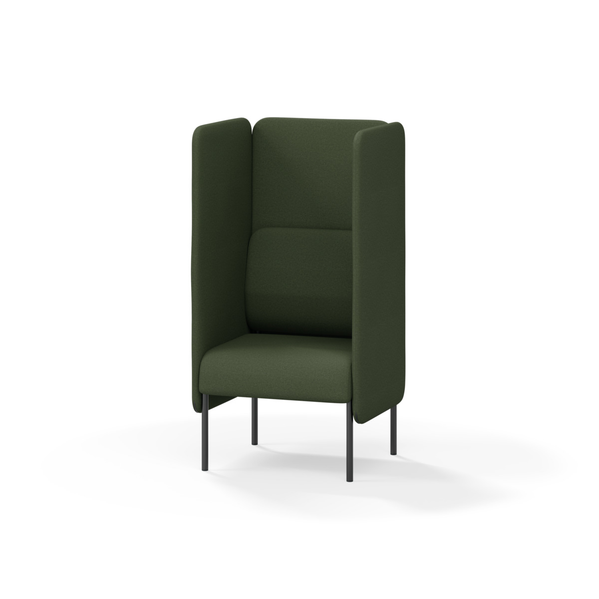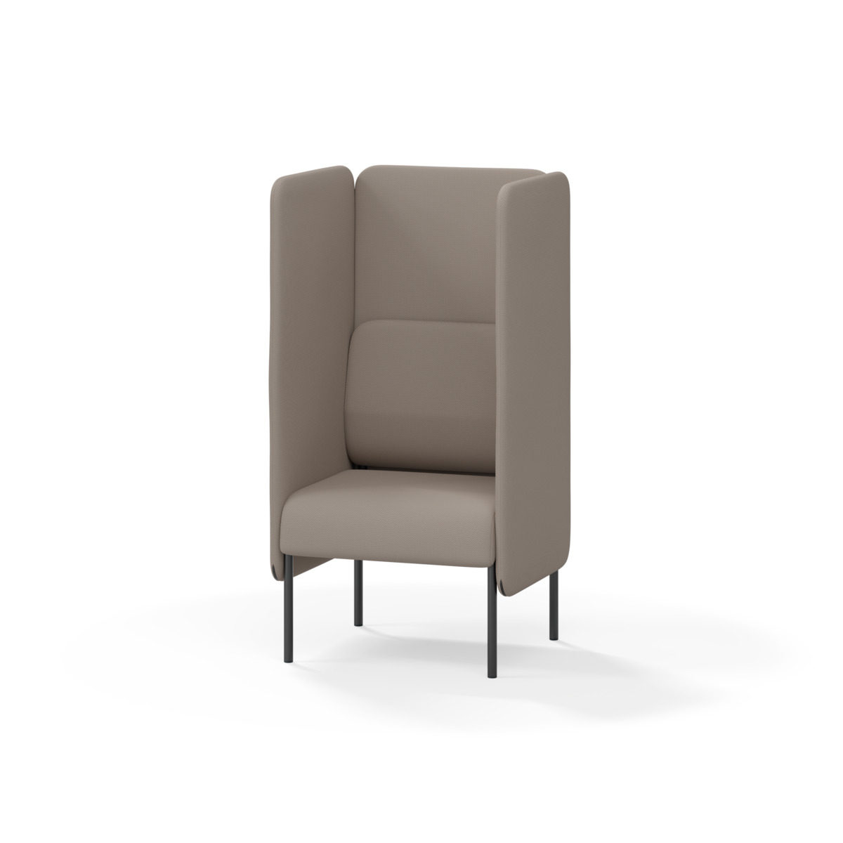 Omslutande fåtölj som tack vare sina höga sidor har en ljuddämpande och avskärmande effekt, vilket gör att den lämpar sig för exempelvis mindre, privata möten eller telefonsamtal. De höga väggarna ger avskildhet från resten av rummet. Trästomme och stoppning i kallskum. Medar i pulverlackad metall. Färgval på rygg. Gavlar och sits alltid grå kulör i det tyg som väljs. Som tillval finns eluttag.