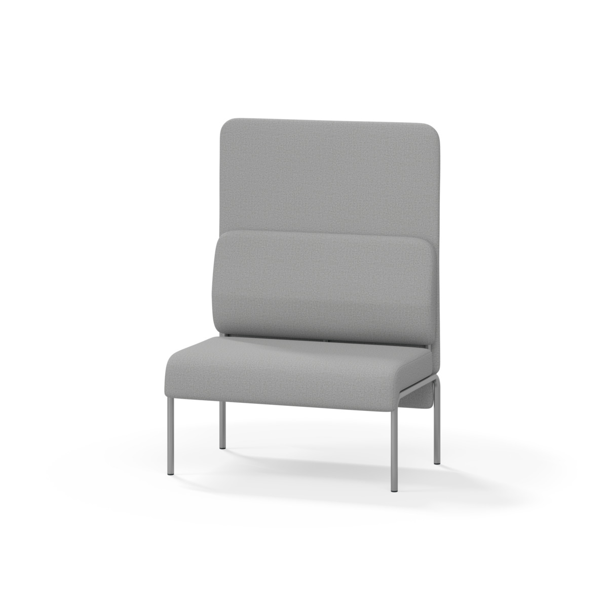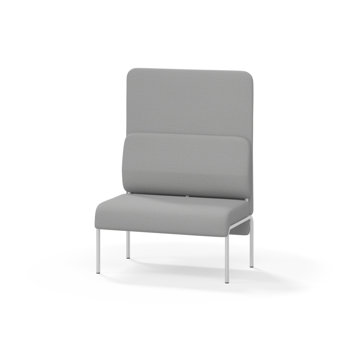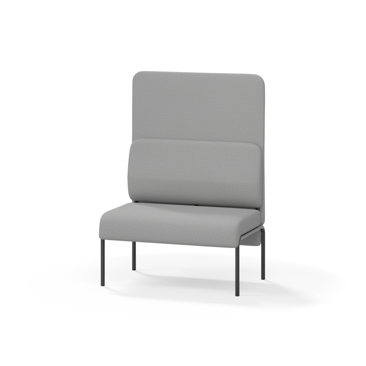 1-sitsig soffmodul med ergonomiskt designad ryggkudde och ljudabsorberande panel. Soffsystemet är särskilt utformat för att skapa platsbesparande moduler för studiero, trygghet, gemenskap och inkludering i skolan. Vi har minimerat materialanvändningen och skapat en cirkulär produkt där alla delar kan bytas ut. Soffan har smulgap och högt metallstativ som underlättar vid städning, samt avtagbar klädsel på dynor och paneler. Stomme av plywood med stoppning av kallskum. Stativ i pulverlackad metall med ställfötter som gör att soffan står stadigt även på ojämna underlag. Design: Sigrid Strömgren