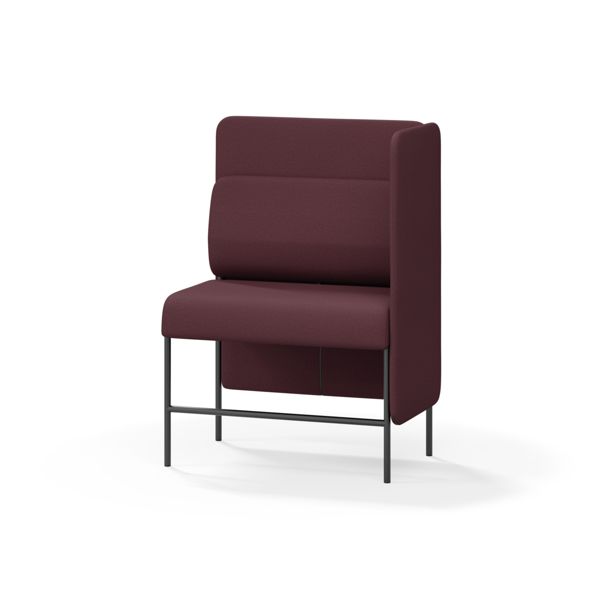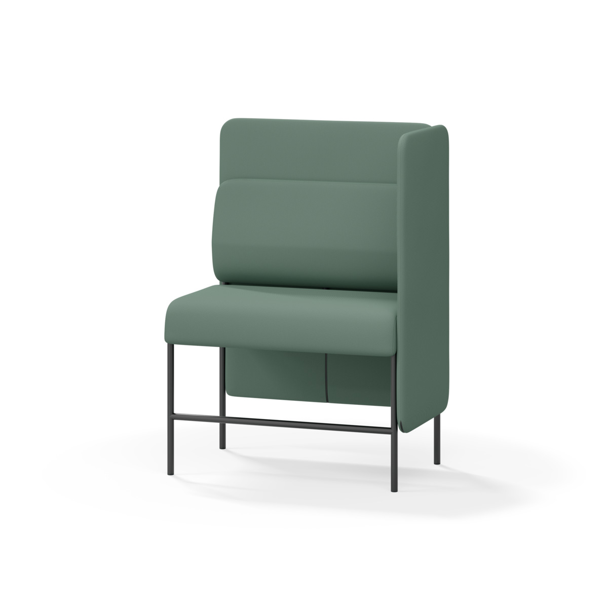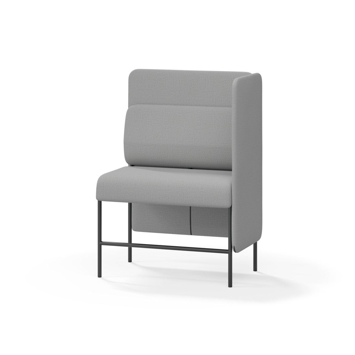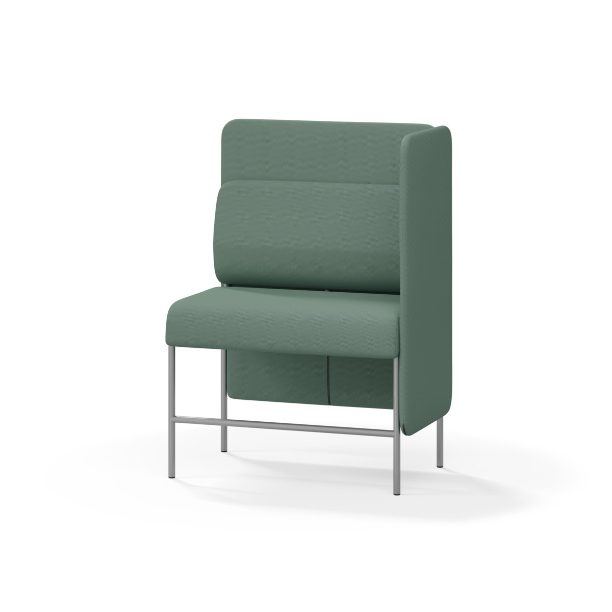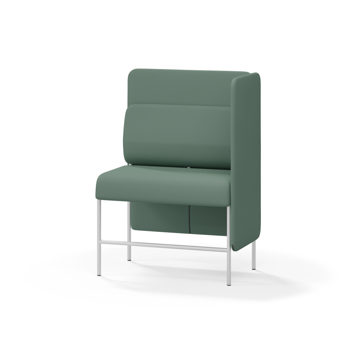 1-sitsig soffmodul med ergonomiskt designad ryggkudde och ljudabsorberande panel. Soffsystemet är särskilt utformat för att skapa platsbesparande moduler för studiero, trygghet, gemenskap och inkludering i skolan. Vi har minimerat materialanvändningen och skapat en cirkulär produkt där alla delar kan bytas ut. Soffan har smulgap och högt metallstativ som underlättar vid städning, samt avtagbar klädsel på dynor och paneler. Stomme av plywood med stoppning av kallskum. Stativ i pulverlackad metall med ställfötter som gör att soffan står stadigt även på ojämna underlag. Design: Sigrid Strömgren