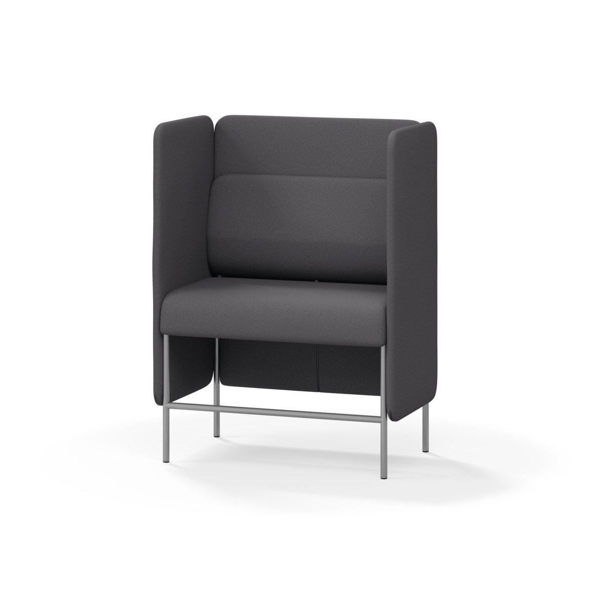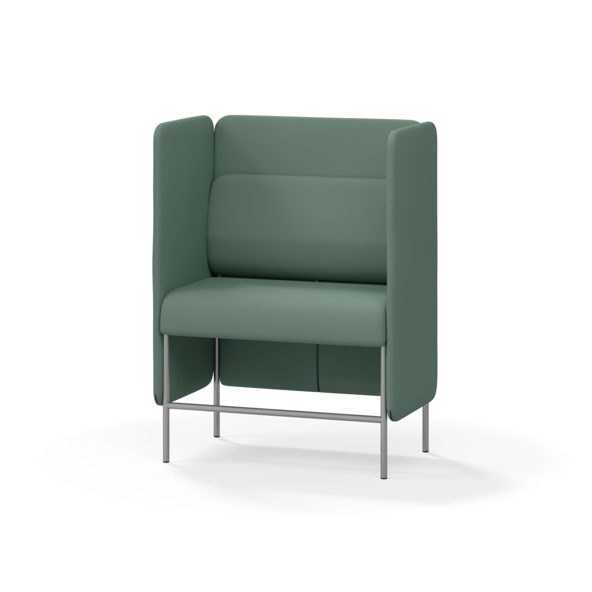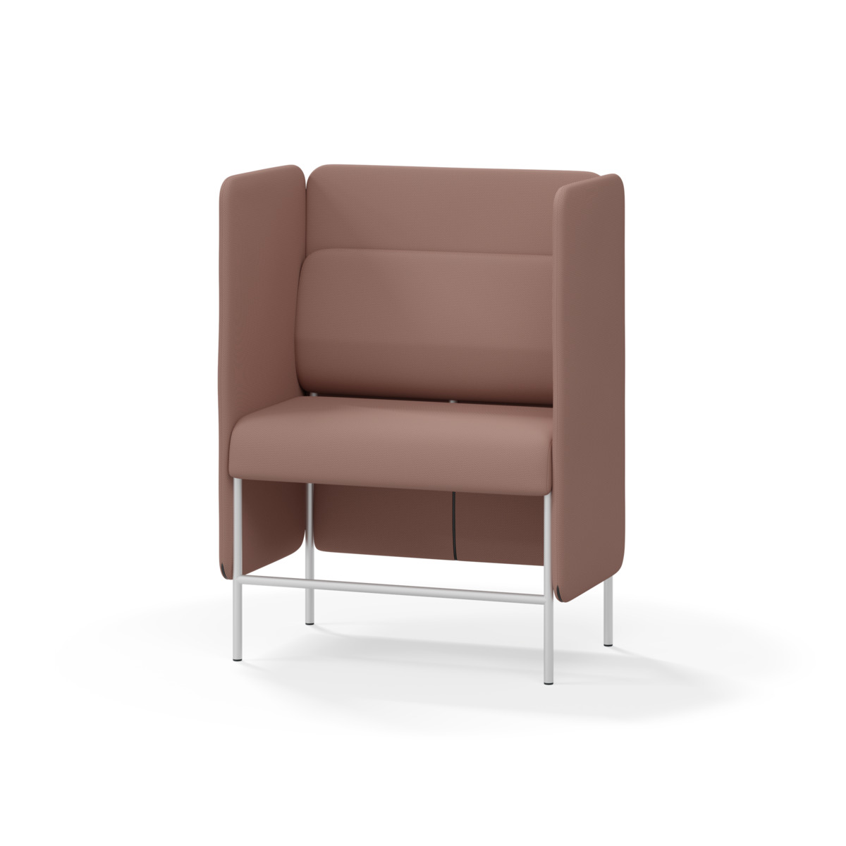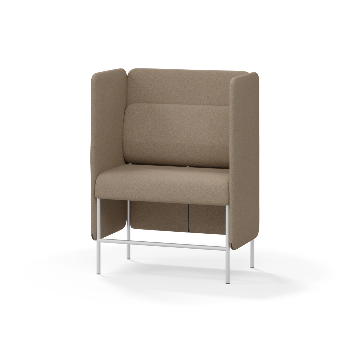 1-sitsig soffmodul med ergonomiskt designad ryggkudde och ljudabsorberande panel. Soffsystemet är särskilt utformat för att skapa platsbesparande moduler för studiero, trygghet, gemenskap och inkludering i skolan. Vi har minimerat materialanvändningen och skapat en cirkulär produkt där alla delar kan bytas ut. Soffan har smulgap och högt metallstativ som underlättar vid städning, samt avtagbar klädsel på dynor och paneler. Stomme av plywood med stoppning av kallskum. Stativ i pulverlackad metall med ställfötter som gör att soffan står stadigt även på ojämna underlag. Design: Sigrid Strömgren