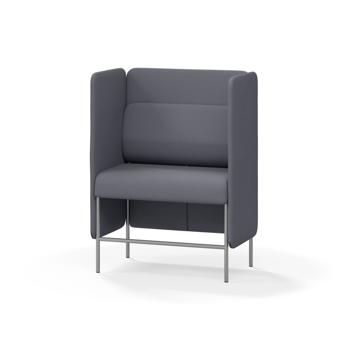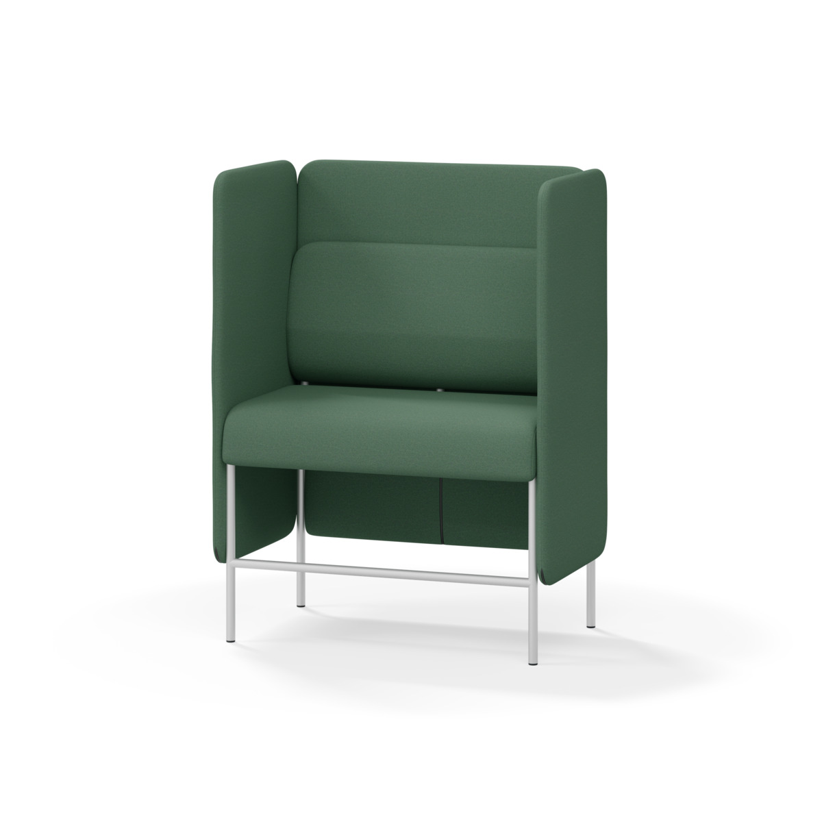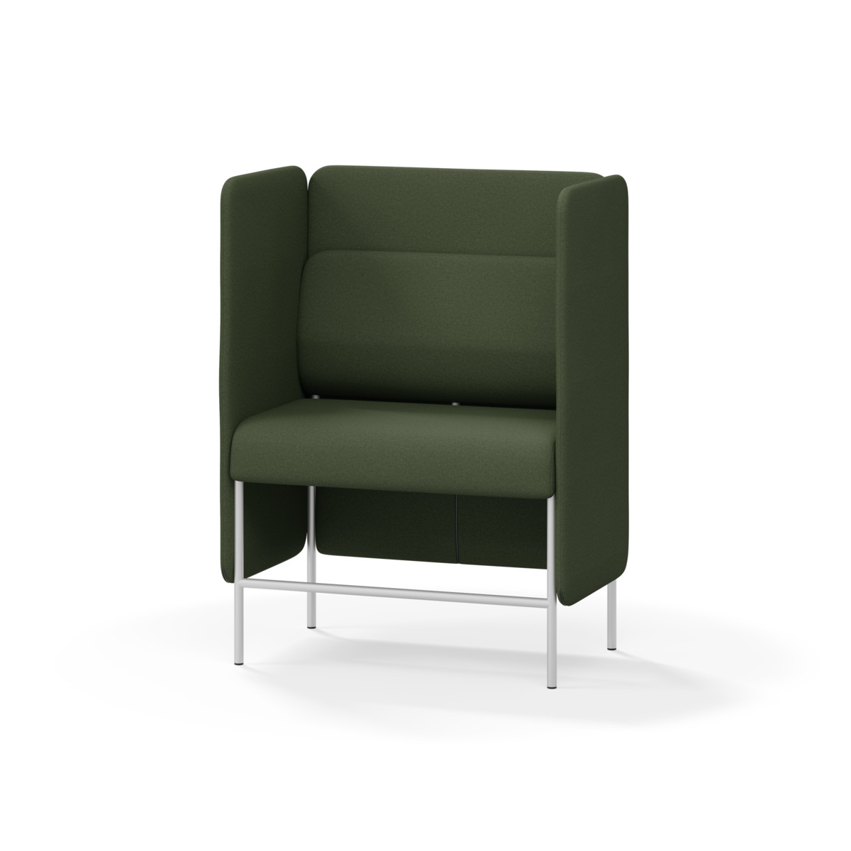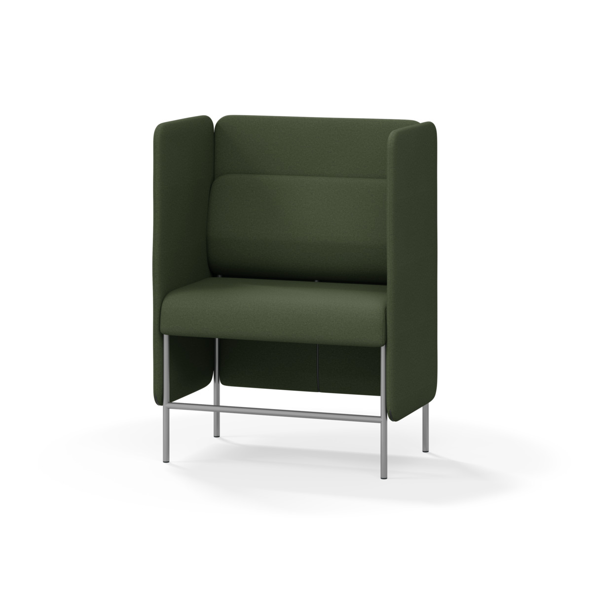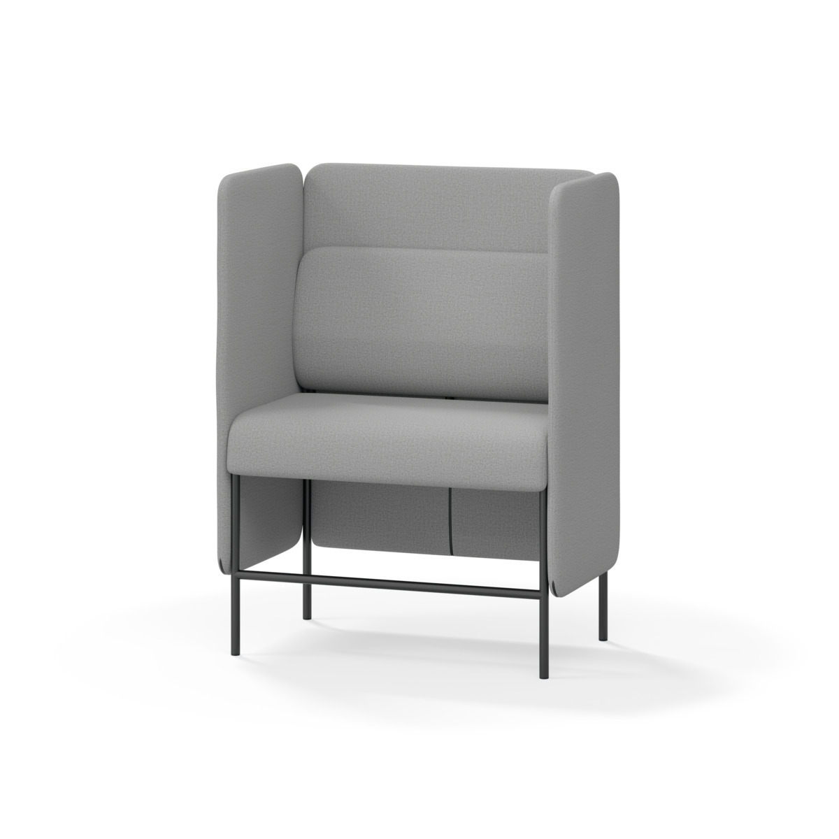 1-sitsig soffmodul med ergonomiskt designad ryggkudde och ljudabsorberande panel. Soffsystemet är särskilt utformat för att skapa platsbesparande moduler för studiero, trygghet, gemenskap och inkludering i skolan. Vi har minimerat materialanvändningen och skapat en cirkulär produkt där alla delar kan bytas ut. Soffan har smulgap och högt metallstativ som underlättar vid städning, samt avtagbar klädsel på dynor och paneler. Stomme av plywood med stoppning av kallskum. Stativ i pulverlackad metall med ställfötter som gör att soffan står stadigt även på ojämna underlag. Design: Sigrid Strömgren