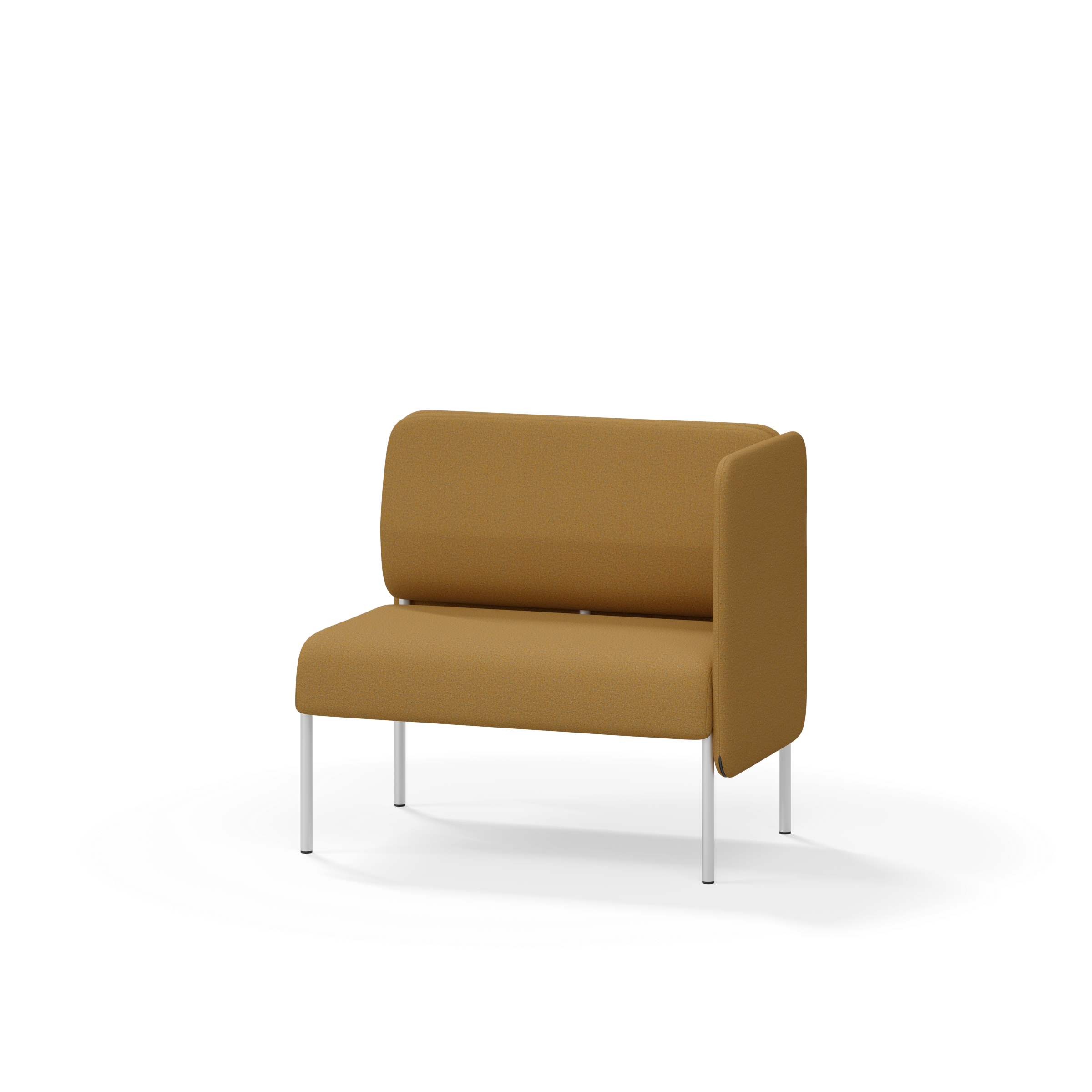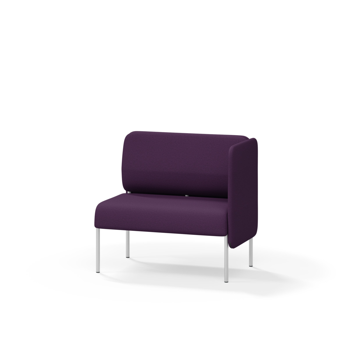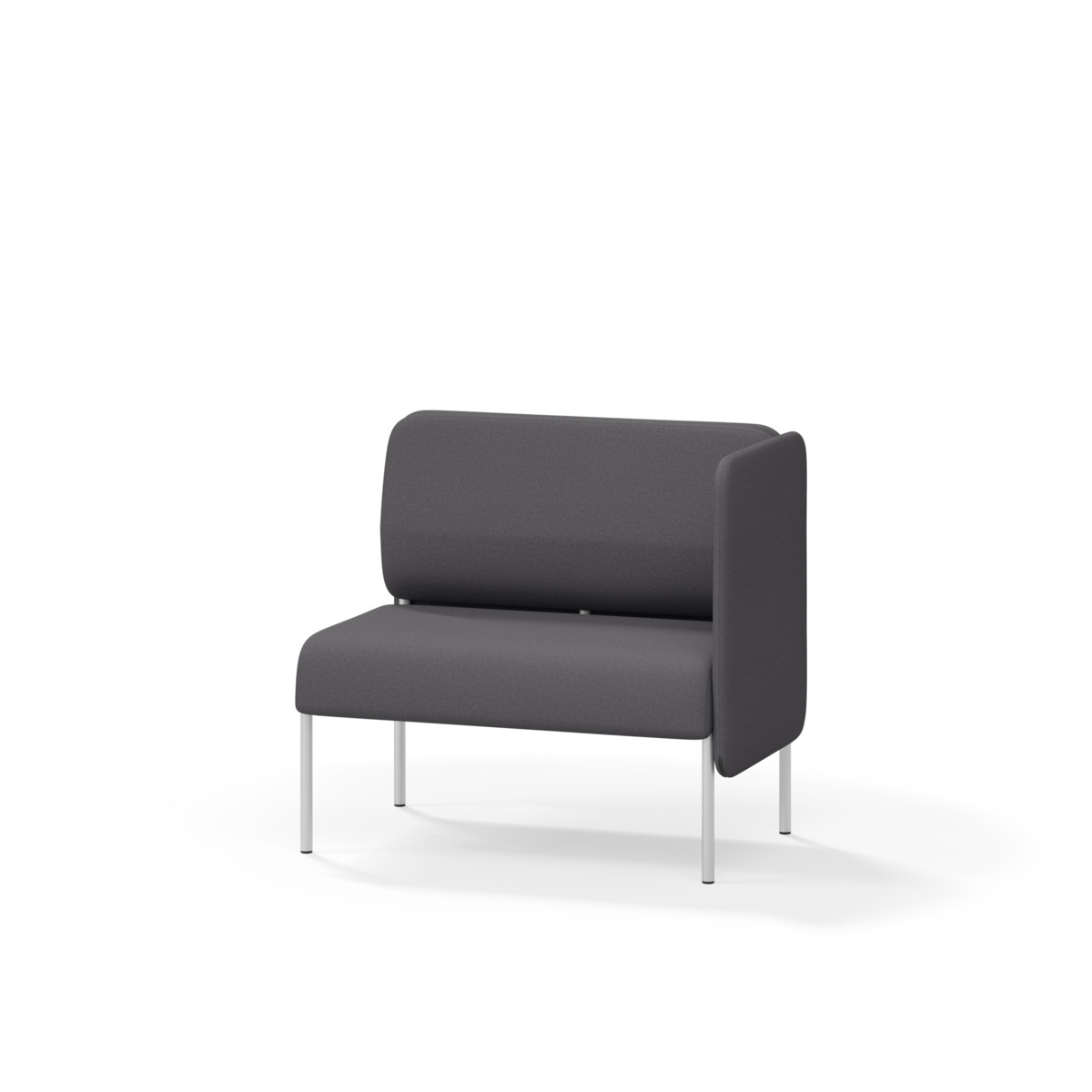1-sitsig soffmodul med ergonomiskt designad ryggkudde och ljudabsorberande panel. Soffsystemet är särskilt utformat för att skapa platsbesparande moduler för studiero, trygghet, gemenskap och inkludering i skolan. Vi har minimerat materialanvändningen och skapat en cirkulär produkt där alla delar kan bytas ut. Soffan har smulgap och högt metallstativ som underlättar vid städning, samt avtagbar klädsel på dynor och paneler. Stomme av plywood med stoppning av kallskum. Stativ i pulverlackad metall med ställfötter som gör att soffan står stadigt även på ojämna underlag. Design: Sigrid Strömgren