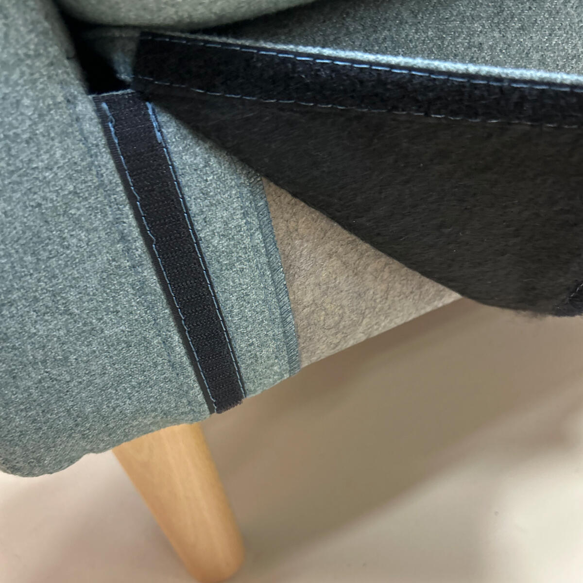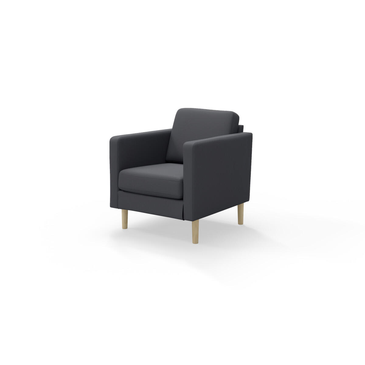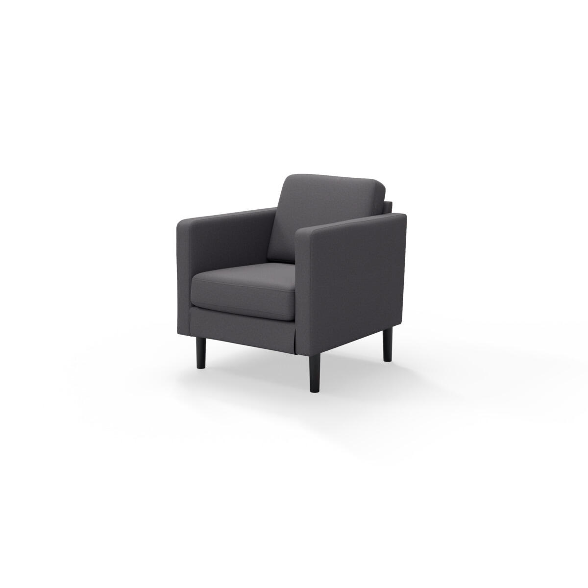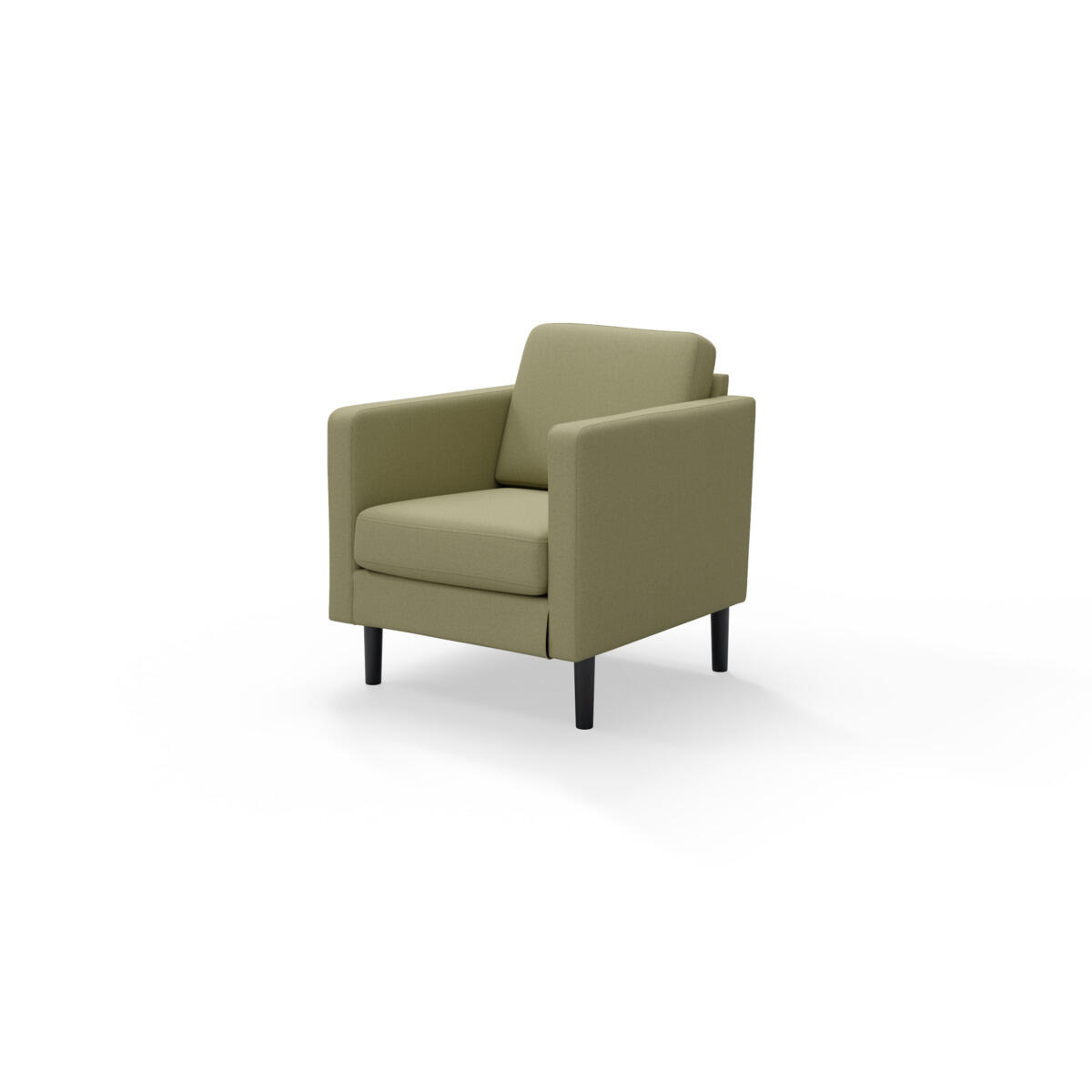 En modern och tidlös fåtölj som med sitt enkla formspråk passar in i de flesta miljöer. Den raka utsidan gör det lätt att placera flera fåtöljer tätt intill varandra, exempelvis rygg mot rygg. Trästomme med nozagbotten och stoppning i kallskum. Stativ i pulverlackad metall. Avtagbart fodral på rygg- och sittdynor.