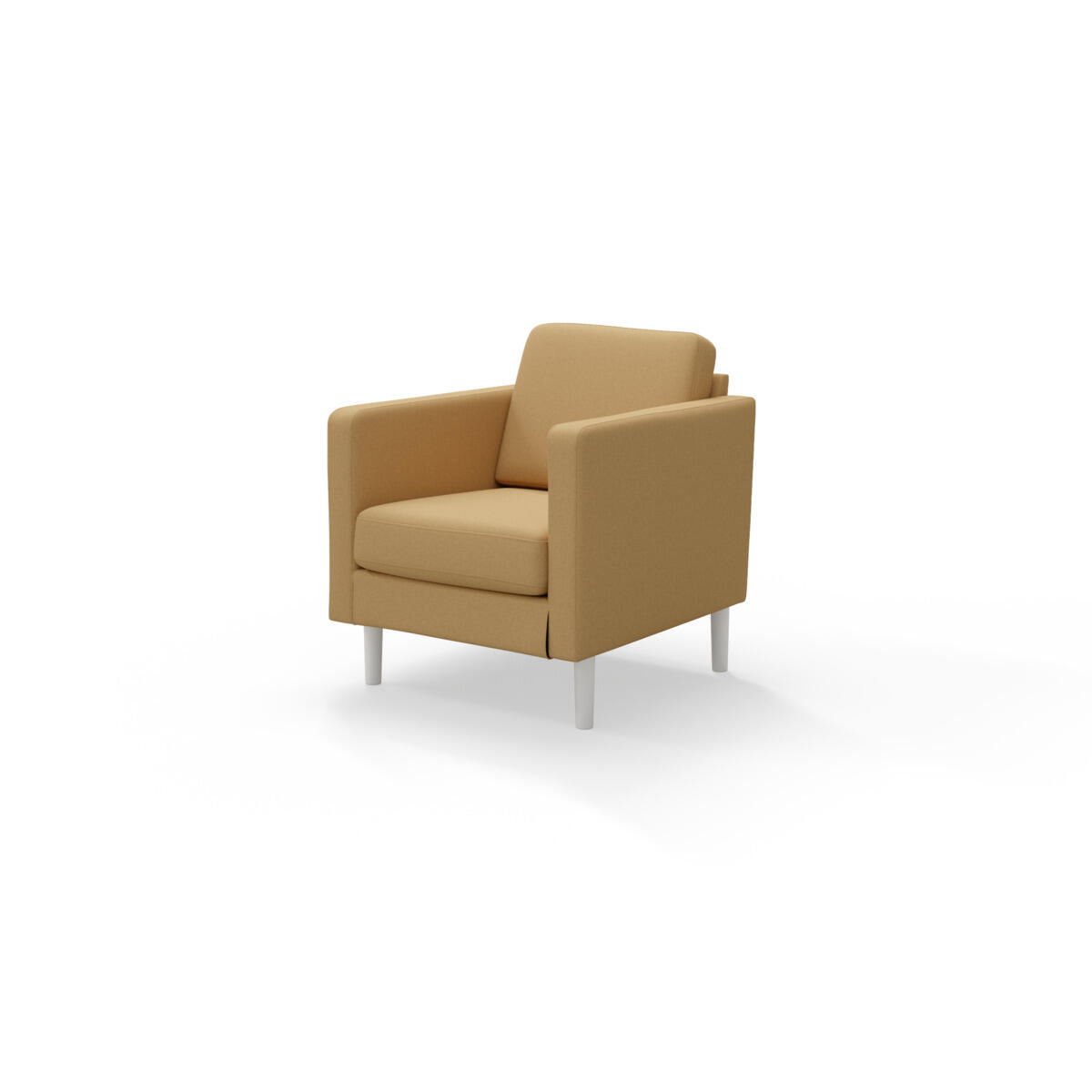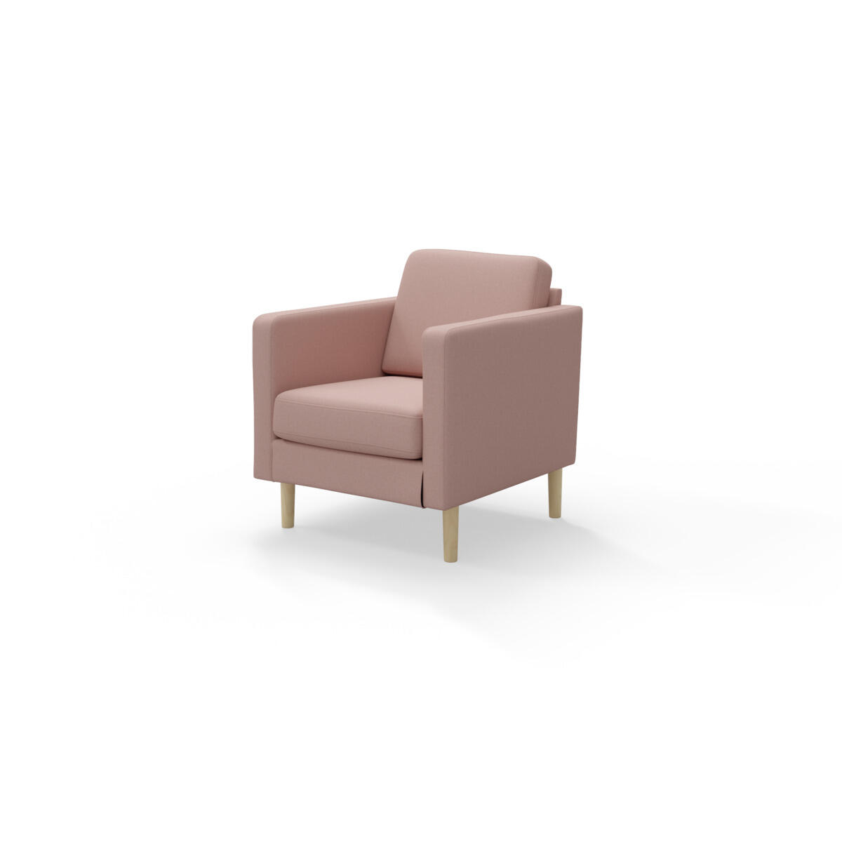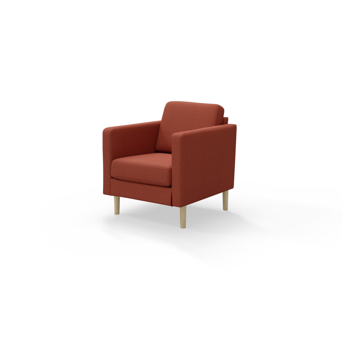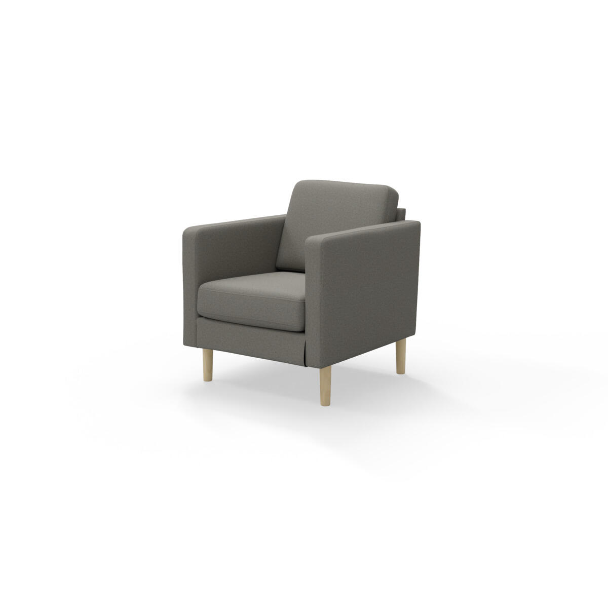 En fåtölj med stomme i massivt trä och nozagbotten för robust stöd och komfort. All klädsel på både stomme och dynor är avtagbar för att underlätta rengöring och underhåll. Enkel montering av ben.
