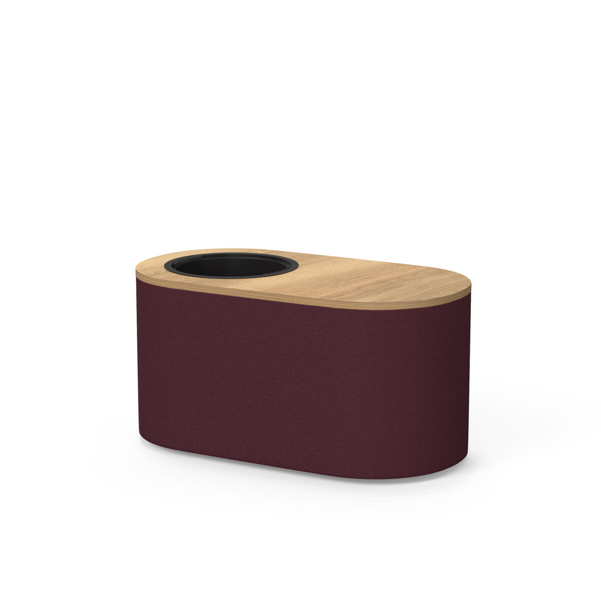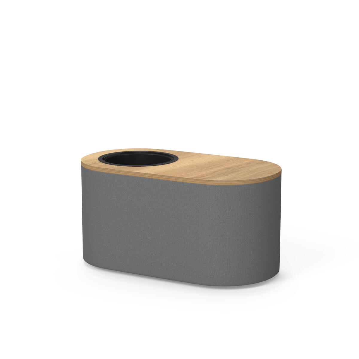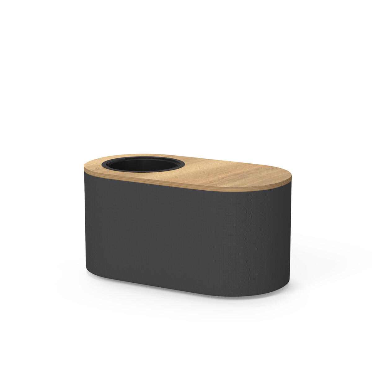 Sittpuffen är försedd med fast sidobord. Bordsskiva i laminat. Stativ i pulverlackad metall. Sittpuffen har trästomme och stoppning i kallskum. Försedd med glidfötter.