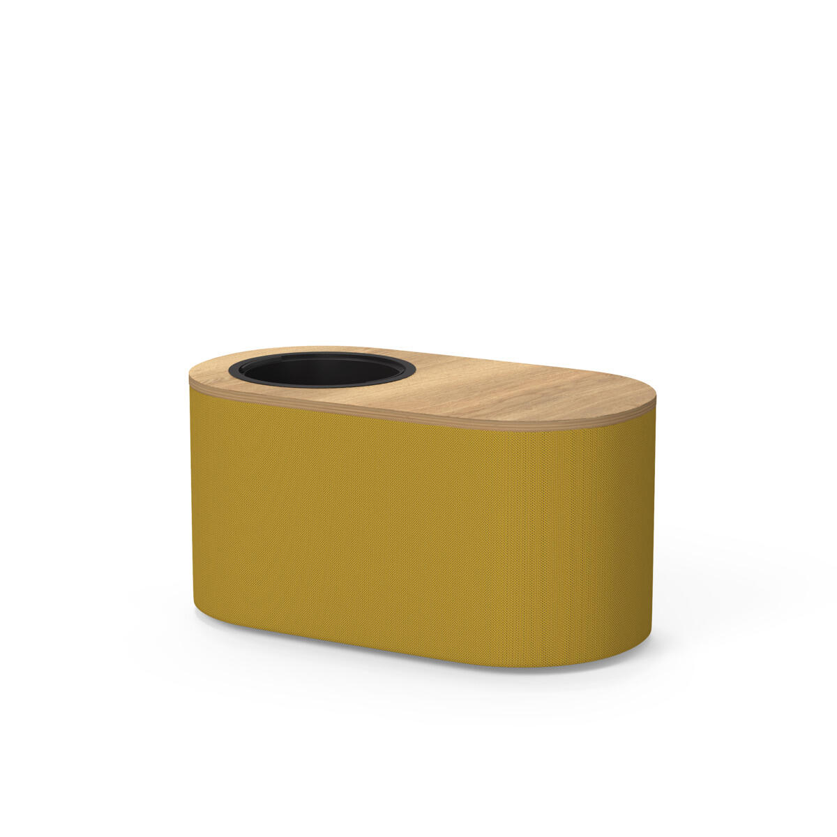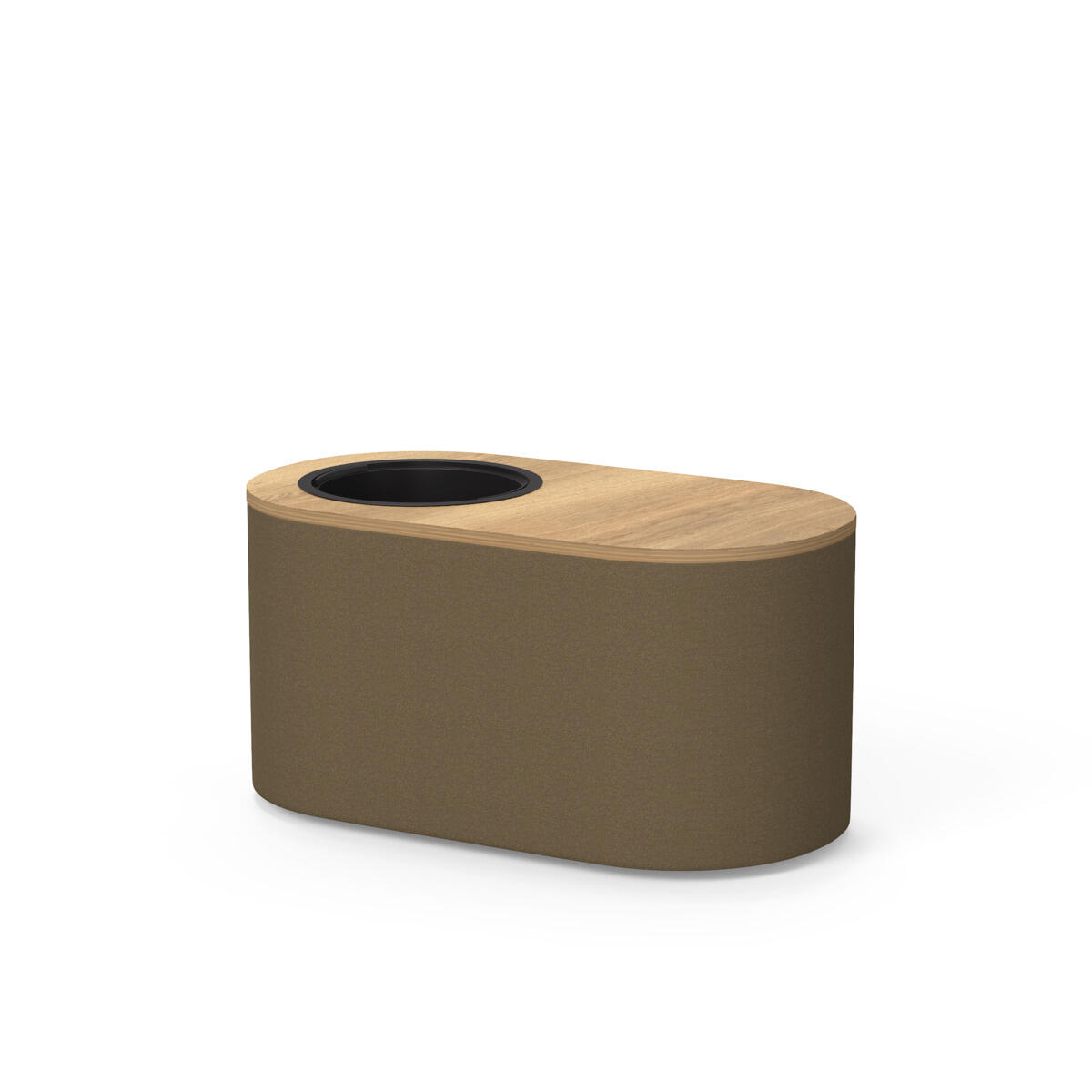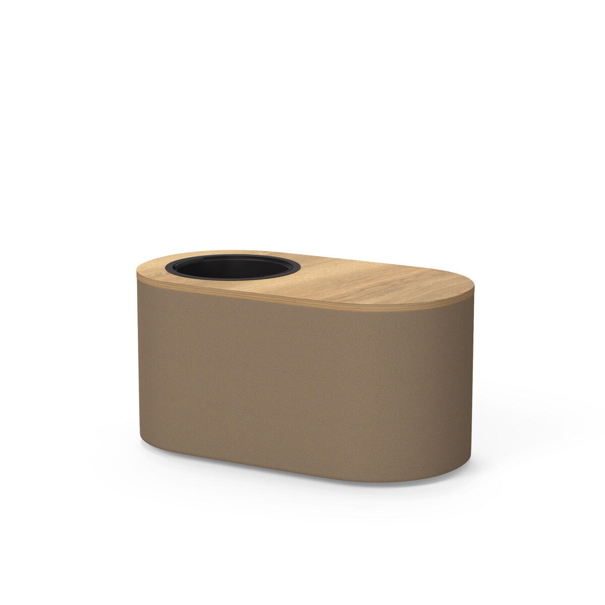 Sittpuffen är försedd med fast sidobord. Bordsskiva i laminat. Stativ i pulverlackad metall. Sittpuffen har trästomme och stoppning i kallskum. Försedd med glidfötter.