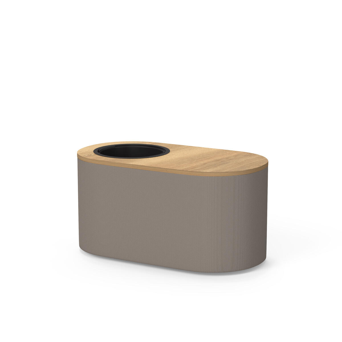 Textilklädd blomlåda. Plastinsatsen är utrustad med infällbara handtag vilket gör att du enkelt kan lyfta ut insatsen ur blomlådan. Mått plastinsats: ø 32,5xH20,5 cm. Försedd med glidfötter.