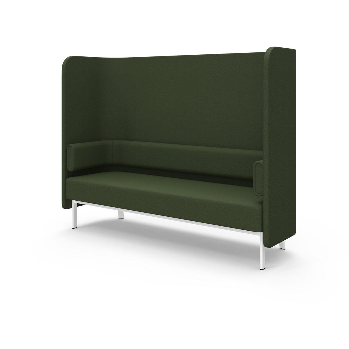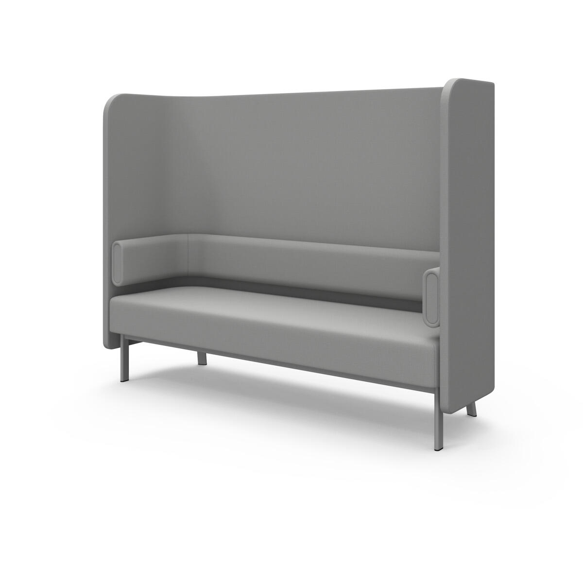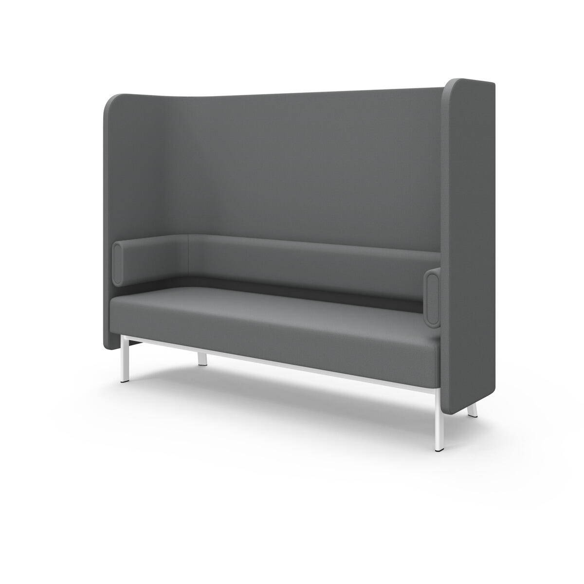 Den höga ryggen och de höga gavlarna skärmar av och dämpar ljud effektivt. Trästomme och stoppning i kallskum. Ben i pulverlackad metall. Som tillbehör finns sidobord som enkelt monteras i ramen.