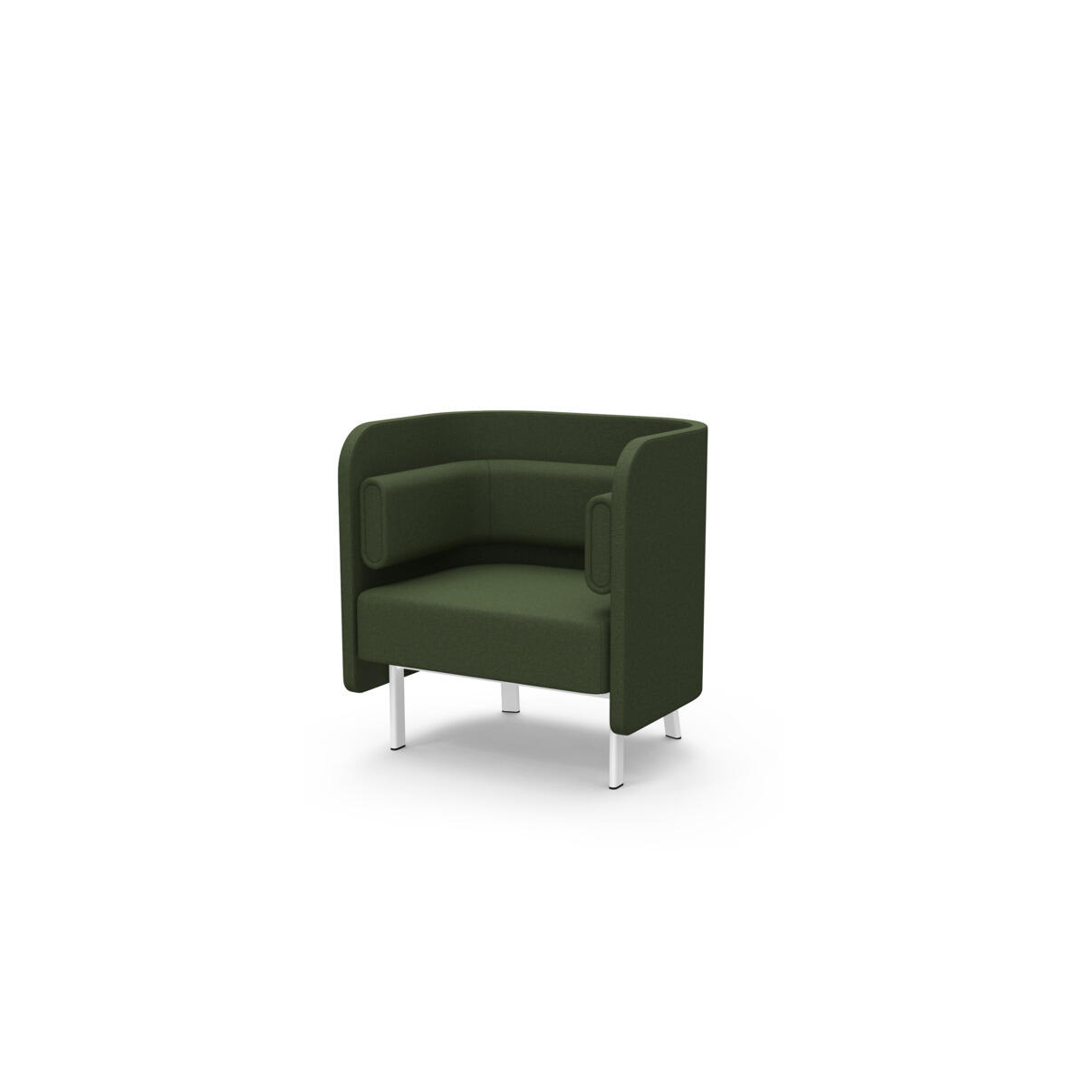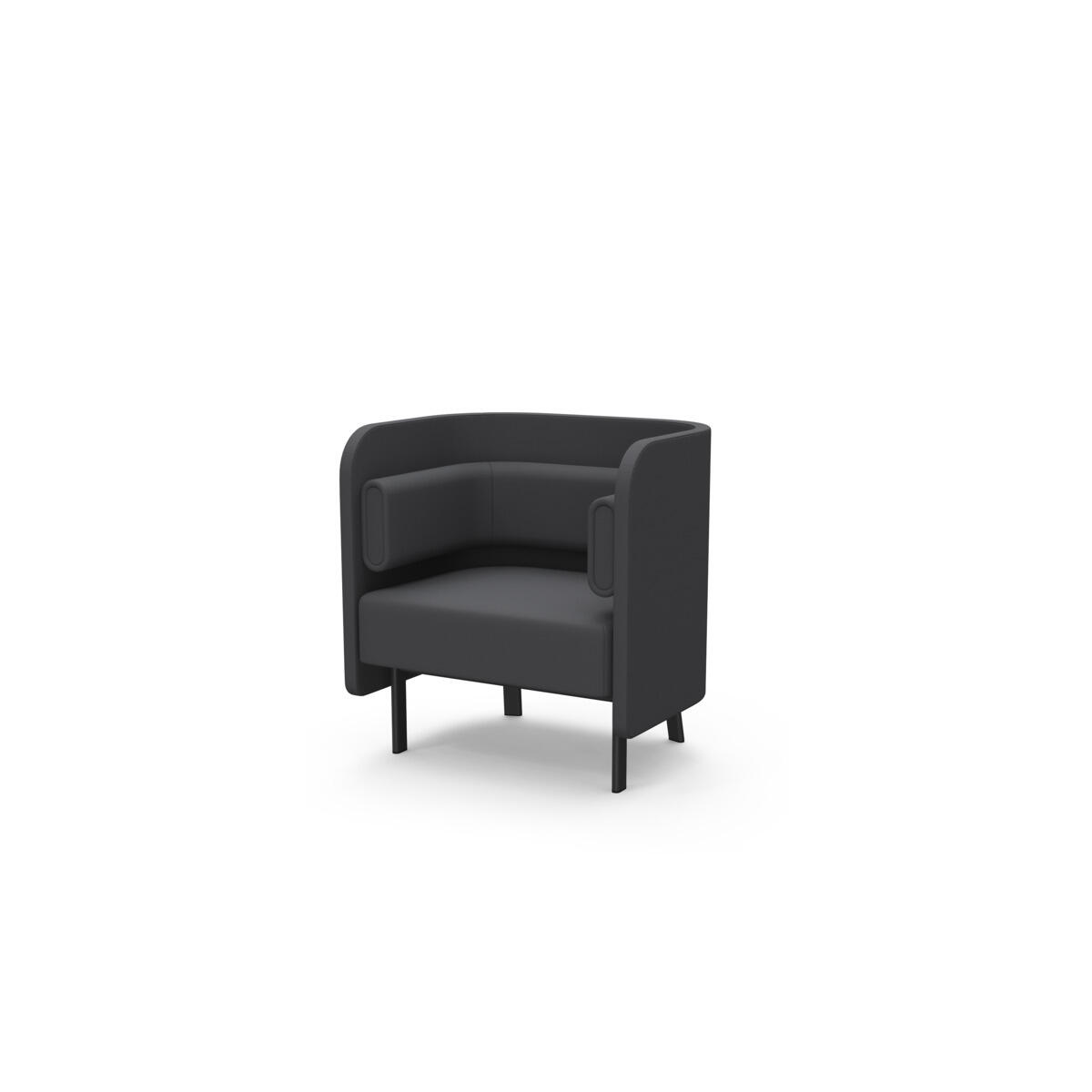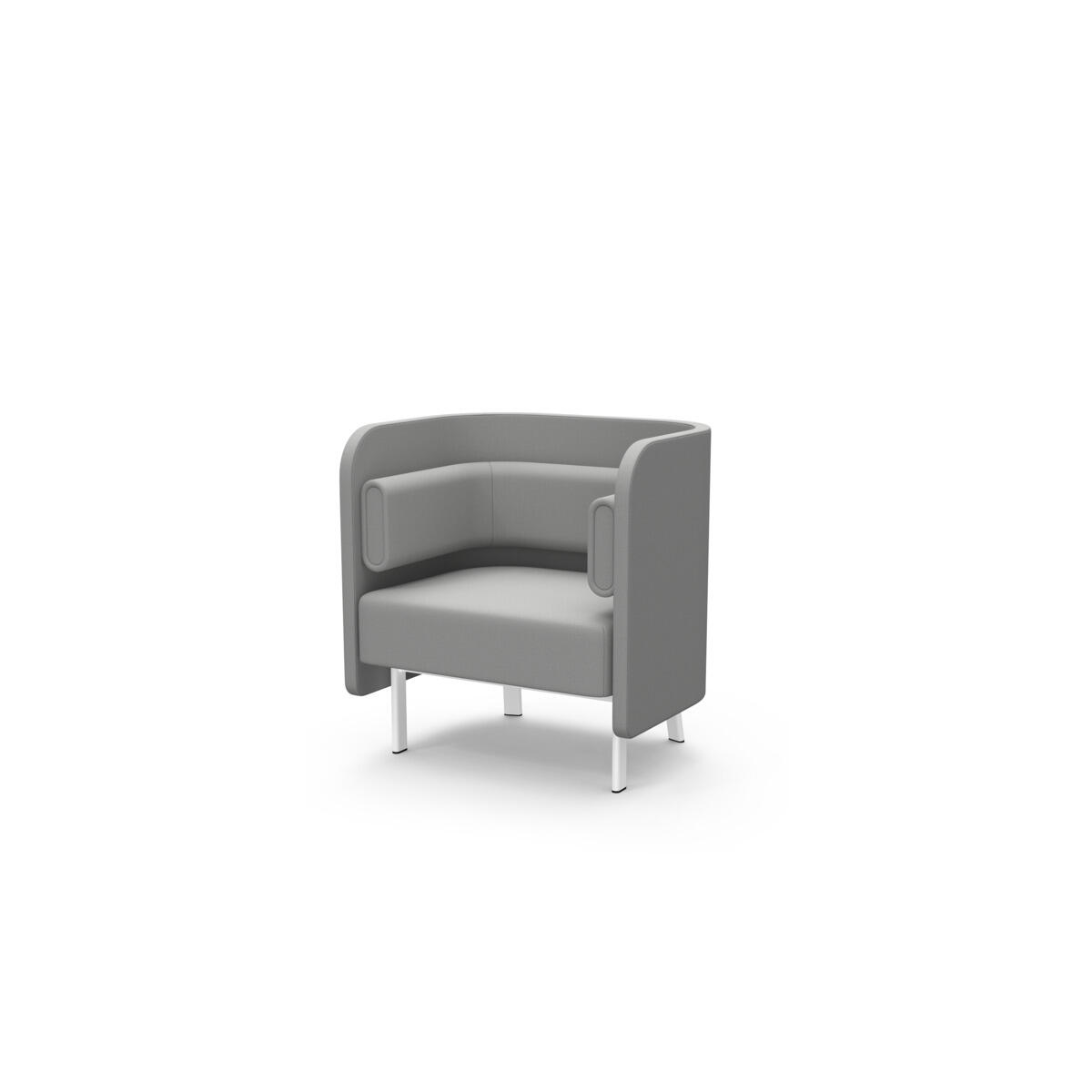 En möbel som förenar modernismens estetik med samtida behov. Omslutande soffa som tack vare sina höga sidor har en ljuddämpande och avskärmande effekt, vilket gör att den lämpar sig för exempelvis gruppmöten, samarbetsuppgifter eller egentid i en dämpad miljö. De höga väggarna ger avskildhet från resten av rummet. Bord med laminatskiva L125xD64xH74 cm, färg på bordsskiva följer färg på ben. Trästomme och stoppning i kallskum. Ben i pulverlackad metall.