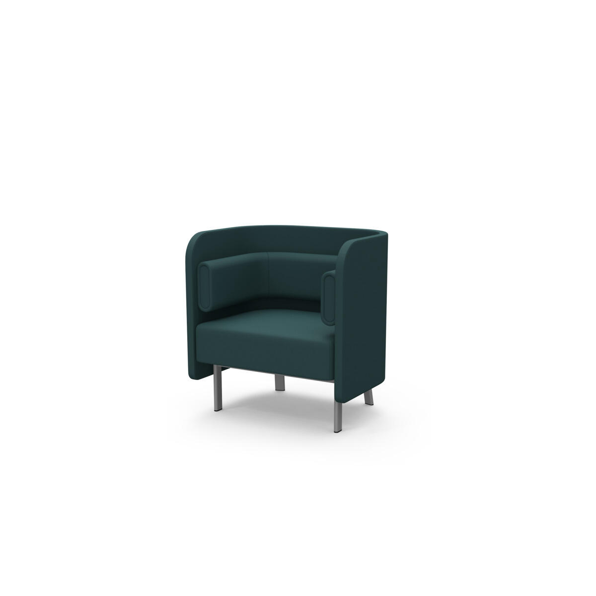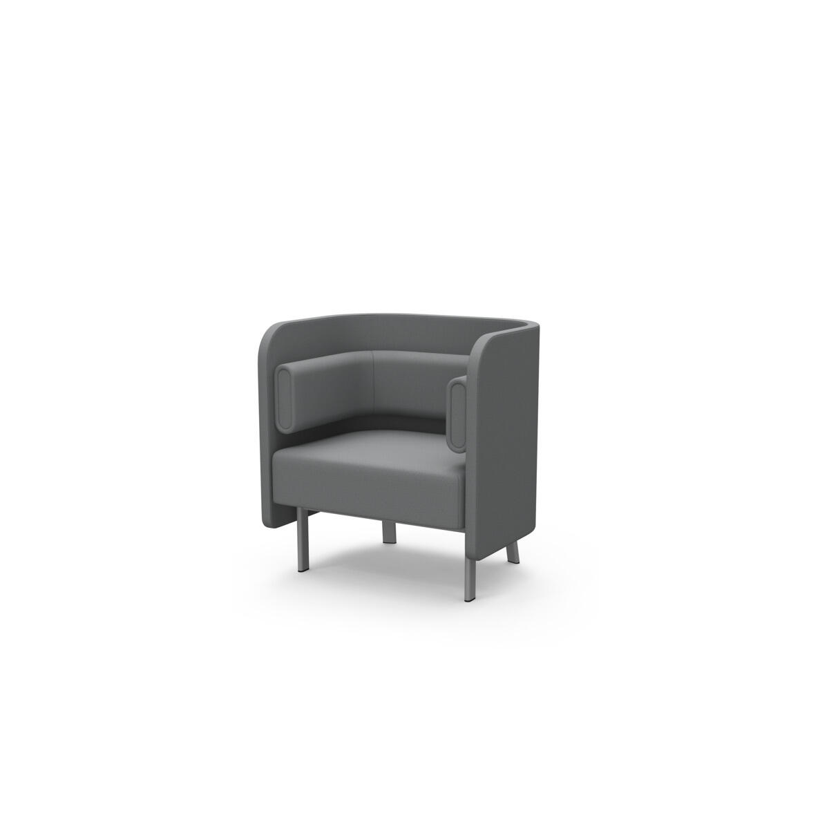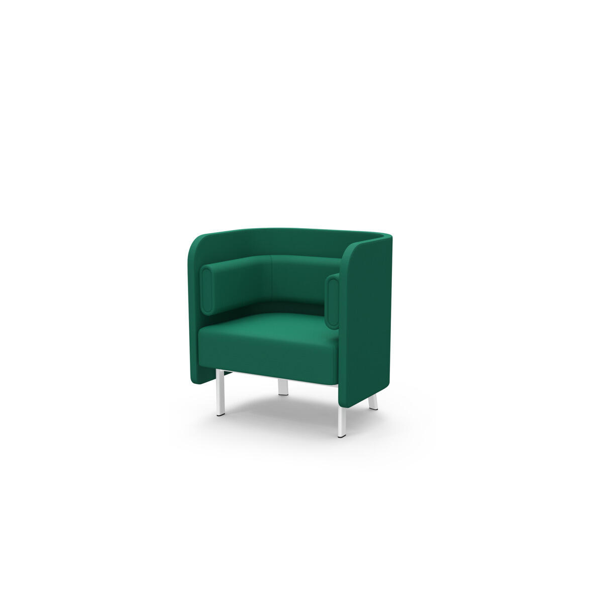 En möbel som förenar modernismens estetik med samtida behov. Omslutande soffa som tack vare sina höga sidor har en ljuddämpande och avskärmande effekt, vilket gör att den lämpar sig för exempelvis gruppmöten, samarbetsuppgifter eller egentid i en dämpad miljö. De höga väggarna ger avskildhet från resten av rummet. Bord med laminatskiva L125xD64xH74 cm, färg på bordsskiva följer färg på ben. Trästomme och stoppning i kallskum. Ben i pulverlackad metall.