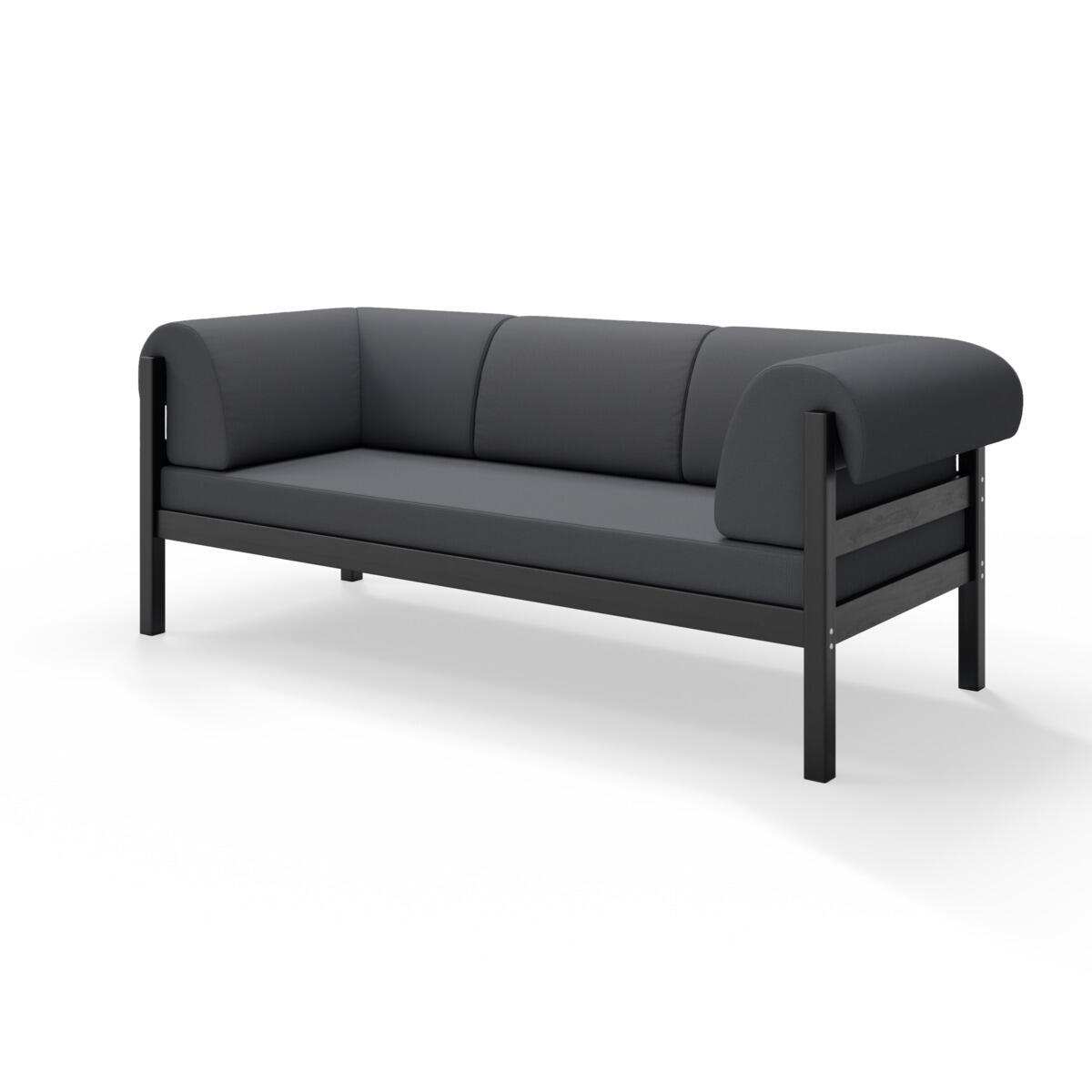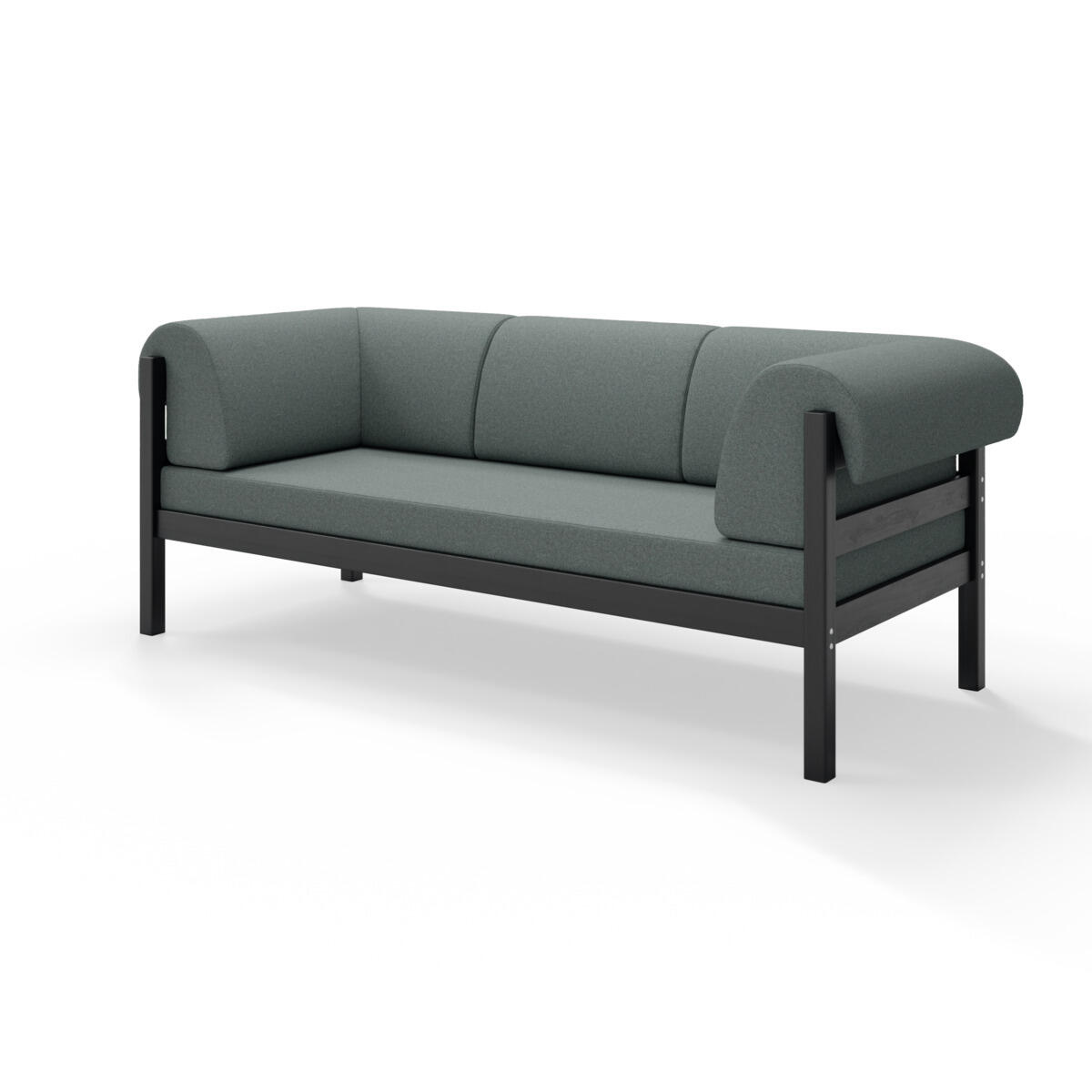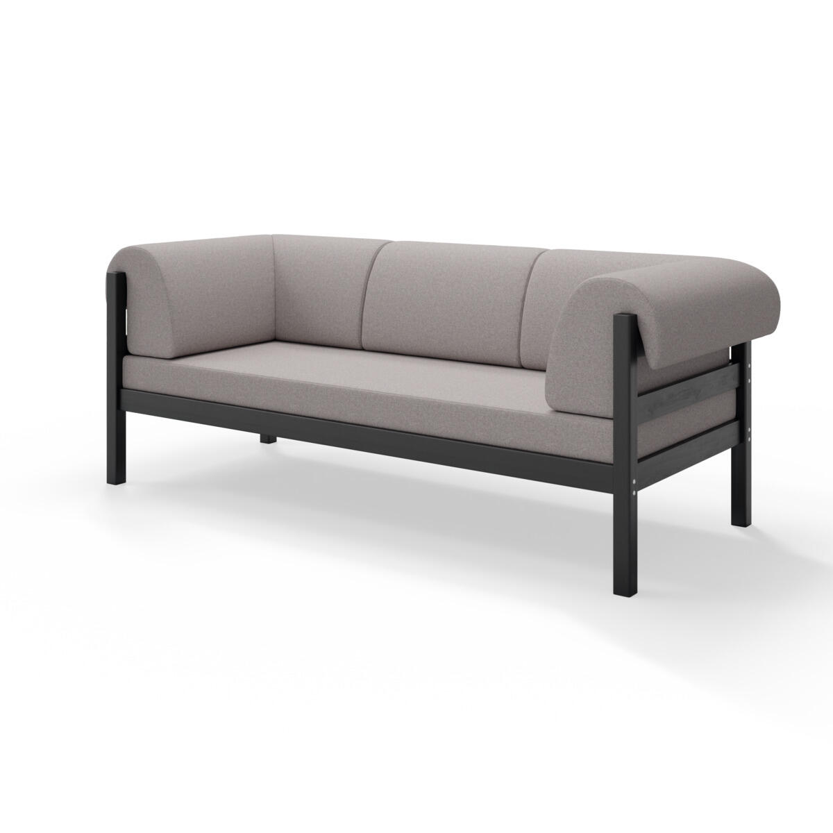 Mått: 200x82 cm. Sitthöjd 44 cm. Sittdjup 53 cm. Dynor av kallskum, med nozagbotten. Ben i svartmålad björk. Avtagbart tyg i polyester som tvättas i 30 °C.